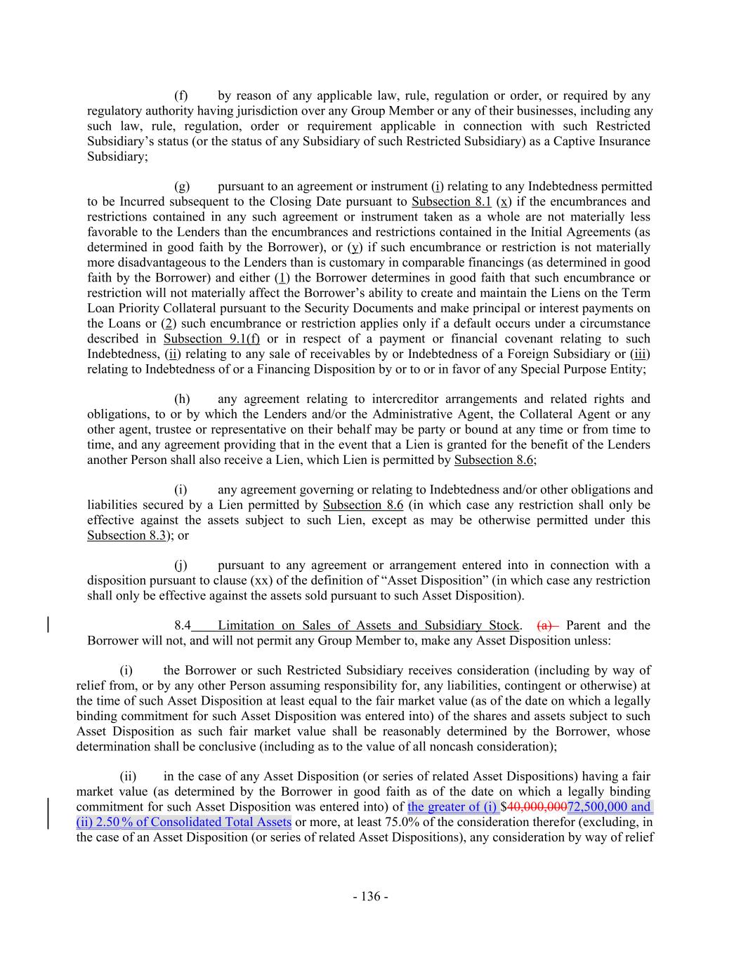 (f) by reason of any applicable law, rule, regulation or order, or required by any regulatory authority having jurisdiction over any Group Member or any of their businesses, including any such law, rule, regulation, order or requirement applicable in connection with such Restricted Subsidiary’s status (or the status of any Subsidiary of such Restricted Subsidiary) as a Captive Insurance Subsidiary; (g) pursuant to an agreement or instrument (i) relating to any Indebtedness permitted to be Incurred subsequent to the Closing Date pursuant to Subsection 8.1 (x) if the encumbrances and restrictions contained in any such agreement or instrument taken as a whole are not materially less favorable to the Lenders than the encumbrances and restrictions contained in the Initial Agreements (as determined in good faith by the Borrower), or (y) if such encumbrance or restriction is not materially more disadvantageous to the Lenders than is customary in comparable financings (as determined in good faith by the Borrower) and either (1) the Borrower determines in good faith that such encumbrance or restriction will not materially affect the Borrower’s ability to create and maintain the Liens on the Term Loan Priority Collateral pursuant to the Security Documents and make principal or interest payments on the Loans or (2) such encumbrance or restriction applies only if a default occurs under a circumstance described in Subsection 9.1(f) or in respect of a payment or financial covenant relating to such Indebtedness, (ii) relating to any sale of receivables by or Indebtedness of a Foreign Subsidiary or (iii) relating to Indebtedness of or a Financing Disposition by or to or in favor of any Special Purpose Entity; (h) any agreement relating to intercreditor arrangements and related rights and obligations, to or by which the Lenders and/or the Administrative Agent, the Collateral Agent or any other agent, trustee or representative on their behalf may be party or bound at any time or from time to time, and any agreement providing that in the event that a Lien is granted for the benefit of the Lenders another Person shall also receive a Lien, which Lien is permitted by Subsection 8.6; (i) any agreement governing or relating to Indebtedness and/or other obligations and liabilities secured by a Lien permitted by Subsection 8.6 (in which case any restriction shall only be effective against the assets subject to such Lien, except as may be otherwise permitted under this Subsection 8.3); or (j) pursuant to any agreement or arrangement entered into in connection with a disposition pursuant to clause (xx) of the definition of “Asset Disposition” (in which case any restriction shall only be effective against the assets sold pursuant to such Asset Disposition). 8.4 Limitation on Sales of Assets and Subsidiary Stock. (a) Parent and the Borrower will not, and will not permit any Group Member to, make any Asset Disposition unless: (i) the Borrower or such Restricted Subsidiary receives consideration (including by way of relief from, or by any other Person assuming responsibility for, any liabilities, contingent or otherwise) at the time of such Asset Disposition at least equal to the fair market value (as of the date on which a legally binding commitment for such Asset Disposition was entered into) of the shares and assets subject to such Asset Disposition as such fair market value shall be reasonably determined by the Borrower, whose determination shall be conclusive (including as to the value of all noncash consideration); (ii) in the case of any Asset Disposition (or series of related Asset Dispositions) having a fair market value (as determined by the Borrower in good faith as of the date on which a legally binding commitment for such Asset Disposition was entered into) of the greater of (i) $40,000,00072,500,000 and (ii) 2.50 % of Consolidated Total Assets or more, at least 75.0% of the consideration therefor (excluding, in the case of an Asset Disposition (or series of related Asset Dispositions), any consideration by way of relief - 136 -