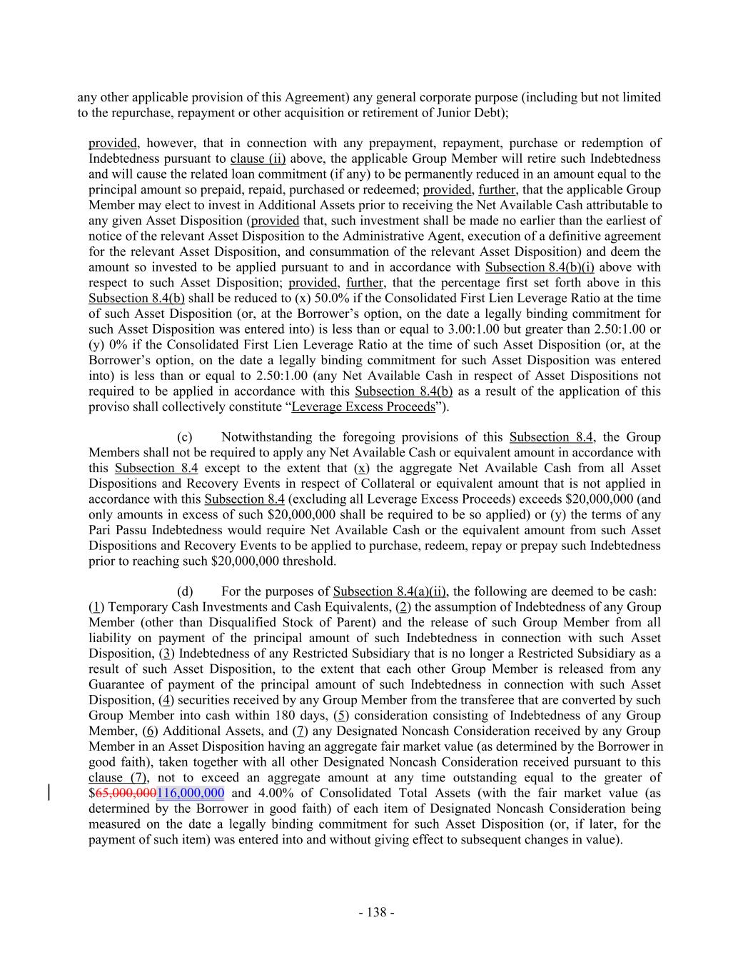 any other applicable provision of this Agreement) any general corporate purpose (including but not limited to the repurchase, repayment or other acquisition or retirement of Junior Debt); provided, however, that in connection with any prepayment, repayment, purchase or redemption of Indebtedness pursuant to clause (ii) above, the applicable Group Member will retire such Indebtedness and will cause the related loan commitment (if any) to be permanently reduced in an amount equal to the principal amount so prepaid, repaid, purchased or redeemed; provided, further, that the applicable Group Member may elect to invest in Additional Assets prior to receiving the Net Available Cash attributable to any given Asset Disposition (provided that, such investment shall be made no earlier than the earliest of notice of the relevant Asset Disposition to the Administrative Agent, execution of a definitive agreement for the relevant Asset Disposition, and consummation of the relevant Asset Disposition) and deem the amount so invested to be applied pursuant to and in accordance with Subsection 8.4(b)(i) above with respect to such Asset Disposition; provided, further, that the percentage first set forth above in this Subsection 8.4(b) shall be reduced to (x) 50.0% if the Consolidated First Lien Leverage Ratio at the time of such Asset Disposition (or, at the Borrower’s option, on the date a legally binding commitment for such Asset Disposition was entered into) is less than or equal to 3.00:1.00 but greater than 2.50:1.00 or (y) 0% if the Consolidated First Lien Leverage Ratio at the time of such Asset Disposition (or, at the Borrower’s option, on the date a legally binding commitment for such Asset Disposition was entered into) is less than or equal to 2.50:1.00 (any Net Available Cash in respect of Asset Dispositions not required to be applied in accordance with this Subsection 8.4(b) as a result of the application of this proviso shall collectively constitute “Leverage Excess Proceeds”). (c) Notwithstanding the foregoing provisions of this Subsection 8.4, the Group Members shall not be required to apply any Net Available Cash or equivalent amount in accordance with this Subsection 8.4 except to the extent that (x) the aggregate Net Available Cash from all Asset Dispositions and Recovery Events in respect of Collateral or equivalent amount that is not applied in accordance with this Subsection 8.4 (excluding all Leverage Excess Proceeds) exceeds $20,000,000 (and only amounts in excess of such $20,000,000 shall be required to be so applied) or (y) the terms of any Pari Passu Indebtedness would require Net Available Cash or the equivalent amount from such Asset Dispositions and Recovery Events to be applied to purchase, redeem, repay or prepay such Indebtedness prior to reaching such $20,000,000 threshold. (d) For the purposes of Subsection 8.4(a)(ii), the following are deemed to be cash: (1) Temporary Cash Investments and Cash Equivalents, (2) the assumption of Indebtedness of any Group Member (other than Disqualified Stock of Parent) and the release of such Group Member from all liability on payment of the principal amount of such Indebtedness in connection with such Asset Disposition, (3) Indebtedness of any Restricted Subsidiary that is no longer a Restricted Subsidiary as a result of such Asset Disposition, to the extent that each other Group Member is released from any Guarantee of payment of the principal amount of such Indebtedness in connection with such Asset Disposition, (4) securities received by any Group Member from the transferee that are converted by such Group Member into cash within 180 days, (5) consideration consisting of Indebtedness of any Group Member, (6) Additional Assets, and (7) any Designated Noncash Consideration received by any Group Member in an Asset Disposition having an aggregate fair market value (as determined by the Borrower in good faith), taken together with all other Designated Noncash Consideration received pursuant to this clause (7), not to exceed an aggregate amount at any time outstanding equal to the greater of $65,000,000116,000,000 and 4.00% of Consolidated Total Assets (with the fair market value (as determined by the Borrower in good faith) of each item of Designated Noncash Consideration being measured on the date a legally binding commitment for such Asset Disposition (or, if later, for the payment of such item) was entered into and without giving effect to subsequent changes in value). - 138 -