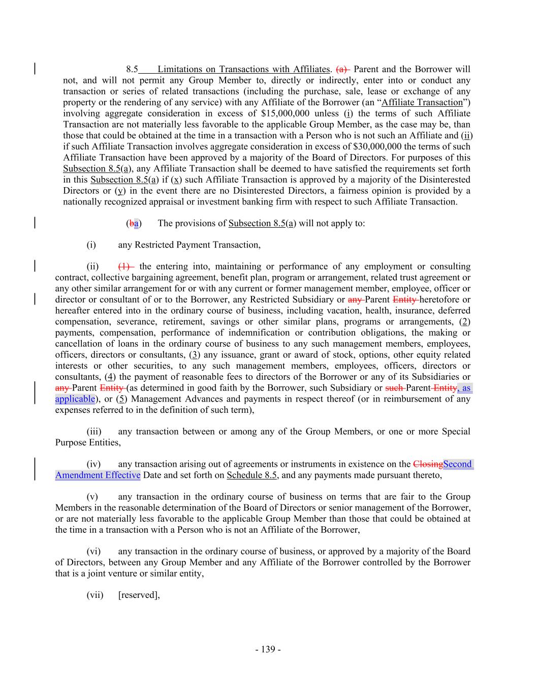 8.5 Limitations on Transactions with Affiliates. (a) Parent and the Borrower will not, and will not permit any Group Member to, directly or indirectly, enter into or conduct any transaction or series of related transactions (including the purchase, sale, lease or exchange of any property or the rendering of any service) with any Affiliate of the Borrower (an “Affiliate Transaction”) involving aggregate consideration in excess of $15,000,000 unless (i) the terms of such Affiliate Transaction are not materially less favorable to the applicable Group Member, as the case may be, than those that could be obtained at the time in a transaction with a Person who is not such an Affiliate and (ii) if such Affiliate Transaction involves aggregate consideration in excess of $30,000,000 the terms of such Affiliate Transaction have been approved by a majority of the Board of Directors. For purposes of this Subsection 8.5(a), any Affiliate Transaction shall be deemed to have satisfied the requirements set forth in this Subsection 8.5(a) if (x) such Affiliate Transaction is approved by a majority of the Disinterested Directors or (y) in the event there are no Disinterested Directors, a fairness opinion is provided by a nationally recognized appraisal or investment banking firm with respect to such Affiliate Transaction. (ba) The provisions of Subsection 8.5(a) will not apply to: (i) any Restricted Payment Transaction, (ii) (1) the entering into, maintaining or performance of any employment or consulting contract, collective bargaining agreement, benefit plan, program or arrangement, related trust agreement or any other similar arrangement for or with any current or former management member, employee, officer or director or consultant of or to the Borrower, any Restricted Subsidiary or any Parent Entity heretofore or hereafter entered into in the ordinary course of business, including vacation, health, insurance, deferred compensation, severance, retirement, savings or other similar plans, programs or arrangements, (2) payments, compensation, performance of indemnification or contribution obligations, the making or cancellation of loans in the ordinary course of business to any such management members, employees, officers, directors or consultants, (3) any issuance, grant or award of stock, options, other equity related interests or other securities, to any such management members, employees, officers, directors or consultants, (4) the payment of reasonable fees to directors of the Borrower or any of its Subsidiaries or any Parent Entity (as determined in good faith by the Borrower, such Subsidiary or such Parent Entity, as applicable), or (5) Management Advances and payments in respect thereof (or in reimbursement of any expenses referred to in the definition of such term), (iii) any transaction between or among any of the Group Members, or one or more Special Purpose Entities, (iv) any transaction arising out of agreements or instruments in existence on the ClosingSecond Amendment Effective Date and set forth on Schedule 8.5, and any payments made pursuant thereto, (v) any transaction in the ordinary course of business on terms that are fair to the Group Members in the reasonable determination of the Board of Directors or senior management of the Borrower, or are not materially less favorable to the applicable Group Member than those that could be obtained at the time in a transaction with a Person who is not an Affiliate of the Borrower, (vi) any transaction in the ordinary course of business, or approved by a majority of the Board of Directors, between any Group Member and any Affiliate of the Borrower controlled by the Borrower that is a joint venture or similar entity, (vii) [reserved], - 139 -