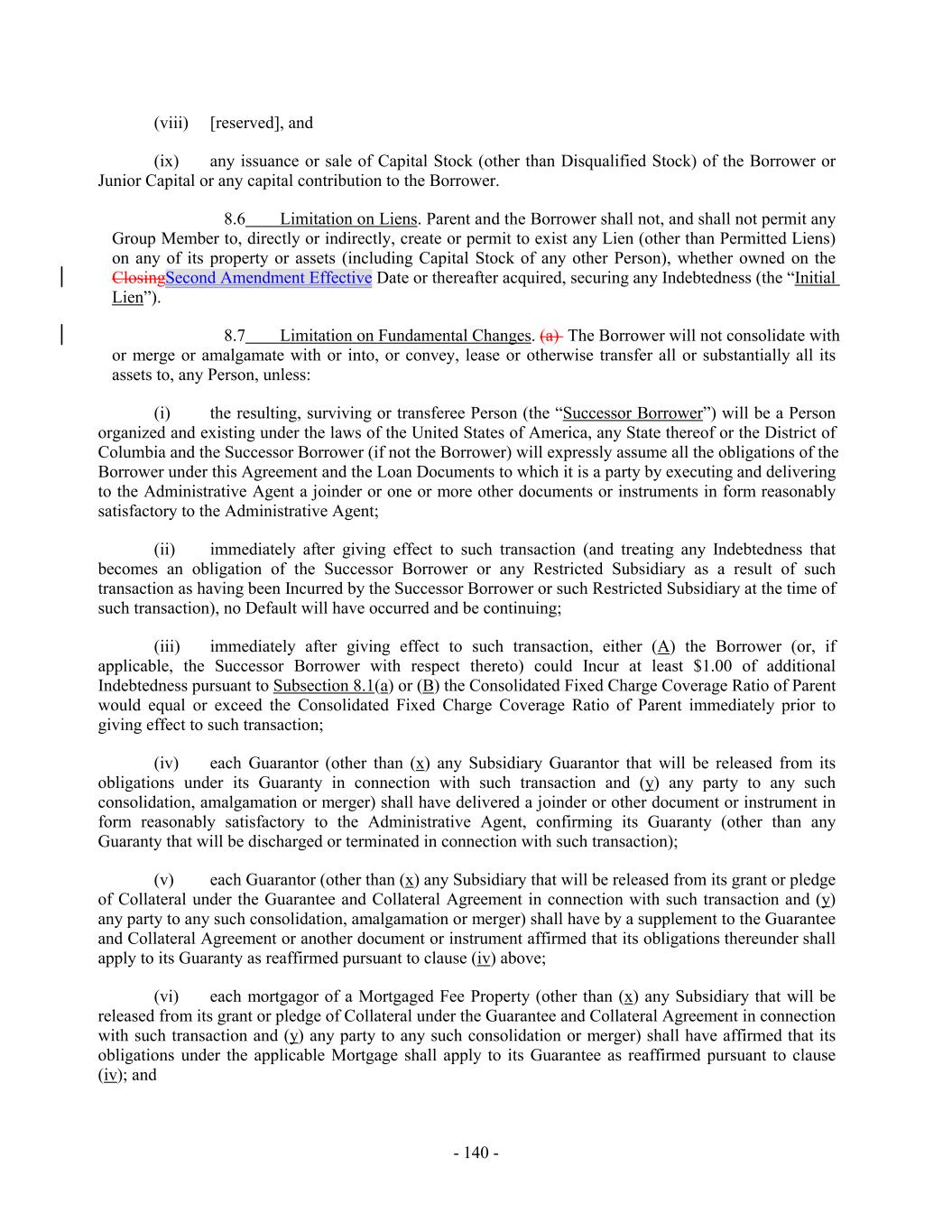 (viii) [reserved], and (ix) any issuance or sale of Capital Stock (other than Disqualified Stock) of the Borrower or Junior Capital or any capital contribution to the Borrower. 8.6 Limitation on Liens. Parent and the Borrower shall not, and shall not permit any Group Member to, directly or indirectly, create or permit to exist any Lien (other than Permitted Liens) on any of its property or assets (including Capital Stock of any other Person), whether owned on the ClosingSecond Amendment Effective Date or thereafter acquired, securing any Indebtedness (the “Initial Lien”). 8.7 Limitation on Fundamental Changes. (a) The Borrower will not consolidate with or merge or amalgamate with or into, or convey, lease or otherwise transfer all or substantially all its assets to, any Person, unless: (i) the resulting, surviving or transferee Person (the “Successor Borrower”) will be a Person organized and existing under the laws of the United States of America, any State thereof or the District of Columbia and the Successor Borrower (if not the Borrower) will expressly assume all the obligations of the Borrower under this Agreement and the Loan Documents to which it is a party by executing and delivering to the Administrative Agent a joinder or one or more other documents or instruments in form reasonably satisfactory to the Administrative Agent; (ii) immediately after giving effect to such transaction (and treating any Indebtedness that becomes an obligation of the Successor Borrower or any Restricted Subsidiary as a result of such transaction as having been Incurred by the Successor Borrower or such Restricted Subsidiary at the time of such transaction), no Default will have occurred and be continuing; (iii) immediately after giving effect to such transaction, either (A) the Borrower (or, if applicable, the Successor Borrower with respect thereto) could Incur at least $1.00 of additional Indebtedness pursuant to Subsection 8.1(a) or (B) the Consolidated Fixed Charge Coverage Ratio of Parent would equal or exceed the Consolidated Fixed Charge Coverage Ratio of Parent immediately prior to giving effect to such transaction; (iv) each Guarantor (other than (x) any Subsidiary Guarantor that will be released from its obligations under its Guaranty in connection with such transaction and (y) any party to any such consolidation, amalgamation or merger) shall have delivered a joinder or other document or instrument in form reasonably satisfactory to the Administrative Agent, confirming its Guaranty (other than any Guaranty that will be discharged or terminated in connection with such transaction); (v) each Guarantor (other than (x) any Subsidiary that will be released from its grant or pledge of Collateral under the Guarantee and Collateral Agreement in connection with such transaction and (y) any party to any such consolidation, amalgamation or merger) shall have by a supplement to the Guarantee and Collateral Agreement or another document or instrument affirmed that its obligations thereunder shall apply to its Guaranty as reaffirmed pursuant to clause (iv) above; (vi) each mortgagor of a Mortgaged Fee Property (other than (x) any Subsidiary that will be released from its grant or pledge of Collateral under the Guarantee and Collateral Agreement in connection with such transaction and (y) any party to any such consolidation or merger) shall have affirmed that its obligations under the applicable Mortgage shall apply to its Guarantee as reaffirmed pursuant to clause (iv); and - 140 -