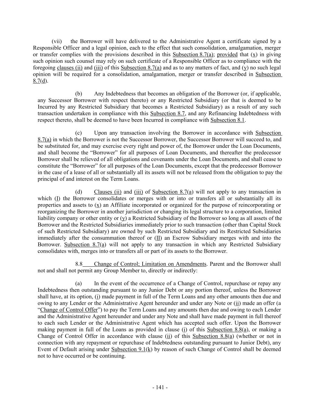 (vii) the Borrower will have delivered to the Administrative Agent a certificate signed by a Responsible Officer and a legal opinion, each to the effect that such consolidation, amalgamation, merger or transfer complies with the provisions described in this Subsection 8.7(a); provided that (x) in giving such opinion such counsel may rely on such certificate of a Responsible Officer as to compliance with the foregoing clauses (ii) and (iii) of this Subsection 8.7(a) and as to any matters of fact, and (y) no such legal opinion will be required for a consolidation, amalgamation, merger or transfer described in Subsection 8.7(d). (b) Any Indebtedness that becomes an obligation of the Borrower (or, if applicable, any Successor Borrower with respect thereto) or any Restricted Subsidiary (or that is deemed to be Incurred by any Restricted Subsidiary that becomes a Restricted Subsidiary) as a result of any such transaction undertaken in compliance with this Subsection 8.7, and any Refinancing Indebtedness with respect thereto, shall be deemed to have been Incurred in compliance with Subsection 8.1. (c) Upon any transaction involving the Borrower in accordance with Subsection 8.7(a) in which the Borrower is not the Successor Borrower, the Successor Borrower will succeed to, and be substituted for, and may exercise every right and power of, the Borrower under the Loan Documents, and shall become the “Borrower” for all purposes of Loan Documents, and thereafter the predecessor Borrower shall be relieved of all obligations and covenants under the Loan Documents, and shall cease to constitute the “Borrower” for all purposes of the Loan Documents, except that the predecessor Borrower in the case of a lease of all or substantially all its assets will not be released from the obligation to pay the principal of and interest on the Term Loans. (d) Clauses (ii) and (iii) of Subsection 8.7(a) will not apply to any transaction in which (I) the Borrower consolidates or merges with or into or transfers all or substantially all its properties and assets to (x) an Affiliate incorporated or organized for the purpose of reincorporating or reorganizing the Borrower in another jurisdiction or changing its legal structure to a corporation, limited liability company or other entity or (y) a Restricted Subsidiary of the Borrower so long as all assets of the Borrower and the Restricted Subsidiaries immediately prior to such transaction (other than Capital Stock of such Restricted Subsidiary) are owned by such Restricted Subsidiary and its Restricted Subsidiaries immediately after the consummation thereof or (II) an Escrow Subsidiary merges with and into the Borrower. Subsection 8.7(a) will not apply to any transaction in which any Restricted Subsidiary consolidates with, merges into or transfers all or part of its assets to the Borrower. 8.8 Change of Control; Limitation on Amendments. Parent and the Borrower shall not and shall not permit any Group Member to, directly or indirectly: (a) In the event of the occurrence of a Change of Control, repurchase or repay any Indebtedness then outstanding pursuant to any Junior Debt or any portion thereof, unless the Borrower shall have, at its option, (i) made payment in full of the Term Loans and any other amounts then due and owing to any Lender or the Administrative Agent hereunder and under any Note or (ii) made an offer (a “Change of Control Offer”) to pay the Term Loans and any amounts then due and owing to each Lender and the Administrative Agent hereunder and under any Note and shall have made payment in full thereof to each such Lender or the Administrative Agent which has accepted such offer. Upon the Borrower making payment in full of the Loans as provided in clause (i) of this Subsection 8.8(a), or making a Change of Control Offer in accordance with clause (ii) of this Subsection 8.8(a) (whether or not in connection with any repayment or repurchase of Indebtedness outstanding pursuant to Junior Debt), any Event of Default arising under Subsection 9.1(k) by reason of such Change of Control shall be deemed not to have occurred or be continuing. - 141 -