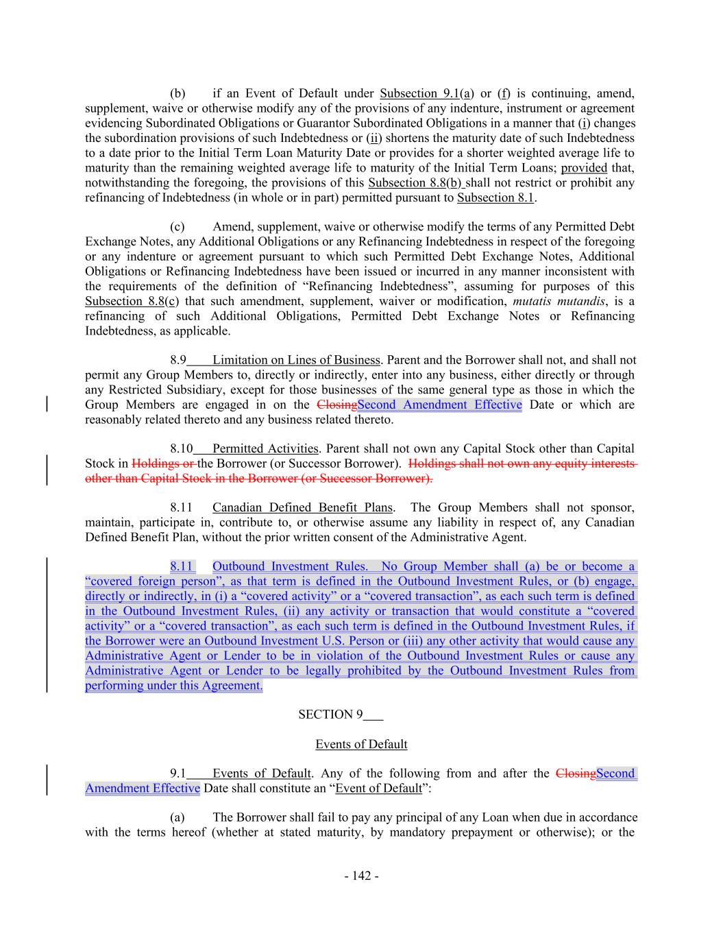 (b) if an Event of Default under Subsection 9.1(a) or (f) is continuing, amend, supplement, waive or otherwise modify any of the provisions of any indenture, instrument or agreement evidencing Subordinated Obligations or Guarantor Subordinated Obligations in a manner that (i) changes the subordination provisions of such Indebtedness or (ii) shortens the maturity date of such Indebtedness to a date prior to the Initial Term Loan Maturity Date or provides for a shorter weighted average life to maturity than the remaining weighted average life to maturity of the Initial Term Loans; provided that, notwithstanding the foregoing, the provisions of this Subsection 8.8(b) shall not restrict or prohibit any refinancing of Indebtedness (in whole or in part) permitted pursuant to Subsection 8.1. (c) Amend, supplement, waive or otherwise modify the terms of any Permitted Debt Exchange Notes, any Additional Obligations or any Refinancing Indebtedness in respect of the foregoing or any indenture or agreement pursuant to which such Permitted Debt Exchange Notes, Additional Obligations or Refinancing Indebtedness have been issued or incurred in any manner inconsistent with the requirements of the definition of “Refinancing Indebtedness”, assuming for purposes of this Subsection 8.8(c) that such amendment, supplement, waiver or modification, mutatis mutandis, is a refinancing of such Additional Obligations, Permitted Debt Exchange Notes or Refinancing Indebtedness, as applicable. 8.9 Limitation on Lines of Business. Parent and the Borrower shall not, and shall not permit any Group Members to, directly or indirectly, enter into any business, either directly or through any Restricted Subsidiary, except for those businesses of the same general type as those in which the Group Members are engaged in on the ClosingSecond Amendment Effective Date or which are reasonably related thereto and any business related thereto. 8.10 Permitted Activities. Parent shall not own any Capital Stock other than Capital Stock in Holdings or the Borrower (or Successor Borrower). Holdings shall not own any equity interests other than Capital Stock in the Borrower (or Successor Borrower). 8.11 Canadian Defined Benefit Plans. The Group Members shall not sponsor, maintain, participate in, contribute to, or otherwise assume any liability in respect of, any Canadian Defined Benefit Plan, without the prior written consent of the Administrative Agent. 8.11 Outbound Investment Rules. No Group Member shall (a) be or become a “covered foreign person”, as that term is defined in the Outbound Investment Rules, or (b) engage, directly or indirectly, in (i) a “covered activity” or a “covered transaction”, as each such term is defined in the Outbound Investment Rules, (ii) any activity or transaction that would constitute a “covered activity” or a “covered transaction”, as each such term is defined in the Outbound Investment Rules, if the Borrower were an Outbound Investment U.S. Person or (iii) any other activity that would cause any Administrative Agent or Lender to be in violation of the Outbound Investment Rules or cause any Administrative Agent or Lender to be legally prohibited by the Outbound Investment Rules from performing under this Agreement. SECTION 9 Events of Default 9.1 Events of Default. Any of the following from and after the ClosingSecond Amendment Effective Date shall constitute an “Event of Default”: (a) The Borrower shall fail to pay any principal of any Loan when due in accordance with the terms hereof (whether at stated maturity, by mandatory prepayment or otherwise); or the - 142 -