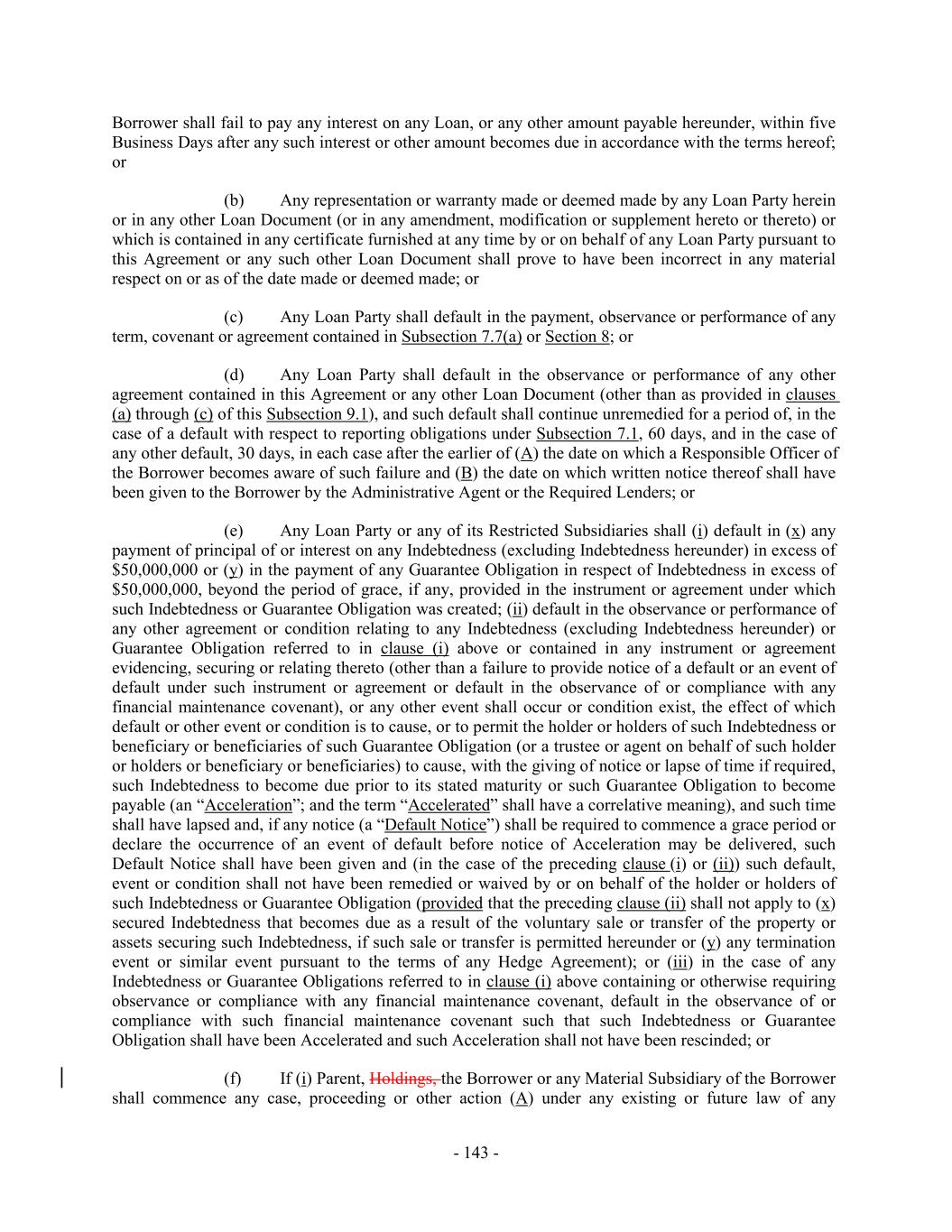 Borrower shall fail to pay any interest on any Loan, or any other amount payable hereunder, within five Business Days after any such interest or other amount becomes due in accordance with the terms hereof; or (b) Any representation or warranty made or deemed made by any Loan Party herein or in any other Loan Document (or in any amendment, modification or supplement hereto or thereto) or which is contained in any certificate furnished at any time by or on behalf of any Loan Party pursuant to this Agreement or any such other Loan Document shall prove to have been incorrect in any material respect on or as of the date made or deemed made; or (c) Any Loan Party shall default in the payment, observance or performance of any term, covenant or agreement contained in Subsection 7.7(a) or Section 8; or (d) Any Loan Party shall default in the observance or performance of any other agreement contained in this Agreement or any other Loan Document (other than as provided in clauses (a) through (c) of this Subsection 9.1), and such default shall continue unremedied for a period of, in the case of a default with respect to reporting obligations under Subsection 7.1, 60 days, and in the case of any other default, 30 days, in each case after the earlier of (A) the date on which a Responsible Officer of the Borrower becomes aware of such failure and (B) the date on which written notice thereof shall have been given to the Borrower by the Administrative Agent or the Required Lenders; or (e) Any Loan Party or any of its Restricted Subsidiaries shall (i) default in (x) any payment of principal of or interest on any Indebtedness (excluding Indebtedness hereunder) in excess of $50,000,000 or (y) in the payment of any Guarantee Obligation in respect of Indebtedness in excess of $50,000,000, beyond the period of grace, if any, provided in the instrument or agreement under which such Indebtedness or Guarantee Obligation was created; (ii) default in the observance or performance of any other agreement or condition relating to any Indebtedness (excluding Indebtedness hereunder) or Guarantee Obligation referred to in clause (i) above or contained in any instrument or agreement evidencing, securing or relating thereto (other than a failure to provide notice of a default or an event of default under such instrument or agreement or default in the observance of or compliance with any financial maintenance covenant), or any other event shall occur or condition exist, the effect of which default or other event or condition is to cause, or to permit the holder or holders of such Indebtedness or beneficiary or beneficiaries of such Guarantee Obligation (or a trustee or agent on behalf of such holder or holders or beneficiary or beneficiaries) to cause, with the giving of notice or lapse of time if required, such Indebtedness to become due prior to its stated maturity or such Guarantee Obligation to become payable (an “Acceleration”; and the term “Accelerated” shall have a correlative meaning), and such time shall have lapsed and, if any notice (a “Default Notice”) shall be required to commence a grace period or declare the occurrence of an event of default before notice of Acceleration may be delivered, such Default Notice shall have been given and (in the case of the preceding clause (i) or (ii)) such default, event or condition shall not have been remedied or waived by or on behalf of the holder or holders of such Indebtedness or Guarantee Obligation (provided that the preceding clause (ii) shall not apply to (x) secured Indebtedness that becomes due as a result of the voluntary sale or transfer of the property or assets securing such Indebtedness, if such sale or transfer is permitted hereunder or (y) any termination event or similar event pursuant to the terms of any Hedge Agreement); or (iii) in the case of any Indebtedness or Guarantee Obligations referred to in clause (i) above containing or otherwise requiring observance or compliance with any financial maintenance covenant, default in the observance of or compliance with such financial maintenance covenant such that such Indebtedness or Guarantee Obligation shall have been Accelerated and such Acceleration shall not have been rescinded; or (f) If (i) Parent, Holdings, the Borrower or any Material Subsidiary of the Borrower shall commence any case, proceeding or other action (A) under any existing or future law of any - 143 -