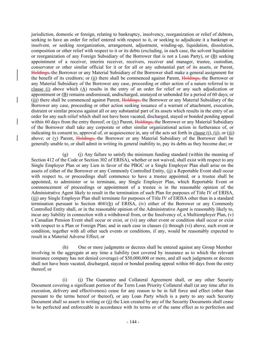 jurisdiction, domestic or foreign, relating to bankruptcy, insolvency, reorganization or relief of debtors, seeking to have an order for relief entered with respect to it, or seeking to adjudicate it a bankrupt or insolvent, or seeking reorganization, arrangement, adjustment, winding-up, liquidation, dissolution, composition or other relief with respect to it or its debts (excluding, in each case, the solvent liquidation or reorganization of any Foreign Subsidiary of the Borrower that is not a Loan Party), or (B) seeking appointment of a receiver, interim receiver, receivers, receiver and manager, trustee, custodian, conservator or other similar official for it or for all or any substantial part of its assets, or Parent, Holdings, the Borrower or any Material Subsidiary of the Borrower shall make a general assignment for the benefit of its creditors; or (ii) there shall be commenced against Parent, Holdings, the Borrower or any Material Subsidiary of the Borrower any case, proceeding or other action of a nature referred to in clause (i) above which (A) results in the entry of an order for relief or any such adjudication or appointment or (B) remains undismissed, undischarged, unstayed or unbonded for a period of 60 days; or (iii) there shall be commenced against Parent, Holdings, the Borrower or any Material Subsidiary of the Borrower any case, proceeding or other action seeking issuance of a warrant of attachment, execution, distraint or similar process against all or any substantial part of its assets which results in the entry of an order for any such relief which shall not have been vacated, discharged, stayed or bonded pending appeal within 60 days from the entry thereof; or (iv) Parent, Holdings, the Borrower or any Material Subsidiary of the Borrower shall take any corporate or other similar organizational action in furtherance of, or indicating its consent to, approval of, or acquiescence in, any of the acts set forth in clause (i), (ii), or (iii) above; or (v) Parent, Holdings, the Borrower or any Material Subsidiary of the Borrower shall be generally unable to, or shall admit in writing its general inability to, pay its debts as they become due; or (g) (i) Any failure to satisfy the minimum funding standard (within the meaning of Section 412 of the Code or Section 302 of ERISA), whether or not waived, shall exist with respect to any Single Employer Plan or any Lien in favor of the PBGC or a Single Employer Plan shall arise on the assets of either of the Borrower or any Commonly Controlled Entity, (ii) a Reportable Event shall occur with respect to, or proceedings shall commence to have a trustee appointed, or a trustee shall be appointed, to administer or to terminate, any Single Employer Plan, which Reportable Event or commencement of proceedings or appointment of a trustee is in the reasonable opinion of the Administrative Agent likely to result in the termination of such Plan for purposes of Title IV of ERISA, (iii) any Single Employer Plan shall terminate for purposes of Title IV of ERISA other than in a standard termination pursuant to Section 4041(b) of ERISA, (iv) either of the Borrower or any Commonly Controlled Entity shall, or in the reasonable opinion of the Administrative Agent is reasonably likely to, incur any liability in connection with a withdrawal from, or the Insolvency of, a Multiemployer Plan, (v) a Canadian Pension Event shall occur or exist, or (vi) any other event or condition shall occur or exist with respect to a Plan or Foreign Plan; and in each case in clauses (i) through (vi) above, such event or condition, together with all other such events or conditions, if any, would be reasonably expected to result in a Material Adverse Effect; or (h) One or more judgments or decrees shall be entered against any Group Member involving in the aggregate at any time a liability (not covered by insurance as to which the relevant insurance company has not denied coverage) of $50,000,000 or more, and all such judgments or decrees shall not have been vacated, discharged, stayed or bonded pending appeal within 60 days from the entry thereof; or (i) (i) The Guarantee and Collateral Agreement shall, or any other Security Document covering a significant portion of the Term Loan Priority Collateral shall (at any time after its execution, delivery and effectiveness) cease for any reason to be in full force and effect (other than pursuant to the terms hereof or thereof), or any Loan Party which is a party to any such Security Document shall so assert in writing or (ii) the Lien created by any of the Security Documents shall cease to be perfected and enforceable in accordance with its terms or of the same effect as to perfection and - 144 -