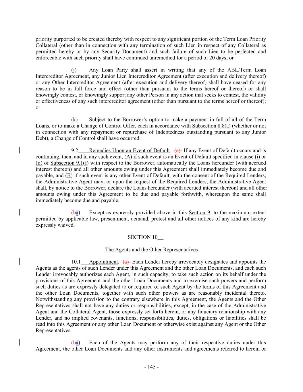 priority purported to be created thereby with respect to any significant portion of the Term Loan Priority Collateral (other than in connection with any termination of such Lien in respect of any Collateral as permitted hereby or by any Security Document) and such failure of such Lien to be perfected and enforceable with such priority shall have continued unremedied for a period of 20 days; or (j) Any Loan Party shall assert in writing that any of the ABL/Term Loan Intercreditor Agreement, any Junior Lien Intercreditor Agreement (after execution and delivery thereof) or any Other Intercreditor Agreement (after execution and delivery thereof) shall have ceased for any reason to be in full force and effect (other than pursuant to the terms hereof or thereof) or shall knowingly contest, or knowingly support any other Person in any action that seeks to contest, the validity or effectiveness of any such intercreditor agreement (other than pursuant to the terms hereof or thereof); or (k) Subject to the Borrower’s option to make a payment in full of all of the Term Loans, or to make a Change of Control Offer, each in accordance with Subsection 8.8(a) (whether or not in connection with any repayment or repurchase of Indebtedness outstanding pursuant to any Junior Debt), a Change of Control shall have occurred. 9.2 Remedies Upon an Event of Default. (a) If any Event of Default occurs and is continuing, then, and in any such event, (A) if such event is an Event of Default specified in clause (i) or (ii) of Subsection 9.1(f) with respect to the Borrower, automatically the Loans hereunder (with accrued interest thereon) and all other amounts owing under this Agreement shall immediately become due and payable, and (B) if such event is any other Event of Default, with the consent of the Required Lenders, the Administrative Agent may, or upon the request of the Required Lenders, the Administrative Agent shall, by notice to the Borrower, declare the Loans hereunder (with accrued interest thereon) and all other amounts owing under this Agreement to be due and payable forthwith, whereupon the same shall immediately become due and payable. (ba) Except as expressly provided above in this Section 9, to the maximum extent permitted by applicable law, presentment, demand, protest and all other notices of any kind are hereby expressly waived. SECTION 10 The Agents and the Other Representatives 10.1 Appointment. (a) Each Lender hereby irrevocably designates and appoints the Agents as the agents of such Lender under this Agreement and the other Loan Documents, and each such Lender irrevocably authorizes each Agent, in such capacity, to take such action on its behalf under the provisions of this Agreement and the other Loan Documents and to exercise such powers and perform such duties as are expressly delegated to or required of such Agent by the terms of this Agreement and the other Loan Documents, together with such other powers as are reasonably incidental thereto. Notwithstanding any provision to the contrary elsewhere in this Agreement, the Agents and the Other Representatives shall not have any duties or responsibilities, except, in the case of the Administrative Agent and the Collateral Agent, those expressly set forth herein, or any fiduciary relationship with any Lender, and no implied covenants, functions, responsibilities, duties, obligations or liabilities shall be read into this Agreement or any other Loan Document or otherwise exist against any Agent or the Other Representatives. (ba) Each of the Agents may perform any of their respective duties under this Agreement, the other Loan Documents and any other instruments and agreements referred to herein or - 145 -