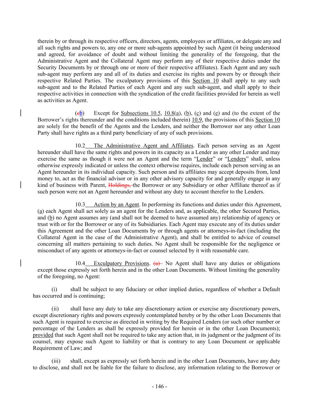 therein by or through its respective officers, directors, agents, employees or affiliates, or delegate any and all such rights and powers to, any one or more sub-agents appointed by such Agent (it being understood and agreed, for avoidance of doubt and without limiting the generality of the foregoing, that the Administrative Agent and the Collateral Agent may perform any of their respective duties under the Security Documents by or through one or more of their respective affiliates). Each Agent and any such sub-agent may perform any and all of its duties and exercise its rights and powers by or through their respective Related Parties. The exculpatory provisions of this Section 10 shall apply to any such sub-agent and to the Related Parties of each Agent and any such sub-agent, and shall apply to their respective activities in connection with the syndication of the credit facilities provided for herein as well as activities as Agent. (cb) Except for Subsections 10.5, 10.8(a), (b), (c) and (e) and (to the extent of the Borrower’s rights thereunder and the conditions included therein) 10.9, the provisions of this Section 10 are solely for the benefit of the Agents and the Lenders, and neither the Borrower nor any other Loan Party shall have rights as a third party beneficiary of any of such provisions. 10.2 The Administrative Agent and Affiliates. Each person serving as an Agent hereunder shall have the same rights and powers in its capacity as a Lender as any other Lender and may exercise the same as though it were not an Agent and the term “Lender” or “Lenders” shall, unless otherwise expressly indicated or unless the context otherwise requires, include each person serving as an Agent hereunder in its individual capacity. Such person and its affiliates may accept deposits from, lend money to, act as the financial advisor or in any other advisory capacity for and generally engage in any kind of business with Parent, Holdings, the Borrower or any Subsidiary or other Affiliate thereof as if such person were not an Agent hereunder and without any duty to account therefor to the Lenders. 10.3 Action by an Agent. In performing its functions and duties under this Agreement, (a) each Agent shall act solely as an agent for the Lenders and, as applicable, the other Secured Parties, and (b) no Agent assumes any (and shall not be deemed to have assumed any) relationship of agency or trust with or for the Borrower or any of its Subsidiaries. Each Agent may execute any of its duties under this Agreement and the other Loan Documents by or through agents or attorneys-in-fact (including the Collateral Agent in the case of the Administrative Agent), and shall be entitled to advice of counsel concerning all matters pertaining to such duties. No Agent shall be responsible for the negligence or misconduct of any agents or attorneys-in-fact or counsel selected by it with reasonable care. 10.4 Exculpatory Provisions. (a) No Agent shall have any duties or obligations except those expressly set forth herein and in the other Loan Documents. Without limiting the generality of the foregoing, no Agent: (i) shall be subject to any fiduciary or other implied duties, regardless of whether a Default has occurred and is continuing; (ii) shall have any duty to take any discretionary action or exercise any discretionary powers, except discretionary rights and powers expressly contemplated hereby or by the other Loan Documents that such Agent is required to exercise as directed in writing by the Required Lenders (or such other number or percentage of the Lenders as shall be expressly provided for herein or in the other Loan Documents); provided that such Agent shall not be required to take any action that, in its judgment or the judgment of its counsel, may expose such Agent to liability or that is contrary to any Loan Document or applicable Requirement of Law; and (iii) shall, except as expressly set forth herein and in the other Loan Documents, have any duty to disclose, and shall not be liable for the failure to disclose, any information relating to the Borrower or - 146 -