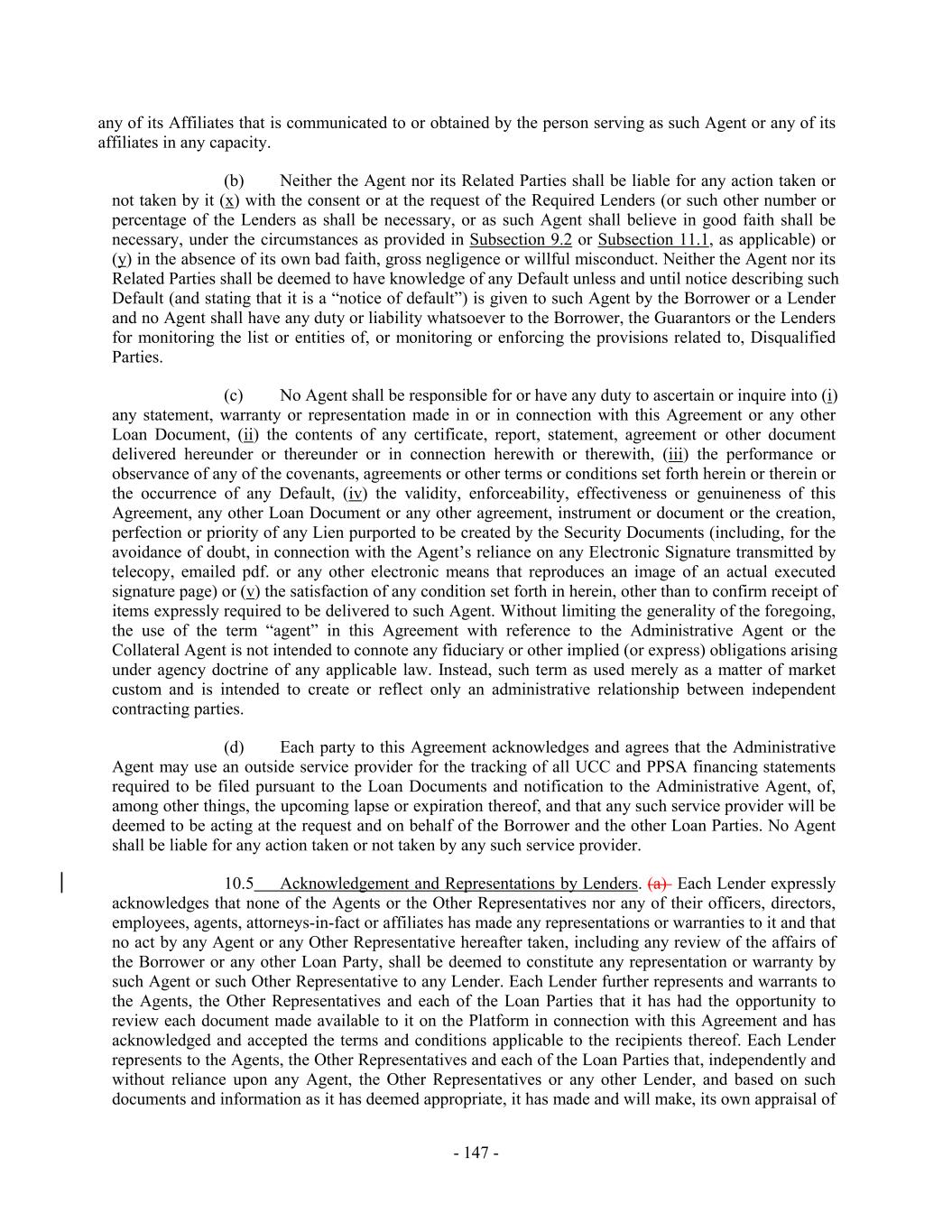 any of its Affiliates that is communicated to or obtained by the person serving as such Agent or any of its affiliates in any capacity. (b) Neither the Agent nor its Related Parties shall be liable for any action taken or not taken by it (x) with the consent or at the request of the Required Lenders (or such other number or percentage of the Lenders as shall be necessary, or as such Agent shall believe in good faith shall be necessary, under the circumstances as provided in Subsection 9.2 or Subsection 11.1, as applicable) or (y) in the absence of its own bad faith, gross negligence or willful misconduct. Neither the Agent nor its Related Parties shall be deemed to have knowledge of any Default unless and until notice describing such Default (and stating that it is a “notice of default”) is given to such Agent by the Borrower or a Lender and no Agent shall have any duty or liability whatsoever to the Borrower, the Guarantors or the Lenders for monitoring the list or entities of, or monitoring or enforcing the provisions related to, Disqualified Parties. (c) No Agent shall be responsible for or have any duty to ascertain or inquire into (i) any statement, warranty or representation made in or in connection with this Agreement or any other Loan Document, (ii) the contents of any certificate, report, statement, agreement or other document delivered hereunder or thereunder or in connection herewith or therewith, (iii) the performance or observance of any of the covenants, agreements or other terms or conditions set forth herein or therein or the occurrence of any Default, (iv) the validity, enforceability, effectiveness or genuineness of this Agreement, any other Loan Document or any other agreement, instrument or document or the creation, perfection or priority of any Lien purported to be created by the Security Documents (including, for the avoidance of doubt, in connection with the Agent’s reliance on any Electronic Signature transmitted by telecopy, emailed pdf. or any other electronic means that reproduces an image of an actual executed signature page) or (v) the satisfaction of any condition set forth in herein, other than to confirm receipt of items expressly required to be delivered to such Agent. Without limiting the generality of the foregoing, the use of the term “agent” in this Agreement with reference to the Administrative Agent or the Collateral Agent is not intended to connote any fiduciary or other implied (or express) obligations arising under agency doctrine of any applicable law. Instead, such term as used merely as a matter of market custom and is intended to create or reflect only an administrative relationship between independent contracting parties. (d) Each party to this Agreement acknowledges and agrees that the Administrative Agent may use an outside service provider for the tracking of all UCC and PPSA financing statements required to be filed pursuant to the Loan Documents and notification to the Administrative Agent, of, among other things, the upcoming lapse or expiration thereof, and that any such service provider will be deemed to be acting at the request and on behalf of the Borrower and the other Loan Parties. No Agent shall be liable for any action taken or not taken by any such service provider. 10.5 Acknowledgement and Representations by Lenders. (a) Each Lender expressly acknowledges that none of the Agents or the Other Representatives nor any of their officers, directors, employees, agents, attorneys-in-fact or affiliates has made any representations or warranties to it and that no act by any Agent or any Other Representative hereafter taken, including any review of the affairs of the Borrower or any other Loan Party, shall be deemed to constitute any representation or warranty by such Agent or such Other Representative to any Lender. Each Lender further represents and warrants to the Agents, the Other Representatives and each of the Loan Parties that it has had the opportunity to review each document made available to it on the Platform in connection with this Agreement and has acknowledged and accepted the terms and conditions applicable to the recipients thereof. Each Lender represents to the Agents, the Other Representatives and each of the Loan Parties that, independently and without reliance upon any Agent, the Other Representatives or any other Lender, and based on such documents and information as it has deemed appropriate, it has made and will make, its own appraisal of - 147 -