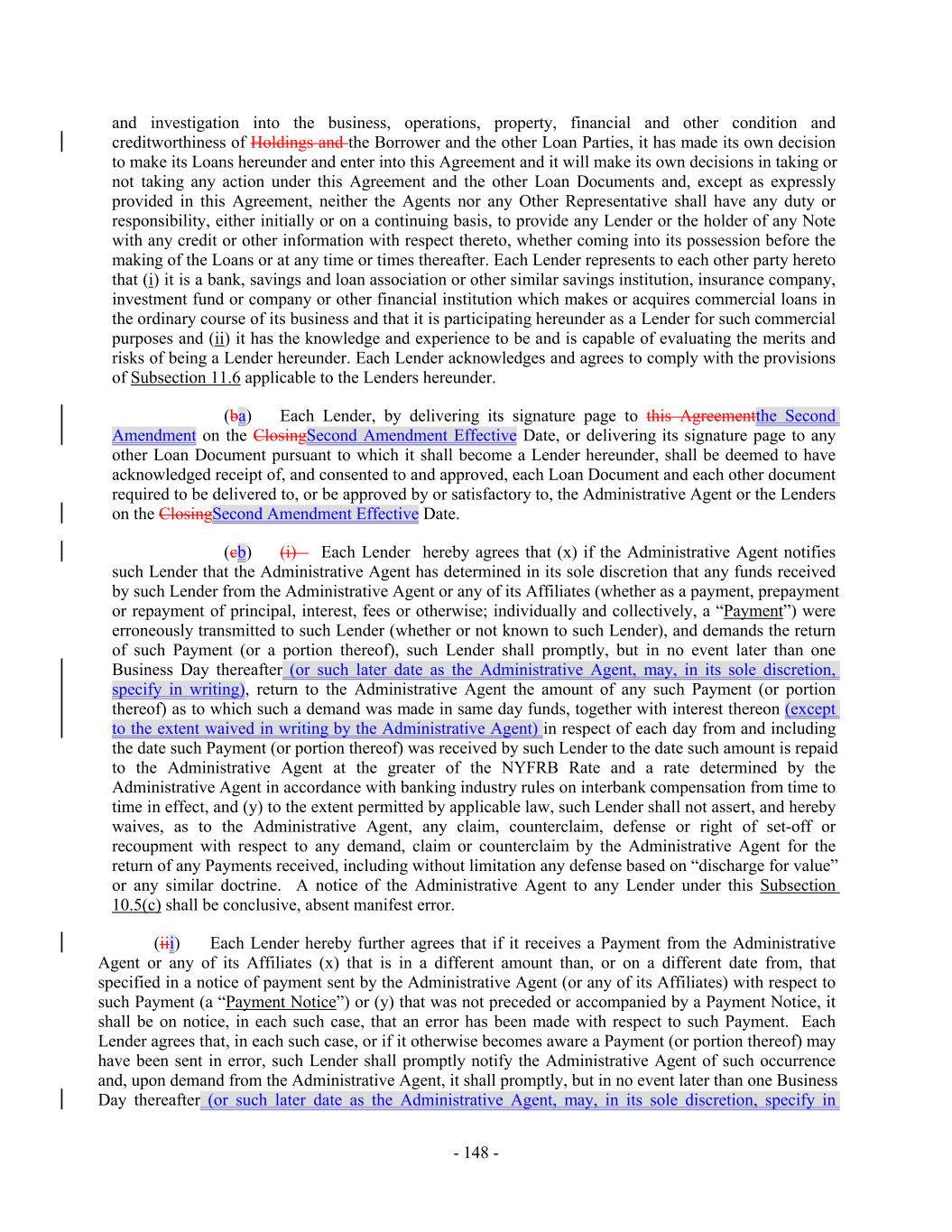 and investigation into the business, operations, property, financial and other condition and creditworthiness of Holdings and the Borrower and the other Loan Parties, it has made its own decision to make its Loans hereunder and enter into this Agreement and it will make its own decisions in taking or not taking any action under this Agreement and the other Loan Documents and, except as expressly provided in this Agreement, neither the Agents nor any Other Representative shall have any duty or responsibility, either initially or on a continuing basis, to provide any Lender or the holder of any Note with any credit or other information with respect thereto, whether coming into its possession before the making of the Loans or at any time or times thereafter. Each Lender represents to each other party hereto that (i) it is a bank, savings and loan association or other similar savings institution, insurance company, investment fund or company or other financial institution which makes or acquires commercial loans in the ordinary course of its business and that it is participating hereunder as a Lender for such commercial purposes and (ii) it has the knowledge and experience to be and is capable of evaluating the merits and risks of being a Lender hereunder. Each Lender acknowledges and agrees to comply with the provisions of Subsection 11.6 applicable to the Lenders hereunder. (ba) Each Lender, by delivering its signature page to this Agreementthe Second Amendment on the ClosingSecond Amendment Effective Date, or delivering its signature page to any other Loan Document pursuant to which it shall become a Lender hereunder, shall be deemed to have acknowledged receipt of, and consented to and approved, each Loan Document and each other document required to be delivered to, or be approved by or satisfactory to, the Administrative Agent or the Lenders on the ClosingSecond Amendment Effective Date. (cb) (i) Each Lender hereby agrees that (x) if the Administrative Agent notifies such Lender that the Administrative Agent has determined in its sole discretion that any funds received by such Lender from the Administrative Agent or any of its Affiliates (whether as a payment, prepayment or repayment of principal, interest, fees or otherwise; individually and collectively, a “Payment”) were erroneously transmitted to such Lender (whether or not known to such Lender), and demands the return of such Payment (or a portion thereof), such Lender shall promptly, but in no event later than one Business Day thereafter (or such later date as the Administrative Agent, may, in its sole discretion, specify in writing), return to the Administrative Agent the amount of any such Payment (or portion thereof) as to which such a demand was made in same day funds, together with interest thereon (except to the extent waived in writing by the Administrative Agent) in respect of each day from and including the date such Payment (or portion thereof) was received by such Lender to the date such amount is repaid to the Administrative Agent at the greater of the NYFRB Rate and a rate determined by the Administrative Agent in accordance with banking industry rules on interbank compensation from time to time in effect, and (y) to the extent permitted by applicable law, such Lender shall not assert, and hereby waives, as to the Administrative Agent, any claim, counterclaim, defense or right of set-off or recoupment with respect to any demand, claim or counterclaim by the Administrative Agent for the return of any Payments received, including without limitation any defense based on “discharge for value” or any similar doctrine. A notice of the Administrative Agent to any Lender under this Subsection 10.5(c) shall be conclusive, absent manifest error. (iii) Each Lender hereby further agrees that if it receives a Payment from the Administrative Agent or any of its Affiliates (x) that is in a different amount than, or on a different date from, that specified in a notice of payment sent by the Administrative Agent (or any of its Affiliates) with respect to such Payment (a “Payment Notice”) or (y) that was not preceded or accompanied by a Payment Notice, it shall be on notice, in each such case, that an error has been made with respect to such Payment. Each Lender agrees that, in each such case, or if it otherwise becomes aware a Payment (or portion thereof) may have been sent in error, such Lender shall promptly notify the Administrative Agent of such occurrence and, upon demand from the Administrative Agent, it shall promptly, but in no event later than one Business Day thereafter (or such later date as the Administrative Agent, may, in its sole discretion, specify in - 148 -
