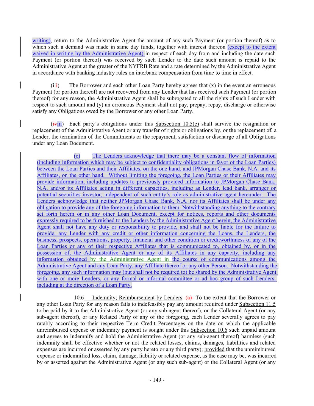 writing), return to the Administrative Agent the amount of any such Payment (or portion thereof) as to which such a demand was made in same day funds, together with interest thereon (except to the extent waived in writing by the Administrative Agent) in respect of each day from and including the date such Payment (or portion thereof) was received by such Lender to the date such amount is repaid to the Administrative Agent at the greater of the NYFRB Rate and a rate determined by the Administrative Agent in accordance with banking industry rules on interbank compensation from time to time in effect. (iii) The Borrower and each other Loan Party hereby agrees that (x) in the event an erroneous Payment (or portion thereof) are not recovered from any Lender that has received such Payment (or portion thereof) for any reason, the Administrative Agent shall be subrogated to all the rights of such Lender with respect to such amount and (y) an erroneous Payment shall not pay, prepay, repay, discharge or otherwise satisfy any Obligations owed by the Borrower or any other Loan Party. (iviii) Each party’s obligations under this Subsection 10.5(c) shall survive the resignation or replacement of the Administrative Agent or any transfer of rights or obligations by, or the replacement of, a Lender, the termination of the Commitments or the repayment, satisfaction or discharge of all Obligations under any Loan Document. (c) The Lenders acknowledge that there may be a constant flow of information (including information which may be subject to confidentiality obligations in favor of the Loan Parties) between the Loan Parties and their Affiliates, on the one hand, and JPMorgan Chase Bank, N.A. and its Affiliates, on the other hand. Without limiting the foregoing, the Loan Parties or their Affiliates may provide information, including updates to previously provided information to JPMorgan Chase Bank, N.A. and/or its Affiliates acting in different capacities, including as Lender, lead bank, arranger or potential securities investor, independent of such entity’s role as administrative agent hereunder. The Lenders acknowledge that neither JPMorgan Chase Bank, N.A. nor its Affiliates shall be under any obligation to provide any of the foregoing information to them. Notwithstanding anything to the contrary set forth herein or in any other Loan Document, except for notices, reports and other documents expressly required to be furnished to the Lenders by the Administrative Agent herein, the Administrative Agent shall not have any duty or responsibility to provide, and shall not be liable for the failure to provide, any Lender with any credit or other information concerning the Loans, the Lenders, the business, prospects, operations, property, financial and other condition or creditworthiness of any of the Loan Parties or any of their respective Affiliates that is communicated to, obtained by, or in the possession of, the Administrative Agent or any of its Affiliates in any capacity, including any information obtained by the Administrative Agent in the course of communications among the Administrative Agent and any Loan Party, any Affiliate thereof or any other Person. Notwithstanding the foregoing, any such information may (but shall not be required to) be shared by the Administrative Agent with one or more Lenders, or any formal or informal committee or ad hoc group of such Lenders, including at the direction of a Loan Party. 10.6 Indemnity; Reimbursement by Lenders. (a) To the extent that the Borrower or any other Loan Party for any reason fails to indefeasibly pay any amount required under Subsection 11.5 to be paid by it to the Administrative Agent (or any sub-agent thereof), or the Collateral Agent (or any sub-agent thereof), or any Related Party of any of the foregoing, each Lender severally agrees to pay ratably according to their respective Term Credit Percentages on the date on which the applicable unreimbursed expense or indemnity payment is sought under this Subsection 10.6 such unpaid amount and agrees to indemnify and hold the Administrative Agent (or any sub-agent thereof) harmless (such indemnity shall be effective whether or not the related losses, claims, damages, liabilities and related expenses are incurred or asserted by any party hereto or any third party); provided that the unreimbursed expense or indemnified loss, claim, damage, liability or related expense, as the case may be, was incurred by or asserted against the Administrative Agent (or any such sub-agent) or the Collateral Agent (or any - 149 -