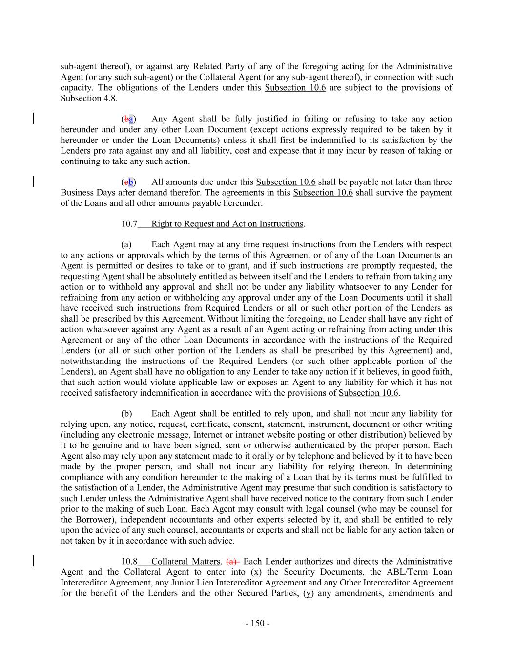 sub-agent thereof), or against any Related Party of any of the foregoing acting for the Administrative Agent (or any such sub-agent) or the Collateral Agent (or any sub-agent thereof), in connection with such capacity. The obligations of the Lenders under this Subsection 10.6 are subject to the provisions of Subsection 4.8. (ba) Any Agent shall be fully justified in failing or refusing to take any action hereunder and under any other Loan Document (except actions expressly required to be taken by it hereunder or under the Loan Documents) unless it shall first be indemnified to its satisfaction by the Lenders pro rata against any and all liability, cost and expense that it may incur by reason of taking or continuing to take any such action. (cb) All amounts due under this Subsection 10.6 shall be payable not later than three Business Days after demand therefor. The agreements in this Subsection 10.6 shall survive the payment of the Loans and all other amounts payable hereunder. 10.7 Right to Request and Act on Instructions. (a) Each Agent may at any time request instructions from the Lenders with respect to any actions or approvals which by the terms of this Agreement or of any of the Loan Documents an Agent is permitted or desires to take or to grant, and if such instructions are promptly requested, the requesting Agent shall be absolutely entitled as between itself and the Lenders to refrain from taking any action or to withhold any approval and shall not be under any liability whatsoever to any Lender for refraining from any action or withholding any approval under any of the Loan Documents until it shall have received such instructions from Required Lenders or all or such other portion of the Lenders as shall be prescribed by this Agreement. Without limiting the foregoing, no Lender shall have any right of action whatsoever against any Agent as a result of an Agent acting or refraining from acting under this Agreement or any of the other Loan Documents in accordance with the instructions of the Required Lenders (or all or such other portion of the Lenders as shall be prescribed by this Agreement) and, notwithstanding the instructions of the Required Lenders (or such other applicable portion of the Lenders), an Agent shall have no obligation to any Lender to take any action if it believes, in good faith, that such action would violate applicable law or exposes an Agent to any liability for which it has not received satisfactory indemnification in accordance with the provisions of Subsection 10.6. (b) Each Agent shall be entitled to rely upon, and shall not incur any liability for relying upon, any notice, request, certificate, consent, statement, instrument, document or other writing (including any electronic message, Internet or intranet website posting or other distribution) believed by it to be genuine and to have been signed, sent or otherwise authenticated by the proper person. Each Agent also may rely upon any statement made to it orally or by telephone and believed by it to have been made by the proper person, and shall not incur any liability for relying thereon. In determining compliance with any condition hereunder to the making of a Loan that by its terms must be fulfilled to the satisfaction of a Lender, the Administrative Agent may presume that such condition is satisfactory to such Lender unless the Administrative Agent shall have received notice to the contrary from such Lender prior to the making of such Loan. Each Agent may consult with legal counsel (who may be counsel for the Borrower), independent accountants and other experts selected by it, and shall be entitled to rely upon the advice of any such counsel, accountants or experts and shall not be liable for any action taken or not taken by it in accordance with such advice. 10.8 Collateral Matters. (a) Each Lender authorizes and directs the Administrative Agent and the Collateral Agent to enter into (x) the Security Documents, the ABL/Term Loan Intercreditor Agreement, any Junior Lien Intercreditor Agreement and any Other Intercreditor Agreement for the benefit of the Lenders and the other Secured Parties, (y) any amendments, amendments and - 150 -