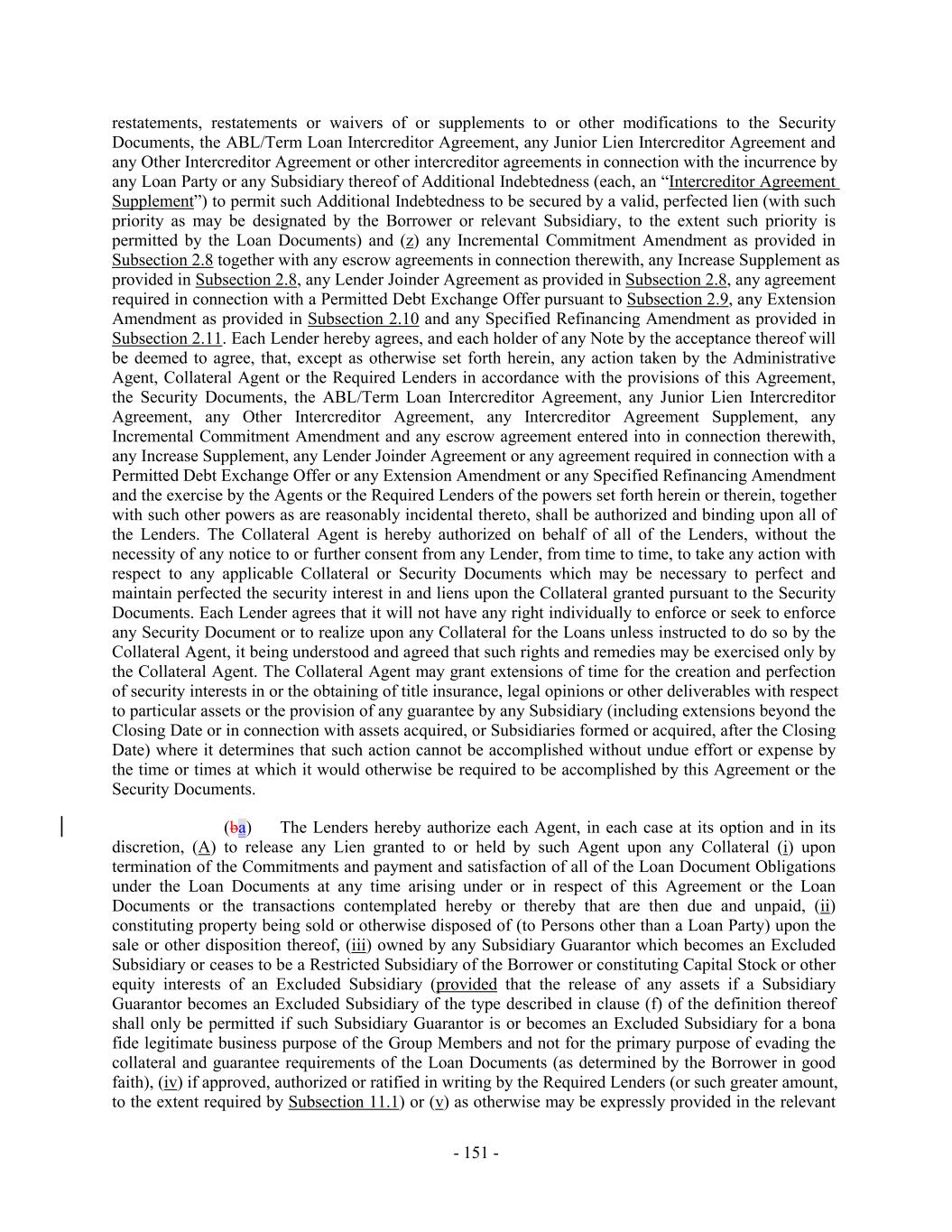 restatements, restatements or waivers of or supplements to or other modifications to the Security Documents, the ABL/Term Loan Intercreditor Agreement, any Junior Lien Intercreditor Agreement and any Other Intercreditor Agreement or other intercreditor agreements in connection with the incurrence by any Loan Party or any Subsidiary thereof of Additional Indebtedness (each, an “Intercreditor Agreement Supplement”) to permit such Additional Indebtedness to be secured by a valid, perfected lien (with such priority as may be designated by the Borrower or relevant Subsidiary, to the extent such priority is permitted by the Loan Documents) and (z) any Incremental Commitment Amendment as provided in Subsection 2.8 together with any escrow agreements in connection therewith, any Increase Supplement as provided in Subsection 2.8, any Lender Joinder Agreement as provided in Subsection 2.8, any agreement required in connection with a Permitted Debt Exchange Offer pursuant to Subsection 2.9, any Extension Amendment as provided in Subsection 2.10 and any Specified Refinancing Amendment as provided in Subsection 2.11. Each Lender hereby agrees, and each holder of any Note by the acceptance thereof will be deemed to agree, that, except as otherwise set forth herein, any action taken by the Administrative Agent, Collateral Agent or the Required Lenders in accordance with the provisions of this Agreement, the Security Documents, the ABL/Term Loan Intercreditor Agreement, any Junior Lien Intercreditor Agreement, any Other Intercreditor Agreement, any Intercreditor Agreement Supplement, any Incremental Commitment Amendment and any escrow agreement entered into in connection therewith, any Increase Supplement, any Lender Joinder Agreement or any agreement required in connection with a Permitted Debt Exchange Offer or any Extension Amendment or any Specified Refinancing Amendment and the exercise by the Agents or the Required Lenders of the powers set forth herein or therein, together with such other powers as are reasonably incidental thereto, shall be authorized and binding upon all of the Lenders. The Collateral Agent is hereby authorized on behalf of all of the Lenders, without the necessity of any notice to or further consent from any Lender, from time to time, to take any action with respect to any applicable Collateral or Security Documents which may be necessary to perfect and maintain perfected the security interest in and liens upon the Collateral granted pursuant to the Security Documents. Each Lender agrees that it will not have any right individually to enforce or seek to enforce any Security Document or to realize upon any Collateral for the Loans unless instructed to do so by the Collateral Agent, it being understood and agreed that such rights and remedies may be exercised only by the Collateral Agent. The Collateral Agent may grant extensions of time for the creation and perfection of security interests in or the obtaining of title insurance, legal opinions or other deliverables with respect to particular assets or the provision of any guarantee by any Subsidiary (including extensions beyond the Closing Date or in connection with assets acquired, or Subsidiaries formed or acquired, after the Closing Date) where it determines that such action cannot be accomplished without undue effort or expense by the time or times at which it would otherwise be required to be accomplished by this Agreement or the Security Documents. (ba) The Lenders hereby authorize each Agent, in each case at its option and in its discretion, (A) to release any Lien granted to or held by such Agent upon any Collateral (i) upon termination of the Commitments and payment and satisfaction of all of the Loan Document Obligations under the Loan Documents at any time arising under or in respect of this Agreement or the Loan Documents or the transactions contemplated hereby or thereby that are then due and unpaid, (ii) constituting property being sold or otherwise disposed of (to Persons other than a Loan Party) upon the sale or other disposition thereof, (iii) owned by any Subsidiary Guarantor which becomes an Excluded Subsidiary or ceases to be a Restricted Subsidiary of the Borrower or constituting Capital Stock or other equity interests of an Excluded Subsidiary (provided that the release of any assets if a Subsidiary Guarantor becomes an Excluded Subsidiary of the type described in clause (f) of the definition thereof shall only be permitted if such Subsidiary Guarantor is or becomes an Excluded Subsidiary for a bona fide legitimate business purpose of the Group Members and not for the primary purpose of evading the collateral and guarantee requirements of the Loan Documents (as determined by the Borrower in good faith), (iv) if approved, authorized or ratified in writing by the Required Lenders (or such greater amount, to the extent required by Subsection 11.1) or (v) as otherwise may be expressly provided in the relevant - 151 -