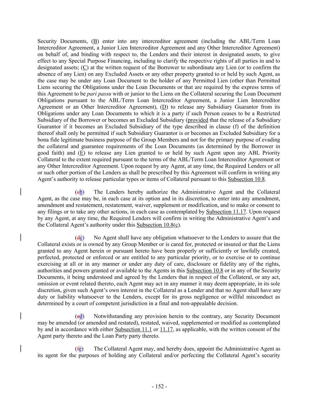 Security Documents, (B) enter into any intercreditor agreement (including the ABL/Term Loan Intercreditor Agreement, a Junior Lien Intercreditor Agreement and any Other Intercreditor Agreement) on behalf of, and binding with respect to, the Lenders and their interest in designated assets, to give effect to any Special Purpose Financing, including to clarify the respective rights of all parties in and to designated assets; (C) at the written request of the Borrower to subordinate any Lien (or to confirm the absence of any Lien) on any Excluded Assets or any other property granted to or held by such Agent, as the case may be under any Loan Document to the holder of any Permitted Lien (other than Permitted Liens securing the Obligations under the Loan Documents or that are required by the express terms of this Agreement to be pari passu with or junior to the Liens on the Collateral securing the Loan Document Obligations pursuant to the ABL/Term Loan Intercreditor Agreement, a Junior Lien Intercreditor Agreement or an Other Intercreditor Agreement), (D) to release any Subsidiary Guarantor from its Obligations under any Loan Documents to which it is a party if such Person ceases to be a Restricted Subsidiary of the Borrower or becomes an Excluded Subsidiary (provided that the release of a Subsidiary Guarantor if it becomes an Excluded Subsidiary of the type described in clause (f) of the definition thereof shall only be permitted if such Subsidiary Guarantor is or becomes an Excluded Subsidiary for a bona fide legitimate business purpose of the Group Members and not for the primary purpose of evading the collateral and guarantee requirements of the Loan Documents (as determined by the Borrower in good faith) and (E) to release any Lien granted to or held by such Agent upon any ABL Priority Collateral to the extent required pursuant to the terms of the ABL/Term Loan Intercreditor Agreement or any Other Intercreditor Agreement. Upon request by any Agent, at any time, the Required Lenders or all or such other portion of the Lenders as shall be prescribed by this Agreement will confirm in writing any Agent’s authority to release particular types or items of Collateral pursuant to this Subsection 10.8. (cb) The Lenders hereby authorize the Administrative Agent and the Collateral Agent, as the case may be, in each case at its option and in its discretion, to enter into any amendment, amendment and restatement, restatement, waiver, supplement or modification, and to make or consent to any filings or to take any other actions, in each case as contemplated by Subsection 11.17. Upon request by any Agent, at any time, the Required Lenders will confirm in writing the Administrative Agent’s and the Collateral Agent’s authority under this Subsection 10.8(c). (dc) No Agent shall have any obligation whatsoever to the Lenders to assure that the Collateral exists or is owned by any Group Member or is cared for, protected or insured or that the Liens granted to any Agent herein or pursuant hereto have been properly or sufficiently or lawfully created, perfected, protected or enforced or are entitled to any particular priority, or to exercise or to continue exercising at all or in any manner or under any duty of care, disclosure or fidelity any of the rights, authorities and powers granted or available to the Agents in this Subsection 10.8 or in any of the Security Documents, it being understood and agreed by the Lenders that in respect of the Collateral, or any act, omission or event related thereto, each Agent may act in any manner it may deem appropriate, in its sole discretion, given such Agent’s own interest in the Collateral as a Lender and that no Agent shall have any duty or liability whatsoever to the Lenders, except for its gross negligence or willful misconduct as determined by a court of competent jurisdiction in a final and non-appealable decision. (ed) Notwithstanding any provision herein to the contrary, any Security Document may be amended (or amended and restated), restated, waived, supplemented or modified as contemplated by and in accordance with either Subsection 11.1 or 11.17, as applicable, with the written consent of the Agent party thereto and the Loan Party party thereto. (fe) The Collateral Agent may, and hereby does, appoint the Administrative Agent as its agent for the purposes of holding any Collateral and/or perfecting the Collateral Agent’s security - 152 -