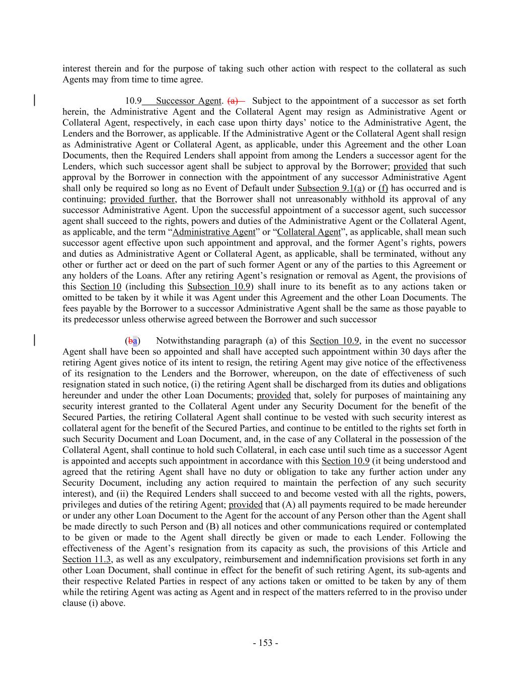 interest therein and for the purpose of taking such other action with respect to the collateral as such Agents may from time to time agree. 10.9 Successor Agent. (a) Subject to the appointment of a successor as set forth herein, the Administrative Agent and the Collateral Agent may resign as Administrative Agent or Collateral Agent, respectively, in each case upon thirty days’ notice to the Administrative Agent, the Lenders and the Borrower, as applicable. If the Administrative Agent or the Collateral Agent shall resign as Administrative Agent or Collateral Agent, as applicable, under this Agreement and the other Loan Documents, then the Required Lenders shall appoint from among the Lenders a successor agent for the Lenders, which such successor agent shall be subject to approval by the Borrower; provided that such approval by the Borrower in connection with the appointment of any successor Administrative Agent shall only be required so long as no Event of Default under Subsection 9.1(a) or (f) has occurred and is continuing; provided further, that the Borrower shall not unreasonably withhold its approval of any successor Administrative Agent. Upon the successful appointment of a successor agent, such successor agent shall succeed to the rights, powers and duties of the Administrative Agent or the Collateral Agent, as applicable, and the term “Administrative Agent” or “Collateral Agent”, as applicable, shall mean such successor agent effective upon such appointment and approval, and the former Agent’s rights, powers and duties as Administrative Agent or Collateral Agent, as applicable, shall be terminated, without any other or further act or deed on the part of such former Agent or any of the parties to this Agreement or any holders of the Loans. After any retiring Agent’s resignation or removal as Agent, the provisions of this Section 10 (including this Subsection 10.9) shall inure to its benefit as to any actions taken or omitted to be taken by it while it was Agent under this Agreement and the other Loan Documents. The fees payable by the Borrower to a successor Administrative Agent shall be the same as those payable to its predecessor unless otherwise agreed between the Borrower and such successor (ba) Notwithstanding paragraph (a) of this Section 10.9, in the event no successor Agent shall have been so appointed and shall have accepted such appointment within 30 days after the retiring Agent gives notice of its intent to resign, the retiring Agent may give notice of the effectiveness of its resignation to the Lenders and the Borrower, whereupon, on the date of effectiveness of such resignation stated in such notice, (i) the retiring Agent shall be discharged from its duties and obligations hereunder and under the other Loan Documents; provided that, solely for purposes of maintaining any security interest granted to the Collateral Agent under any Security Document for the benefit of the Secured Parties, the retiring Collateral Agent shall continue to be vested with such security interest as collateral agent for the benefit of the Secured Parties, and continue to be entitled to the rights set forth in such Security Document and Loan Document, and, in the case of any Collateral in the possession of the Collateral Agent, shall continue to hold such Collateral, in each case until such time as a successor Agent is appointed and accepts such appointment in accordance with this Section 10.9 (it being understood and agreed that the retiring Agent shall have no duty or obligation to take any further action under any Security Document, including any action required to maintain the perfection of any such security interest), and (ii) the Required Lenders shall succeed to and become vested with all the rights, powers, privileges and duties of the retiring Agent; provided that (A) all payments required to be made hereunder or under any other Loan Document to the Agent for the account of any Person other than the Agent shall be made directly to such Person and (B) all notices and other communications required or contemplated to be given or made to the Agent shall directly be given or made to each Lender. Following the effectiveness of the Agent’s resignation from its capacity as such, the provisions of this Article and Section 11.3, as well as any exculpatory, reimbursement and indemnification provisions set forth in any other Loan Document, shall continue in effect for the benefit of such retiring Agent, its sub-agents and their respective Related Parties in respect of any actions taken or omitted to be taken by any of them while the retiring Agent was acting as Agent and in respect of the matters referred to in the proviso under clause (i) above. - 153 -