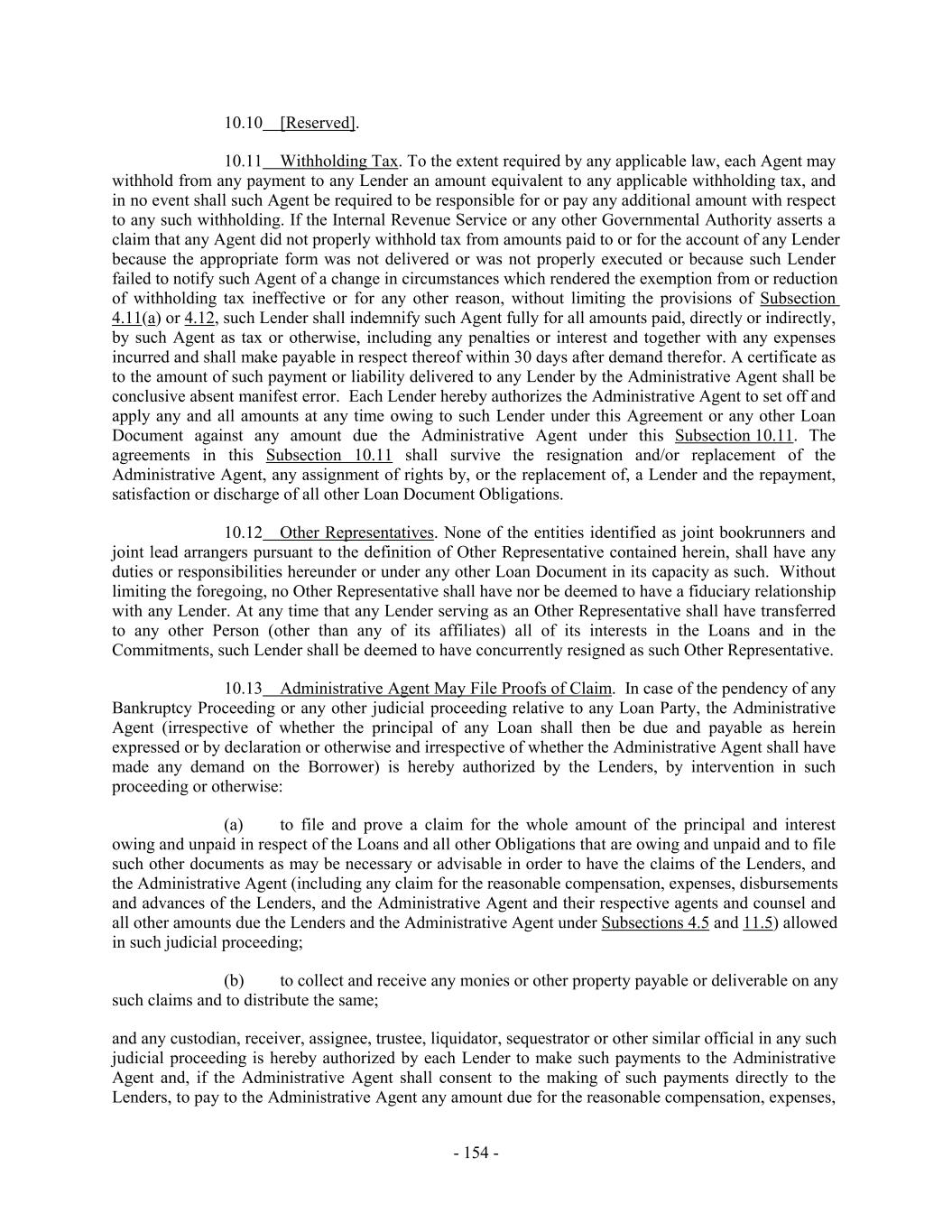 10.10 [Reserved]. 10.11 Withholding Tax. To the extent required by any applicable law, each Agent may withhold from any payment to any Lender an amount equivalent to any applicable withholding tax, and in no event shall such Agent be required to be responsible for or pay any additional amount with respect to any such withholding. If the Internal Revenue Service or any other Governmental Authority asserts a claim that any Agent did not properly withhold tax from amounts paid to or for the account of any Lender because the appropriate form was not delivered or was not properly executed or because such Lender failed to notify such Agent of a change in circumstances which rendered the exemption from or reduction of withholding tax ineffective or for any other reason, without limiting the provisions of Subsection 4.11(a) or 4.12, such Lender shall indemnify such Agent fully for all amounts paid, directly or indirectly, by such Agent as tax or otherwise, including any penalties or interest and together with any expenses incurred and shall make payable in respect thereof within 30 days after demand therefor. A certificate as to the amount of such payment or liability delivered to any Lender by the Administrative Agent shall be conclusive absent manifest error. Each Lender hereby authorizes the Administrative Agent to set off and apply any and all amounts at any time owing to such Lender under this Agreement or any other Loan Document against any amount due the Administrative Agent under this Subsection 10.11. The agreements in this Subsection 10.11 shall survive the resignation and/or replacement of the Administrative Agent, any assignment of rights by, or the replacement of, a Lender and the repayment, satisfaction or discharge of all other Loan Document Obligations. 10.12 Other Representatives. None of the entities identified as joint bookrunners and joint lead arrangers pursuant to the definition of Other Representative contained herein, shall have any duties or responsibilities hereunder or under any other Loan Document in its capacity as such. Without limiting the foregoing, no Other Representative shall have nor be deemed to have a fiduciary relationship with any Lender. At any time that any Lender serving as an Other Representative shall have transferred to any other Person (other than any of its affiliates) all of its interests in the Loans and in the Commitments, such Lender shall be deemed to have concurrently resigned as such Other Representative. 10.13 Administrative Agent May File Proofs of Claim. In case of the pendency of any Bankruptcy Proceeding or any other judicial proceeding relative to any Loan Party, the Administrative Agent (irrespective of whether the principal of any Loan shall then be due and payable as herein expressed or by declaration or otherwise and irrespective of whether the Administrative Agent shall have made any demand on the Borrower) is hereby authorized by the Lenders, by intervention in such proceeding or otherwise: (a) to file and prove a claim for the whole amount of the principal and interest owing and unpaid in respect of the Loans and all other Obligations that are owing and unpaid and to file such other documents as may be necessary or advisable in order to have the claims of the Lenders, and the Administrative Agent (including any claim for the reasonable compensation, expenses, disbursements and advances of the Lenders, and the Administrative Agent and their respective agents and counsel and all other amounts due the Lenders and the Administrative Agent under Subsections 4.5 and 11.5) allowed in such judicial proceeding; (b) to collect and receive any monies or other property payable or deliverable on any such claims and to distribute the same; and any custodian, receiver, assignee, trustee, liquidator, sequestrator or other similar official in any such judicial proceeding is hereby authorized by each Lender to make such payments to the Administrative Agent and, if the Administrative Agent shall consent to the making of such payments directly to the Lenders, to pay to the Administrative Agent any amount due for the reasonable compensation, expenses, - 154 -