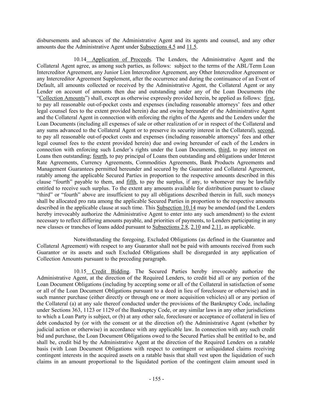 disbursements and advances of the Administrative Agent and its agents and counsel, and any other amounts due the Administrative Agent under Subsections 4.5 and 11.5. 10.14 Application of Proceeds. The Lenders, the Administrative Agent and the Collateral Agent agree, as among such parties, as follows: subject to the terms of the ABL/Term Loan Intercreditor Agreement, any Junior Lien Intercreditor Agreement, any Other Intercreditor Agreement or any Intercreditor Agreement Supplement, after the occurrence and during the continuance of an Event of Default, all amounts collected or received by the Administrative Agent, the Collateral Agent or any Lender on account of amounts then due and outstanding under any of the Loan Documents (the “Collection Amounts”) shall, except as otherwise expressly provided herein, be applied as follows: first, to pay all reasonable out-of-pocket costs and expenses (including reasonable attorneys’ fees and other legal counsel fees to the extent provided herein) due and owing hereunder of the Administrative Agent and the Collateral Agent in connection with enforcing the rights of the Agents and the Lenders under the Loan Documents (including all expenses of sale or other realization of or in respect of the Collateral and any sums advanced to the Collateral Agent or to preserve its security interest in the Collateral), second, to pay all reasonable out-of-pocket costs and expenses (including reasonable attorneys’ fees and other legal counsel fees to the extent provided herein) due and owing hereunder of each of the Lenders in connection with enforcing such Lender’s rights under the Loan Documents, third, to pay interest on Loans then outstanding; fourth, to pay principal of Loans then outstanding and obligations under Interest Rate Agreements, Currency Agreements, Commodities Agreements, Bank Products Agreements and Management Guarantees permitted hereunder and secured by the Guarantee and Collateral Agreement, ratably among the applicable Secured Parties in proportion to the respective amounts described in this clause “fourth” payable to them, and fifth, to pay the surplus, if any, to whomever may be lawfully entitled to receive such surplus. To the extent any amounts available for distribution pursuant to clause “third” or “fourth” above are insufficient to pay all obligations described therein in full, such moneys shall be allocated pro rata among the applicable Secured Parties in proportion to the respective amounts described in the applicable clause at such time. This Subsection 10.14 may be amended (and the Lenders hereby irrevocably authorize the Administrative Agent to enter into any such amendment) to the extent necessary to reflect differing amounts payable, and priorities of payments, to Lenders participating in any new classes or tranches of loans added pursuant to Subsections 2.8, 2.10 and 2.11, as applicable. Notwithstanding the foregoing, Excluded Obligations (as defined in the Guarantee and Collateral Agreement) with respect to any Guarantor shall not be paid with amounts received from such Guarantor or its assets and such Excluded Obligations shall be disregarded in any application of Collection Amounts pursuant to the preceding paragraph. 10.15 Credit Bidding. The Secured Parties hereby irrevocably authorize the Administrative Agent, at the direction of the Required Lenders, to credit bid all or any portion of the Loan Document Obligations (including by accepting some or all of the Collateral in satisfaction of some or all of the Loan Document Obligations pursuant to a deed in lieu of foreclosure or otherwise) and in such manner purchase (either directly or through one or more acquisition vehicles) all or any portion of the Collateral (a) at any sale thereof conducted under the provisions of the Bankruptcy Code, including under Sections 363, 1123 or 1129 of the Bankruptcy Code, or any similar laws in any other jurisdictions to which a Loan Party is subject, or (b) at any other sale, foreclosure or acceptance of collateral in lieu of debt conducted by (or with the consent or at the direction of) the Administrative Agent (whether by judicial action or otherwise) in accordance with any applicable law. In connection with any such credit bid and purchase, the Loan Document Obligations owed to the Secured Parties shall be entitled to be, and shall be, credit bid by the Administrative Agent at the direction of the Required Lenders on a ratable basis (with Loan Document Obligations with respect to contingent or unliquidated claims receiving contingent interests in the acquired assets on a ratable basis that shall vest upon the liquidation of such claims in an amount proportional to the liquidated portion of the contingent claim amount used in - 155 -