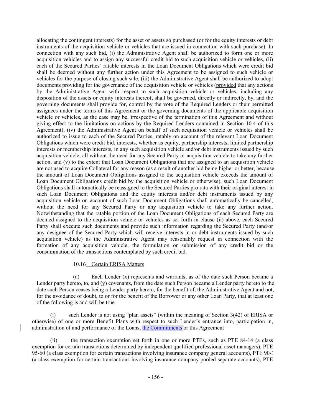 allocating the contingent interests) for the asset or assets so purchased (or for the equity interests or debt instruments of the acquisition vehicle or vehicles that are issued in connection with such purchase). In connection with any such bid, (i) the Administrative Agent shall be authorized to form one or more acquisition vehicles and to assign any successful credit bid to such acquisition vehicle or vehicles, (ii) each of the Secured Parties’ ratable interests in the Loan Document Obligations which were credit bid shall be deemed without any further action under this Agreement to be assigned to such vehicle or vehicles for the purpose of closing such sale, (iii) the Administrative Agent shall be authorized to adopt documents providing for the governance of the acquisition vehicle or vehicles (provided that any actions by the Administrative Agent with respect to such acquisition vehicle or vehicles, including any disposition of the assets or equity interests thereof, shall be governed, directly or indirectly, by, and the governing documents shall provide for, control by the vote of the Required Lenders or their permitted assignees under the terms of this Agreement or the governing documents of the applicable acquisition vehicle or vehicles, as the case may be, irrespective of the termination of this Agreement and without giving effect to the limitations on actions by the Required Lenders contained in Section 10.4 of this Agreement), (iv) the Administrative Agent on behalf of such acquisition vehicle or vehicles shall be authorized to issue to each of the Secured Parties, ratably on account of the relevant Loan Document Obligations which were credit bid, interests, whether as equity, partnership interests, limited partnership interests or membership interests, in any such acquisition vehicle and/or debt instruments issued by such acquisition vehicle, all without the need for any Secured Party or acquisition vehicle to take any further action, and (v) to the extent that Loan Document Obligations that are assigned to an acquisition vehicle are not used to acquire Collateral for any reason (as a result of another bid being higher or better, because the amount of Loan Document Obligations assigned to the acquisition vehicle exceeds the amount of Loan Document Obligations credit bid by the acquisition vehicle or otherwise), such Loan Document Obligations shall automatically be reassigned to the Secured Parties pro rata with their original interest in such Loan Document Obligations and the equity interests and/or debt instruments issued by any acquisition vehicle on account of such Loan Document Obligations shall automatically be cancelled, without the need for any Secured Party or any acquisition vehicle to take any further action. Notwithstanding that the ratable portion of the Loan Document Obligations of each Secured Party are deemed assigned to the acquisition vehicle or vehicles as set forth in clause (ii) above, each Secured Party shall execute such documents and provide such information regarding the Secured Party (and/or any designee of the Secured Party which will receive interests in or debt instruments issued by such acquisition vehicle) as the Administrative Agent may reasonably request in connection with the formation of any acquisition vehicle, the formulation or submission of any credit bid or the consummation of the transactions contemplated by such credit bid. 10.16 Certain ERISA Matters (a) Each Lender (x) represents and warrants, as of the date such Person became a Lender party hereto, to, and (y) covenants, from the date such Person became a Lender party hereto to the date such Person ceases being a Lender party hereto, for the benefit of, the Administrative Agent and not, for the avoidance of doubt, to or for the benefit of the Borrower or any other Loan Party, that at least one of the following is and will be true (i) such Lender is not using “plan assets” (within the meaning of Section 3(42) of ERISA or otherwise) of one or more Benefit Plans with respect to such Lender’s entrance into, participation in, administration of and performance of the Loans, the Commitments or this Agreement (ii) the transaction exemption set forth in one or more PTEs, such as PTE 84-14 (a class exemption for certain transactions determined by independent qualified professional asset managers), PTE 95-60 (a class exemption for certain transactions involving insurance company general accounts), PTE 90-1 (a class exemption for certain transactions involving insurance company pooled separate accounts), PTE - 156 -