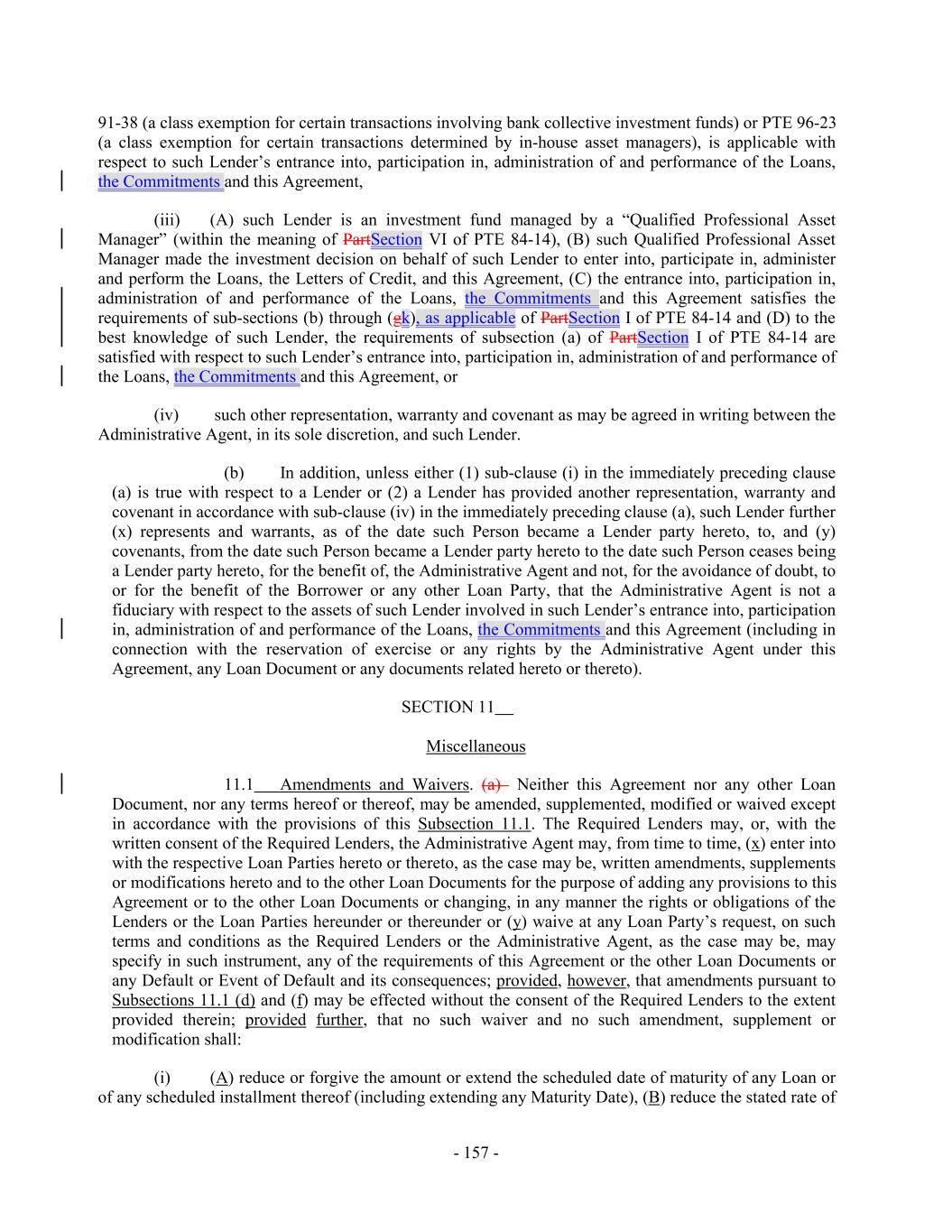 91-38 (a class exemption for certain transactions involving bank collective investment funds) or PTE 96-23 (a class exemption for certain transactions determined by in-house asset managers), is applicable with respect to such Lender’s entrance into, participation in, administration of and performance of the Loans, the Commitments and this Agreement, (iii) (A) such Lender is an investment fund managed by a “Qualified Professional Asset Manager” (within the meaning of PartSection VI of PTE 84-14), (B) such Qualified Professional Asset Manager made the investment decision on behalf of such Lender to enter into, participate in, administer and perform the Loans, the Letters of Credit, and this Agreement, (C) the entrance into, participation in, administration of and performance of the Loans, the Commitments and this Agreement satisfies the requirements of sub-sections (b) through (gk), as applicable of PartSection I of PTE 84-14 and (D) to the best knowledge of such Lender, the requirements of subsection (a) of PartSection I of PTE 84-14 are satisfied with respect to such Lender’s entrance into, participation in, administration of and performance of the Loans, the Commitments and this Agreement, or (iv) such other representation, warranty and covenant as may be agreed in writing between the Administrative Agent, in its sole discretion, and such Lender. (b) In addition, unless either (1) sub-clause (i) in the immediately preceding clause (a) is true with respect to a Lender or (2) a Lender has provided another representation, warranty and covenant in accordance with sub-clause (iv) in the immediately preceding clause (a), such Lender further (x) represents and warrants, as of the date such Person became a Lender party hereto, to, and (y) covenants, from the date such Person became a Lender party hereto to the date such Person ceases being a Lender party hereto, for the benefit of, the Administrative Agent and not, for the avoidance of doubt, to or for the benefit of the Borrower or any other Loan Party, that the Administrative Agent is not a fiduciary with respect to the assets of such Lender involved in such Lender’s entrance into, participation in, administration of and performance of the Loans, the Commitments and this Agreement (including in connection with the reservation of exercise or any rights by the Administrative Agent under this Agreement, any Loan Document or any documents related hereto or thereto). SECTION 11 Miscellaneous 11.1 Amendments and Waivers. (a) Neither this Agreement nor any other Loan Document, nor any terms hereof or thereof, may be amended, supplemented, modified or waived except in accordance with the provisions of this Subsection 11.1. The Required Lenders may, or, with the written consent of the Required Lenders, the Administrative Agent may, from time to time, (x) enter into with the respective Loan Parties hereto or thereto, as the case may be, written amendments, supplements or modifications hereto and to the other Loan Documents for the purpose of adding any provisions to this Agreement or to the other Loan Documents or changing, in any manner the rights or obligations of the Lenders or the Loan Parties hereunder or thereunder or (y) waive at any Loan Party’s request, on such terms and conditions as the Required Lenders or the Administrative Agent, as the case may be, may specify in such instrument, any of the requirements of this Agreement or the other Loan Documents or any Default or Event of Default and its consequences; provided, however, that amendments pursuant to Subsections 11.1 (d) and (f) may be effected without the consent of the Required Lenders to the extent provided therein; provided further, that no such waiver and no such amendment, supplement or modification shall: (i) (A) reduce or forgive the amount or extend the scheduled date of maturity of any Loan or of any scheduled installment thereof (including extending any Maturity Date), (B) reduce the stated rate of - 157 -