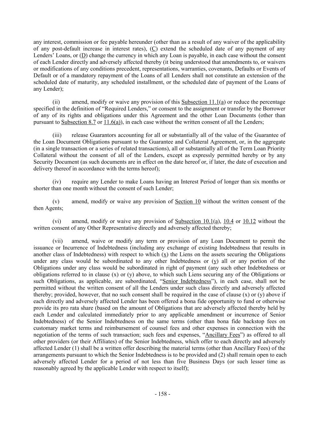 any interest, commission or fee payable hereunder (other than as a result of any waiver of the applicability of any post-default increase in interest rates), (C) extend the scheduled date of any payment of any Lenders’ Loans, or (D) change the currency in which any Loan is payable, in each case without the consent of each Lender directly and adversely affected thereby (it being understood that amendments to, or waivers or modifications of any conditions precedent, representations, warranties, covenants, Defaults or Events of Default or of a mandatory repayment of the Loans of all Lenders shall not constitute an extension of the scheduled date of maturity, any scheduled installment, or the scheduled date of payment of the Loans of any Lender); (ii) amend, modify or waive any provision of this Subsection 11.1(a) or reduce the percentage specified in the definition of “Required Lenders,” or consent to the assignment or transfer by the Borrower of any of its rights and obligations under this Agreement and the other Loan Documents (other than pursuant to Subsection 8.7 or 11.6(a)), in each case without the written consent of all the Lenders; (iii) release Guarantors accounting for all or substantially all of the value of the Guarantee of the Loan Document Obligations pursuant to the Guarantee and Collateral Agreement, or, in the aggregate (in a single transaction or a series of related transactions), all or substantially all of the Term Loan Priority Collateral without the consent of all of the Lenders, except as expressly permitted hereby or by any Security Document (as such documents are in effect on the date hereof or, if later, the date of execution and delivery thereof in accordance with the terms hereof); (iv) require any Lender to make Loans having an Interest Period of longer than six months or shorter than one month without the consent of such Lender; (v) amend, modify or waive any provision of Section 10 without the written consent of the then Agents; (vi) amend, modify or waive any provision of Subsection 10.1(a), 10.4 or 10.12 without the written consent of any Other Representative directly and adversely affected thereby; (vii) amend, waive or modify any term or provision of any Loan Document to permit the issuance or Incurrence of Indebtedness (including any exchange of existing Indebtedness that results in another class of Indebtedness) with respect to which (x) the Liens on the assets securing the Obligations under any class would be subordinated to any other Indebtedness or (y) all or any portion of the Obligations under any class would be subordinated in right of payment (any such other Indebtedness or obligations referred to in clause (x) or (y) above, to which such Liens securing any of the Obligations or such Obligations, as applicable, are subordinated, “Senior Indebtedness”), in each case, shall not be permitted without the written consent of all the Lenders under such class directly and adversely affected thereby; provided, however, that no such consent shall be required in the case of clause (x) or (y) above if each directly and adversely affected Lender has been offered a bona fide opportunity to fund or otherwise provide its pro rata share (based on the amount of Obligations that are adversely affected thereby held by each Lender and calculated immediately prior to any applicable amendment or incurrence of Senior Indebtedness) of the Senior Indebtedness on the same terms (other than bona fide backstop fees on customary market terms and reimbursement of counsel fees and other expenses in connection with the negotiation of the terms of such transaction; such fees and expenses, “Ancillary Fees”) as offered to all other providers (or their Affiliates) of the Senior Indebtedness, which offer to each directly and adversely affected Lender (1) shall be a written offer describing the material terms (other than Ancillary Fees) of the arrangements pursuant to which the Senior Indebtedness is to be provided and (2) shall remain open to each adversely affected Lender for a period of not less than five Business Days (or such lesser time as reasonably agreed by the applicable Lender with respect to itself); - 158 -
