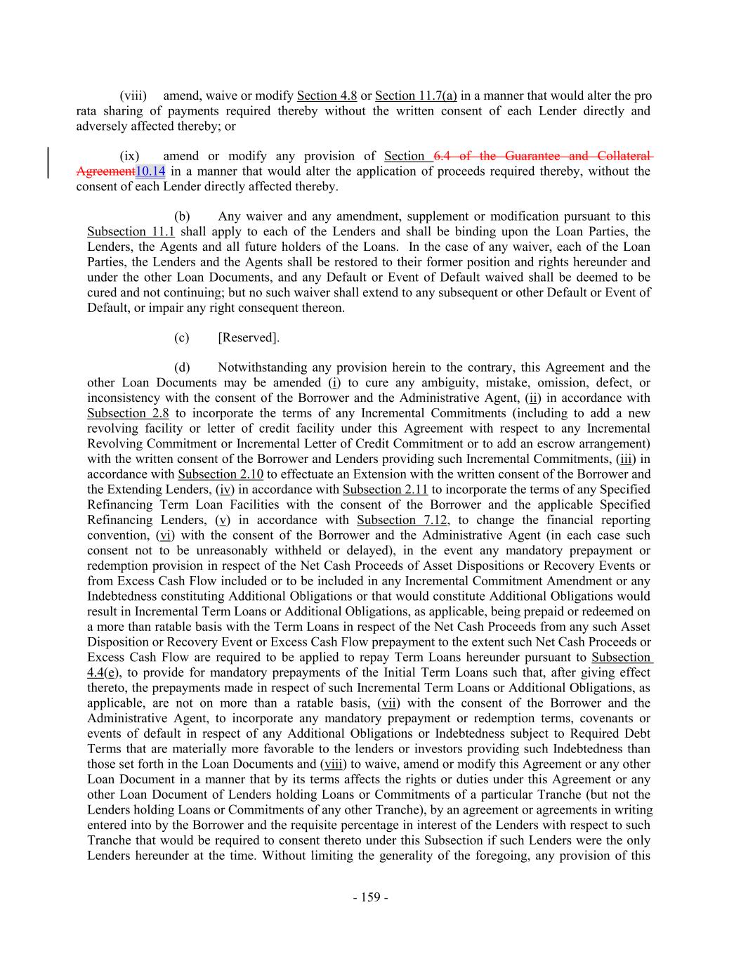 (viii) amend, waive or modify Section 4.8 or Section 11.7(a) in a manner that would alter the pro rata sharing of payments required thereby without the written consent of each Lender directly and adversely affected thereby; or (ix) amend or modify any provision of Section 6.4 of the Guarantee and Collateral Agreement10.14 in a manner that would alter the application of proceeds required thereby, without the consent of each Lender directly affected thereby. (b) Any waiver and any amendment, supplement or modification pursuant to this Subsection 11.1 shall apply to each of the Lenders and shall be binding upon the Loan Parties, the Lenders, the Agents and all future holders of the Loans. In the case of any waiver, each of the Loan Parties, the Lenders and the Agents shall be restored to their former position and rights hereunder and under the other Loan Documents, and any Default or Event of Default waived shall be deemed to be cured and not continuing; but no such waiver shall extend to any subsequent or other Default or Event of Default, or impair any right consequent thereon. (c) [Reserved]. (d) Notwithstanding any provision herein to the contrary, this Agreement and the other Loan Documents may be amended (i) to cure any ambiguity, mistake, omission, defect, or inconsistency with the consent of the Borrower and the Administrative Agent, (ii) in accordance with Subsection 2.8 to incorporate the terms of any Incremental Commitments (including to add a new revolving facility or letter of credit facility under this Agreement with respect to any Incremental Revolving Commitment or Incremental Letter of Credit Commitment or to add an escrow arrangement) with the written consent of the Borrower and Lenders providing such Incremental Commitments, (iii) in accordance with Subsection 2.10 to effectuate an Extension with the written consent of the Borrower and the Extending Lenders, (iv) in accordance with Subsection 2.11 to incorporate the terms of any Specified Refinancing Term Loan Facilities with the consent of the Borrower and the applicable Specified Refinancing Lenders, (v) in accordance with Subsection 7.12, to change the financial reporting convention, (vi) with the consent of the Borrower and the Administrative Agent (in each case such consent not to be unreasonably withheld or delayed), in the event any mandatory prepayment or redemption provision in respect of the Net Cash Proceeds of Asset Dispositions or Recovery Events or from Excess Cash Flow included or to be included in any Incremental Commitment Amendment or any Indebtedness constituting Additional Obligations or that would constitute Additional Obligations would result in Incremental Term Loans or Additional Obligations, as applicable, being prepaid or redeemed on a more than ratable basis with the Term Loans in respect of the Net Cash Proceeds from any such Asset Disposition or Recovery Event or Excess Cash Flow prepayment to the extent such Net Cash Proceeds or Excess Cash Flow are required to be applied to repay Term Loans hereunder pursuant to Subsection 4.4(e), to provide for mandatory prepayments of the Initial Term Loans such that, after giving effect thereto, the prepayments made in respect of such Incremental Term Loans or Additional Obligations, as applicable, are not on more than a ratable basis, (vii) with the consent of the Borrower and the Administrative Agent, to incorporate any mandatory prepayment or redemption terms, covenants or events of default in respect of any Additional Obligations or Indebtedness subject to Required Debt Terms that are materially more favorable to the lenders or investors providing such Indebtedness than those set forth in the Loan Documents and (viii) to waive, amend or modify this Agreement or any other Loan Document in a manner that by its terms affects the rights or duties under this Agreement or any other Loan Document of Lenders holding Loans or Commitments of a particular Tranche (but not the Lenders holding Loans or Commitments of any other Tranche), by an agreement or agreements in writing entered into by the Borrower and the requisite percentage in interest of the Lenders with respect to such Tranche that would be required to consent thereto under this Subsection if such Lenders were the only Lenders hereunder at the time. Without limiting the generality of the foregoing, any provision of this - 159 -