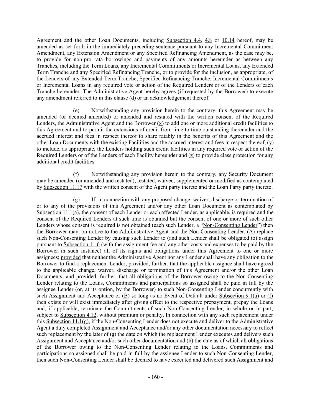 Agreement and the other Loan Documents, including Subsection 4.4, 4.8 or 10.14 hereof, may be amended as set forth in the immediately preceding sentence pursuant to any Incremental Commitment Amendment, any Extension Amendment or any Specified Refinancing Amendment, as the case may be, to provide for non-pro rata borrowings and payments of any amounts hereunder as between any Tranches, including the Term Loans, any Incremental Commitments or Incremental Loans, any Extended Term Tranche and any Specified Refinancing Tranche, or to provide for the inclusion, as appropriate, of the Lenders of any Extended Term Tranche, Specified Refinancing Tranche, Incremental Commitments or Incremental Loans in any required vote or action of the Required Lenders or of the Lenders of each Tranche hereunder. The Administrative Agent hereby agrees (if requested by the Borrower) to execute any amendment referred to in this clause (d) or an acknowledgement thereof. (e) Notwithstanding any provision herein to the contrary, this Agreement may be amended (or deemed amended) or amended and restated with the written consent of the Required Lenders, the Administrative Agent and the Borrower (x) to add one or more additional credit facilities to this Agreement and to permit the extensions of credit from time to time outstanding thereunder and the accrued interest and fees in respect thereof to share ratably in the benefits of this Agreement and the other Loan Documents with the existing Facilities and the accrued interest and fees in respect thereof, (y) to include, as appropriate, the Lenders holding such credit facilities in any required vote or action of the Required Lenders or of the Lenders of each Facility hereunder and (z) to provide class protection for any additional credit facilities. (f) Notwithstanding any provision herein to the contrary, any Security Document may be amended (or amended and restated), restated, waived, supplemented or modified as contemplated by Subsection 11.17 with the written consent of the Agent party thereto and the Loan Party party thereto. (g) If, in connection with any proposed change, waiver, discharge or termination of or to any of the provisions of this Agreement and/or any other Loan Document as contemplated by Subsection 11.1(a), the consent of each Lender or each affected Lender, as applicable, is required and the consent of the Required Lenders at such time is obtained but the consent of one or more of such other Lenders whose consent is required is not obtained (each such Lender, a “Non-Consenting Lender”) then the Borrower may, on notice to the Administrative Agent and the Non-Consenting Lender, (A) replace such Non-Consenting Lender by causing such Lender to (and such Lender shall be obligated to) assign pursuant to Subsection 11.6 (with the assignment fee and any other costs and expenses to be paid by the Borrower in such instance) all of its rights and obligations under this Agreement to one or more assignees; provided that neither the Administrative Agent nor any Lender shall have any obligation to the Borrower to find a replacement Lender; provided, further, that the applicable assignee shall have agreed to the applicable change, waiver, discharge or termination of this Agreement and/or the other Loan Documents; and provided, further, that all obligations of the Borrower owing to the Non-Consenting Lender relating to the Loans, Commitments and participations so assigned shall be paid in full by the assignee Lender (or, at its option, by the Borrower) to such Non-Consenting Lender concurrently with such Assignment and Acceptance or (B) so long as no Event of Default under Subsection 9.1(a) or (f) then exists or will exist immediately after giving effect to the respective prepayment, prepay the Loans and, if applicable, terminate the Commitments of such Non-Consenting Lender, in whole or in part, subject to Subsection 4.12, without premium or penalty. In connection with any such replacement under this Subsection 11.1(g), if the Non-Consenting Lender does not execute and deliver to the Administrative Agent a duly completed Assignment and Acceptance and/or any other documentation necessary to reflect such replacement by the later of (a) the date on which the replacement Lender executes and delivers such Assignment and Acceptance and/or such other documentation and (b) the date as of which all obligations of the Borrower owing to the Non-Consenting Lender relating to the Loans, Commitments and participations so assigned shall be paid in full by the assignee Lender to such Non-Consenting Lender, then such Non-Consenting Lender shall be deemed to have executed and delivered such Assignment and - 160 -