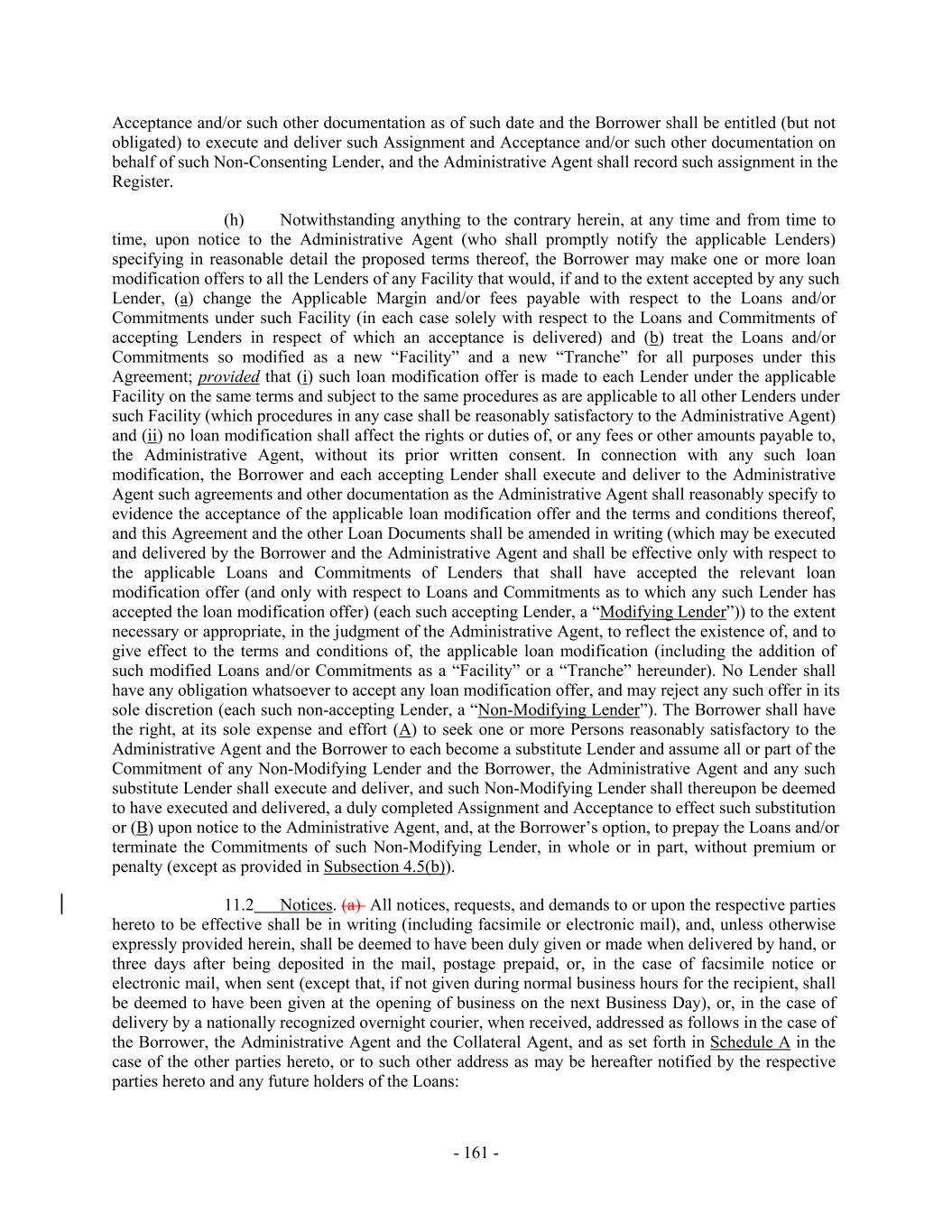 Acceptance and/or such other documentation as of such date and the Borrower shall be entitled (but not obligated) to execute and deliver such Assignment and Acceptance and/or such other documentation on behalf of such Non-Consenting Lender, and the Administrative Agent shall record such assignment in the Register. (h) Notwithstanding anything to the contrary herein, at any time and from time to time, upon notice to the Administrative Agent (who shall promptly notify the applicable Lenders) specifying in reasonable detail the proposed terms thereof, the Borrower may make one or more loan modification offers to all the Lenders of any Facility that would, if and to the extent accepted by any such Lender, (a) change the Applicable Margin and/or fees payable with respect to the Loans and/or Commitments under such Facility (in each case solely with respect to the Loans and Commitments of accepting Lenders in respect of which an acceptance is delivered) and (b) treat the Loans and/or Commitments so modified as a new “Facility” and a new “Tranche” for all purposes under this Agreement; provided that (i) such loan modification offer is made to each Lender under the applicable Facility on the same terms and subject to the same procedures as are applicable to all other Lenders under such Facility (which procedures in any case shall be reasonably satisfactory to the Administrative Agent) and (ii) no loan modification shall affect the rights or duties of, or any fees or other amounts payable to, the Administrative Agent, without its prior written consent. In connection with any such loan modification, the Borrower and each accepting Lender shall execute and deliver to the Administrative Agent such agreements and other documentation as the Administrative Agent shall reasonably specify to evidence the acceptance of the applicable loan modification offer and the terms and conditions thereof, and this Agreement and the other Loan Documents shall be amended in writing (which may be executed and delivered by the Borrower and the Administrative Agent and shall be effective only with respect to the applicable Loans and Commitments of Lenders that shall have accepted the relevant loan modification offer (and only with respect to Loans and Commitments as to which any such Lender has accepted the loan modification offer) (each such accepting Lender, a “Modifying Lender”)) to the extent necessary or appropriate, in the judgment of the Administrative Agent, to reflect the existence of, and to give effect to the terms and conditions of, the applicable loan modification (including the addition of such modified Loans and/or Commitments as a “Facility” or a “Tranche” hereunder). No Lender shall have any obligation whatsoever to accept any loan modification offer, and may reject any such offer in its sole discretion (each such non-accepting Lender, a “Non-Modifying Lender”). The Borrower shall have the right, at its sole expense and effort (A) to seek one or more Persons reasonably satisfactory to the Administrative Agent and the Borrower to each become a substitute Lender and assume all or part of the Commitment of any Non-Modifying Lender and the Borrower, the Administrative Agent and any such substitute Lender shall execute and deliver, and such Non-Modifying Lender shall thereupon be deemed to have executed and delivered, a duly completed Assignment and Acceptance to effect such substitution or (B) upon notice to the Administrative Agent, and, at the Borrower’s option, to prepay the Loans and/or terminate the Commitments of such Non-Modifying Lender, in whole or in part, without premium or penalty (except as provided in Subsection 4.5(b)). 11.2 Notices. (a) All notices, requests, and demands to or upon the respective parties hereto to be effective shall be in writing (including facsimile or electronic mail), and, unless otherwise expressly provided herein, shall be deemed to have been duly given or made when delivered by hand, or three days after being deposited in the mail, postage prepaid, or, in the case of facsimile notice or electronic mail, when sent (except that, if not given during normal business hours for the recipient, shall be deemed to have been given at the opening of business on the next Business Day), or, in the case of delivery by a nationally recognized overnight courier, when received, addressed as follows in the case of the Borrower, the Administrative Agent and the Collateral Agent, and as set forth in Schedule A in the case of the other parties hereto, or to such other address as may be hereafter notified by the respective parties hereto and any future holders of the Loans: - 161 -