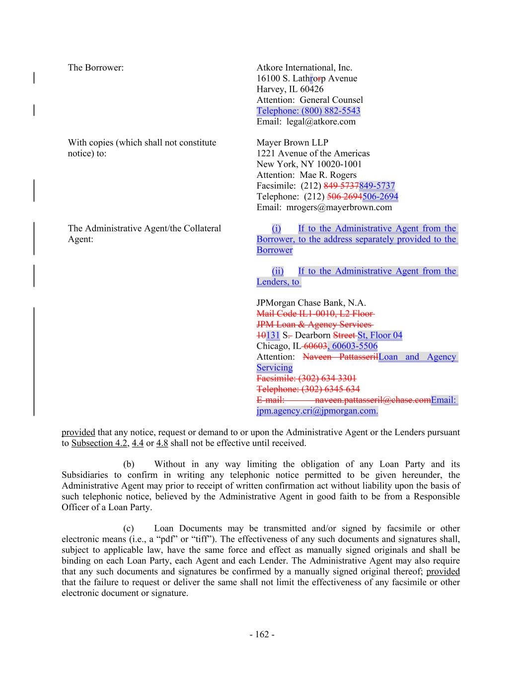 - 162 - With copies (which shall not constitute notice) to: The Borrower: Mayer Brown LLP 1221 Avenue of the Americas New York, NY 10020-1001 Attention: Mae R. Rogers Facsimile: (212) 849 5737849-5737 Telephone: (212) 506 2694506-2694 Email: mrogers@mayerbrown.com Atkore International, Inc. 16100 S. Lathrorp Avenue Harvey, IL 60426 Attention: General Counsel Telephone: (800) 882-5543 Email: legal@atkore.com The Administrative Agent/the Collateral Agent: (i) If to the Administrative Agent from the Borrower, to the address separately provided to the Borrower (ii) If to the Administrative Agent from the Lenders, to JPMorgan Chase Bank, N.A. Mail Code IL1-0010, L2 Floor JPM Loan & Agency Services 10131 S. Dearborn Street St, Floor 04 Chicago, IL 60603, 60603-5506 Attention: Naveen PattasserilLoan and Agency Servicing Facsimile: (302) 634 3301 Telephone: (302) 6345 634 E-mail: naveen.pattasseril@chase.comEmail: jpm.agency.cri@jpmorgan.com. provided that any notice, request or demand to or upon the Administrative Agent or the Lenders pursuant to Subsection 4.2, 4.4 or 4.8 shall not be effective until received. (b) Without in any way limiting the obligation of any Loan Party and its Subsidiaries to confirm in writing any telephonic notice permitted to be given hereunder, the Administrative Agent may prior to receipt of written confirmation act without liability upon the basis of such telephonic notice, believed by the Administrative Agent in good faith to be from a Responsible Officer of a Loan Party. (c) Loan Documents may be transmitted and/or signed by facsimile or other electronic means (i.e., a “pdf” or “tiff”). The effectiveness of any such documents and signatures shall, subject to applicable law, have the same force and effect as manually signed originals and shall be binding on each Loan Party, each Agent and each Lender. The Administrative Agent may also require that any such documents and signatures be confirmed by a manually signed original thereof; provided that the failure to request or deliver the same shall not limit the effectiveness of any facsimile or other electronic document or signature.