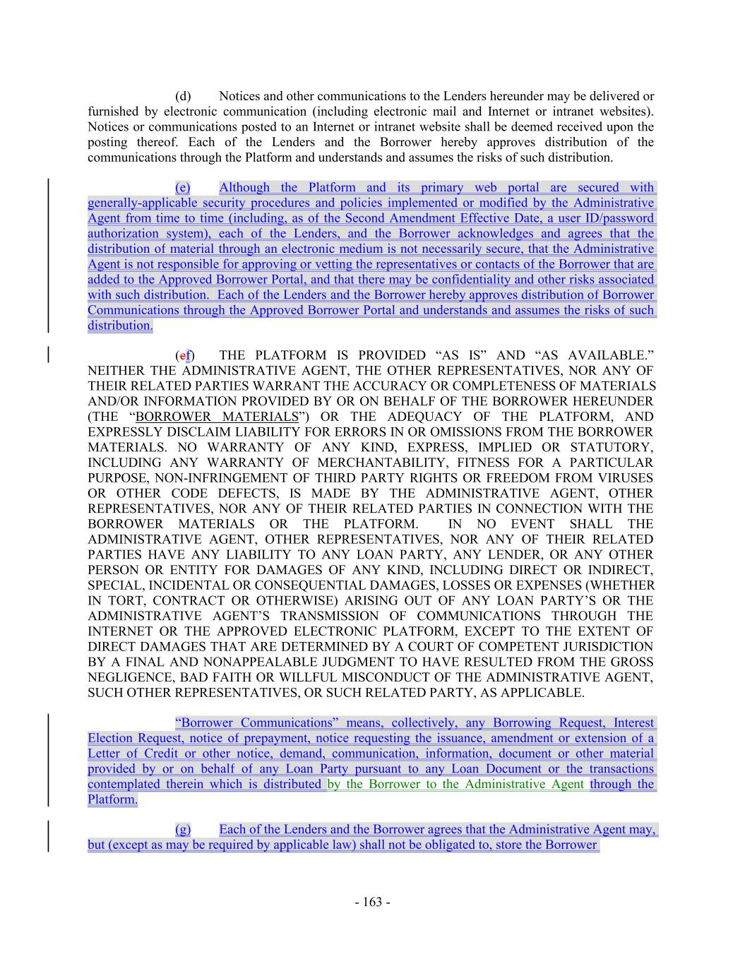 (d) Notices and other communications to the Lenders hereunder may be delivered or furnished by electronic communication (including electronic mail and Internet or intranet websites). Notices or communications posted to an Internet or intranet website shall be deemed received upon the posting thereof. Each of the Lenders and the Borrower hereby approves distribution of the communications through the Platform and understands and assumes the risks of such distribution. (e) Although the Platform and its primary web portal are secured with generally-applicable security procedures and policies implemented or modified by the Administrative Agent from time to time (including, as of the Second Amendment Effective Date, a user ID/password authorization system), each of the Lenders, and the Borrower acknowledges and agrees that the distribution of material through an electronic medium is not necessarily secure, that the Administrative Agent is not responsible for approving or vetting the representatives or contacts of the Borrower that are added to the Approved Borrower Portal, and that there may be confidentiality and other risks associated with such distribution. Each of the Lenders and the Borrower hereby approves distribution of Borrower Communications through the Approved Borrower Portal and understands and assumes the risks of such distribution. (ef) THE PLATFORM IS PROVIDED “AS IS” AND “AS AVAILABLE.” NEITHER THE ADMINISTRATIVE AGENT, THE OTHER REPRESENTATIVES, NOR ANY OF THEIR RELATED PARTIES WARRANT THE ACCURACY OR COMPLETENESS OF MATERIALS AND/OR INFORMATION PROVIDED BY OR ON BEHALF OF THE BORROWER HEREUNDER (THE “BORROWER MATERIALS”) OR THE ADEQUACY OF THE PLATFORM, AND EXPRESSLY DISCLAIM LIABILITY FOR ERRORS IN OR OMISSIONS FROM THE BORROWER MATERIALS. NO WARRANTY OF ANY KIND, EXPRESS, IMPLIED OR STATUTORY, INCLUDING ANY WARRANTY OF MERCHANTABILITY, FITNESS FOR A PARTICULAR PURPOSE, NON-INFRINGEMENT OF THIRD PARTY RIGHTS OR FREEDOM FROM VIRUSES OR OTHER CODE DEFECTS, IS MADE BY THE ADMINISTRATIVE AGENT, OTHER REPRESENTATIVES, NOR ANY OF THEIR RELATED PARTIES IN CONNECTION WITH THE BORROWER MATERIALS OR THE PLATFORM. IN NO EVENT SHALL THE ADMINISTRATIVE AGENT, OTHER REPRESENTATIVES, NOR ANY OF THEIR RELATED PARTIES HAVE ANY LIABILITY TO ANY LOAN PARTY, ANY LENDER, OR ANY OTHER PERSON OR ENTITY FOR DAMAGES OF ANY KIND, INCLUDING DIRECT OR INDIRECT, SPECIAL, INCIDENTAL OR CONSEQUENTIAL DAMAGES, LOSSES OR EXPENSES (WHETHER IN TORT, CONTRACT OR OTHERWISE) ARISING OUT OF ANY LOAN PARTY’S OR THE ADMINISTRATIVE AGENT’S TRANSMISSION OF COMMUNICATIONS THROUGH THE INTERNET OR THE APPROVED ELECTRONIC PLATFORM, EXCEPT TO THE EXTENT OF DIRECT DAMAGES THAT ARE DETERMINED BY A COURT OF COMPETENT JURISDICTION BY A FINAL AND NONAPPEALABLE JUDGMENT TO HAVE RESULTED FROM THE GROSS NEGLIGENCE, BAD FAITH OR WILLFUL MISCONDUCT OF THE ADMINISTRATIVE AGENT, SUCH OTHER REPRESENTATIVES, OR SUCH RELATED PARTY, AS APPLICABLE. “Borrower Communications” means, collectively, any Borrowing Request, Interest Election Request, notice of prepayment, notice requesting the issuance, amendment or extension of a Letter of Credit or other notice, demand, communication, information, document or other material provided by or on behalf of any Loan Party pursuant to any Loan Document or the transactions contemplated therein which is distributed by the Borrower to the Administrative Agent through the Platform. (g) Each of the Lenders and the Borrower agrees that the Administrative Agent may, but (except as may be required by applicable law) shall not be obligated to, store the Borrower - 163 -