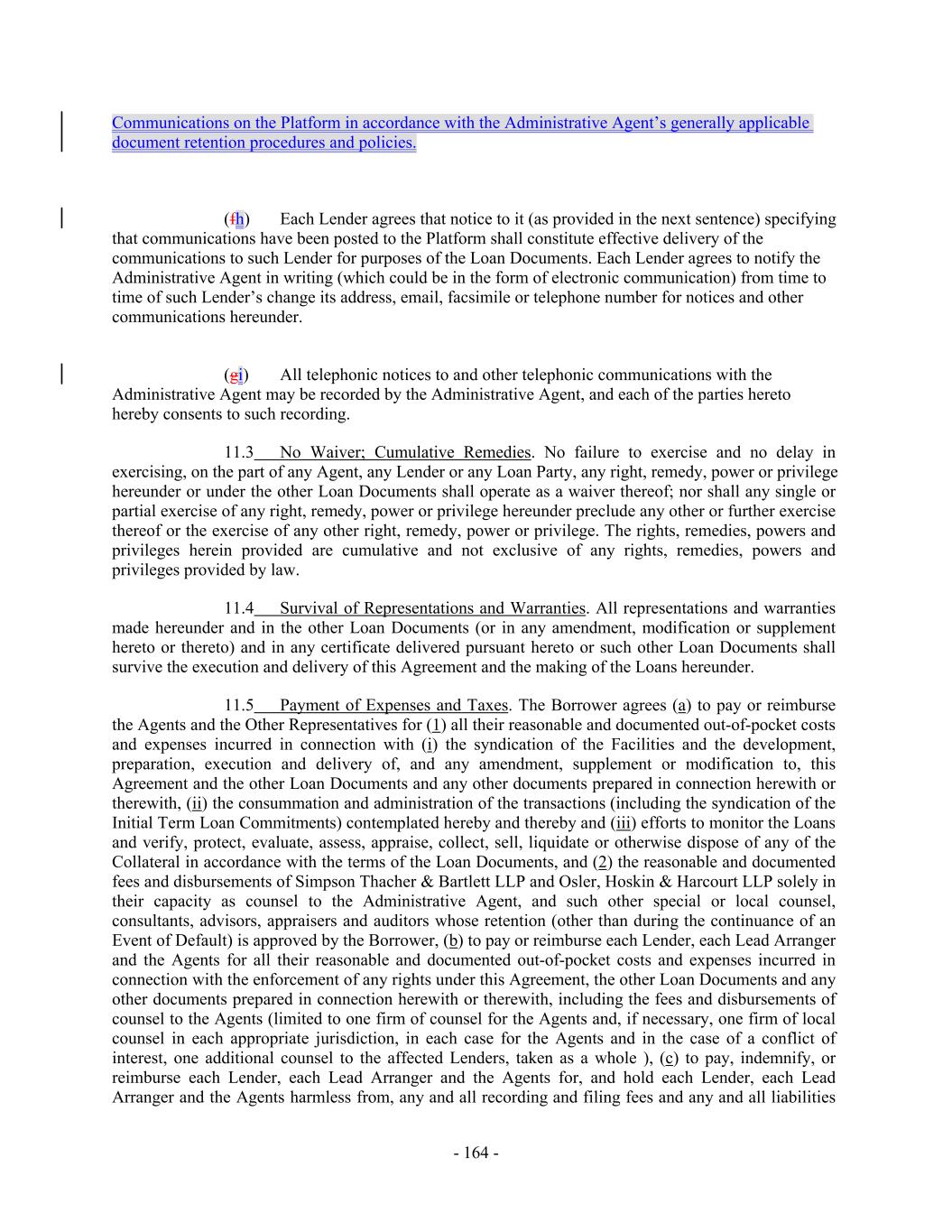 Communications on the Platform in accordance with the Administrative Agent’s generally applicable document retention procedures and policies. (fh) Each Lender agrees that notice to it (as provided in the next sentence) specifying that communications have been posted to the Platform shall constitute effective delivery of the communications to such Lender for purposes of the Loan Documents. Each Lender agrees to notify the Administrative Agent in writing (which could be in the form of electronic communication) from time to time of such Lender’s change its address, email, facsimile or telephone number for notices and other communications hereunder. (gi) All telephonic notices to and other telephonic communications with the Administrative Agent may be recorded by the Administrative Agent, and each of the parties hereto hereby consents to such recording. 11.3 No Waiver; Cumulative Remedies. No failure to exercise and no delay in exercising, on the part of any Agent, any Lender or any Loan Party, any right, remedy, power or privilege hereunder or under the other Loan Documents shall operate as a waiver thereof; nor shall any single or partial exercise of any right, remedy, power or privilege hereunder preclude any other or further exercise thereof or the exercise of any other right, remedy, power or privilege. The rights, remedies, powers and privileges herein provided are cumulative and not exclusive of any rights, remedies, powers and privileges provided by law. 11.4 Survival of Representations and Warranties. All representations and warranties made hereunder and in the other Loan Documents (or in any amendment, modification or supplement hereto or thereto) and in any certificate delivered pursuant hereto or such other Loan Documents shall survive the execution and delivery of this Agreement and the making of the Loans hereunder. 11.5 Payment of Expenses and Taxes. The Borrower agrees (a) to pay or reimburse the Agents and the Other Representatives for (1) all their reasonable and documented out-of-pocket costs and expenses incurred in connection with (i) the syndication of the Facilities and the development, preparation, execution and delivery of, and any amendment, supplement or modification to, this Agreement and the other Loan Documents and any other documents prepared in connection herewith or therewith, (ii) the consummation and administration of the transactions (including the syndication of the Initial Term Loan Commitments) contemplated hereby and thereby and (iii) efforts to monitor the Loans and verify, protect, evaluate, assess, appraise, collect, sell, liquidate or otherwise dispose of any of the Collateral in accordance with the terms of the Loan Documents, and (2) the reasonable and documented fees and disbursements of Simpson Thacher & Bartlett LLP and Osler, Hoskin & Harcourt LLP solely in their capacity as counsel to the Administrative Agent, and such other special or local counsel, consultants, advisors, appraisers and auditors whose retention (other than during the continuance of an Event of Default) is approved by the Borrower, (b) to pay or reimburse each Lender, each Lead Arranger and the Agents for all their reasonable and documented out-of-pocket costs and expenses incurred in connection with the enforcement of any rights under this Agreement, the other Loan Documents and any other documents prepared in connection herewith or therewith, including the fees and disbursements of counsel to the Agents (limited to one firm of counsel for the Agents and, if necessary, one firm of local counsel in each appropriate jurisdiction, in each case for the Agents and in the case of a conflict of interest, one additional counsel to the affected Lenders, taken as a whole ), (c) to pay, indemnify, or reimburse each Lender, each Lead Arranger and the Agents for, and hold each Lender, each Lead Arranger and the Agents harmless from, any and all recording and filing fees and any and all liabilities - 164 -