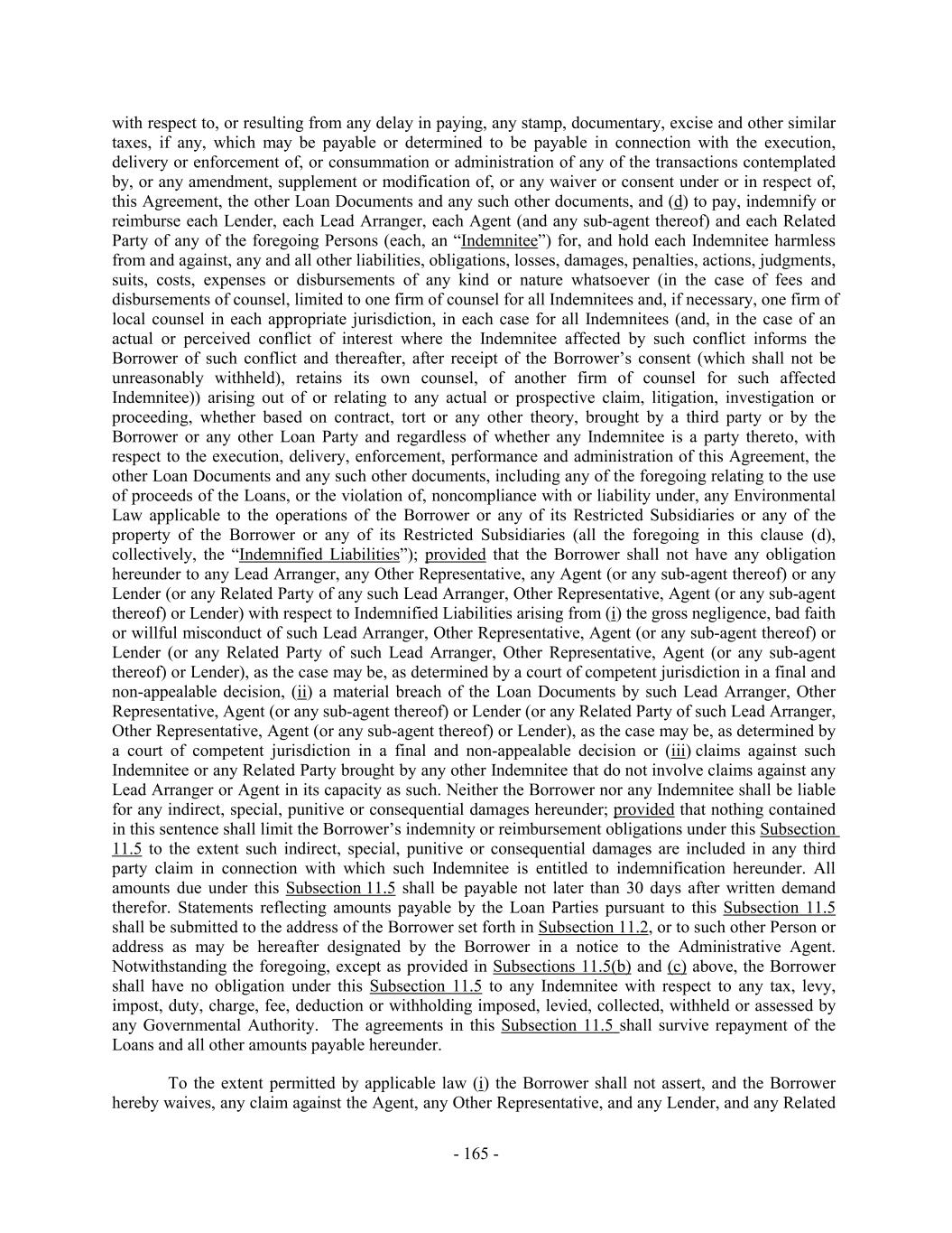 with respect to, or resulting from any delay in paying, any stamp, documentary, excise and other similar taxes, if any, which may be payable or determined to be payable in connection with the execution, delivery or enforcement of, or consummation or administration of any of the transactions contemplated by, or any amendment, supplement or modification of, or any waiver or consent under or in respect of, this Agreement, the other Loan Documents and any such other documents, and (d) to pay, indemnify or reimburse each Lender, each Lead Arranger, each Agent (and any sub-agent thereof) and each Related Party of any of the foregoing Persons (each, an “Indemnitee”) for, and hold each Indemnitee harmless from and against, any and all other liabilities, obligations, losses, damages, penalties, actions, judgments, suits, costs, expenses or disbursements of any kind or nature whatsoever (in the case of fees and disbursements of counsel, limited to one firm of counsel for all Indemnitees and, if necessary, one firm of local counsel in each appropriate jurisdiction, in each case for all Indemnitees (and, in the case of an actual or perceived conflict of interest where the Indemnitee affected by such conflict informs the Borrower of such conflict and thereafter, after receipt of the Borrower’s consent (which shall not be unreasonably withheld), retains its own counsel, of another firm of counsel for such affected Indemnitee)) arising out of or relating to any actual or prospective claim, litigation, investigation or proceeding, whether based on contract, tort or any other theory, brought by a third party or by the Borrower or any other Loan Party and regardless of whether any Indemnitee is a party thereto, with respect to the execution, delivery, enforcement, performance and administration of this Agreement, the other Loan Documents and any such other documents, including any of the foregoing relating to the use of proceeds of the Loans, or the violation of, noncompliance with or liability under, any Environmental Law applicable to the operations of the Borrower or any of its Restricted Subsidiaries or any of the property of the Borrower or any of its Restricted Subsidiaries (all the foregoing in this clause (d), collectively, the “Indemnified Liabilities”); provided that the Borrower shall not have any obligation hereunder to any Lead Arranger, any Other Representative, any Agent (or any sub-agent thereof) or any Lender (or any Related Party of any such Lead Arranger, Other Representative, Agent (or any sub-agent thereof) or Lender) with respect to Indemnified Liabilities arising from (i) the gross negligence, bad faith or willful misconduct of such Lead Arranger, Other Representative, Agent (or any sub-agent thereof) or Lender (or any Related Party of such Lead Arranger, Other Representative, Agent (or any sub-agent thereof) or Lender), as the case may be, as determined by a court of competent jurisdiction in a final and non-appealable decision, (ii) a material breach of the Loan Documents by such Lead Arranger, Other Representative, Agent (or any sub-agent thereof) or Lender (or any Related Party of such Lead Arranger, Other Representative, Agent (or any sub-agent thereof) or Lender), as the case may be, as determined by a court of competent jurisdiction in a final and non-appealable decision or (iii) claims against such Indemnitee or any Related Party brought by any other Indemnitee that do not involve claims against any Lead Arranger or Agent in its capacity as such. Neither the Borrower nor any Indemnitee shall be liable for any indirect, special, punitive or consequential damages hereunder; provided that nothing contained in this sentence shall limit the Borrower’s indemnity or reimbursement obligations under this Subsection 11.5 to the extent such indirect, special, punitive or consequential damages are included in any third party claim in connection with which such Indemnitee is entitled to indemnification hereunder. All amounts due under this Subsection 11.5 shall be payable not later than 30 days after written demand therefor. Statements reflecting amounts payable by the Loan Parties pursuant to this Subsection 11.5 shall be submitted to the address of the Borrower set forth in Subsection 11.2, or to such other Person or address as may be hereafter designated by the Borrower in a notice to the Administrative Agent. Notwithstanding the foregoing, except as provided in Subsections 11.5(b) and (c) above, the Borrower shall have no obligation under this Subsection 11.5 to any Indemnitee with respect to any tax, levy, impost, duty, charge, fee, deduction or withholding imposed, levied, collected, withheld or assessed by any Governmental Authority. The agreements in this Subsection 11.5 shall survive repayment of the Loans and all other amounts payable hereunder. To the extent permitted by applicable law (i) the Borrower shall not assert, and the Borrower hereby waives, any claim against the Agent, any Other Representative, and any Lender, and any Related - 165 -