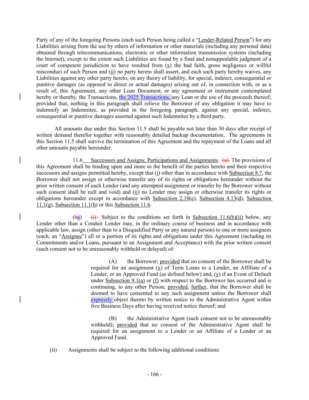 Party of any of the foregoing Persons (each such Person being called a “Lender-Related Person”) for any Liabilities arising from the use by others of information or other materials (including any personal data) obtained through telecommunications, electronic or other information transmission systems (including the Internet), except to the extent such Liabilities are found by a final and nonappealable judgment of a court of competent jurisdiction to have resulted from (x) the bad faith, gross negligence or willful misconduct of such Person and (ii) no party hereto shall assert, and each such party hereby waives, any Liabilities against any other party hereto, on any theory of liability, for special, indirect, consequential or punitive damages (as opposed to direct or actual damages) arising out of, in connection with, or as a result of, this Agreement, any other Loan Document, or any agreement or instrument contemplated hereby or thereby, the Transactions, the 2025 Transactions, any Loan or the use of the proceeds thereof; provided that, nothing in this paragraph shall relieve the Borrower of any obligation it may have to indemnify an Indemnitee, as provided in the foregoing paragraph, against any special, indirect, consequential or punitive damages asserted against such Indemnitee by a third party. All amounts due under this Section 11.5 shall be payable not later than 30 days after receipt of written demand therefor together with reasonably detailed backup documentation. The agreements in this Section 11.5 shall survive the termination of this Agreement and the repayment of the Loans and all other amounts payable hereunder. 11.6 Successors and Assigns; Participations and Assignments. (a) The provisions of this Agreement shall be binding upon and inure to the benefit of the parties hereto and their respective successors and assigns permitted hereby, except that (i) other than in accordance with Subsection 8.7, the Borrower shall not assign or otherwise transfer any of its rights or obligations hereunder without the prior written consent of each Lender (and any attempted assignment or transfer by the Borrower without such consent shall be null and void) and (ii) no Lender may assign or otherwise transfer its rights or obligations hereunder except in accordance with Subsection 2.10(e), Subsection 4.13(d), Subsection 11.1(g), Subsection 11.1(h) or this Subsection 11.6. (ba) (i) Subject to the conditions set forth in Subsection 11.6(b)(ii) below, any Lender other than a Conduit Lender may, in the ordinary course of business and in accordance with applicable law, assign (other than to a Disqualified Party or any natural person) to one or more assignees (each, an “Assignee”) all or a portion of its rights and obligations under this Agreement (including its Commitments and/or Loans, pursuant to an Assignment and Acceptance) with the prior written consent (such consent not to be unreasonably withheld or delayed) of: (A) the Borrower; provided that no consent of the Borrower shall be required for an assignment (x) of Term Loans to a Lender, an Affiliate of a Lender, or an Approved Fund (as defined below) and, (y) if an Event of Default under Subsection 9.1(a) or (f) with respect to the Borrower has occurred and is continuing, to any other Person; provided, further, that the Borrower shall be deemed to have consented to any such assignment unless the Borrower shall expressly object thereto by written notice to the Administrative Agent within five Business Days after having received notice thereof; and (B) the Administrative Agent (such consent not to be unreasonably withheld); provided that no consent of the Administrative Agent shall be required for an assignment to a Lender or an Affiliate of a Lender or an Approved Fund. (ii) Assignments shall be subject to the following additional conditions: - 166 -
