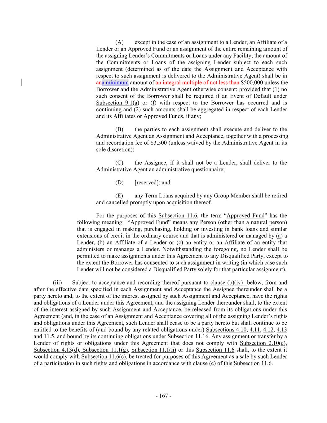 (A) except in the case of an assignment to a Lender, an Affiliate of a Lender or an Approved Fund or an assignment of the entire remaining amount of the assigning Lender’s Commitments or Loans under any Facility, the amount of the Commitments or Loans of the assigning Lender subject to each such assignment (determined as of the date the Assignment and Acceptance with respect to such assignment is delivered to the Administrative Agent) shall be in ana minimum amount of an integral multiple of not less than $500,000 unless the Borrower and the Administrative Agent otherwise consent; provided that (1) no such consent of the Borrower shall be required if an Event of Default under Subsection 9.1(a) or (f) with respect to the Borrower has occurred and is continuing and (2) such amounts shall be aggregated in respect of each Lender and its Affiliates or Approved Funds, if any; (B) the parties to each assignment shall execute and deliver to the Administrative Agent an Assignment and Acceptance, together with a processing and recordation fee of $3,500 (unless waived by the Administrative Agent in its sole discretion); (C) the Assignee, if it shall not be a Lender, shall deliver to the Administrative Agent an administrative questionnaire; (D) [reserved]; and (E) any Term Loans acquired by any Group Member shall be retired and cancelled promptly upon acquisition thereof. For the purposes of this Subsection 11.6, the term “Approved Fund” has the following meaning: “Approved Fund” means any Person (other than a natural person) that is engaged in making, purchasing, holding or investing in bank loans and similar extensions of credit in the ordinary course and that is administered or managed by (a) a Lender, (b) an Affiliate of a Lender or (c) an entity or an Affiliate of an entity that administers or manages a Lender. Notwithstanding the foregoing, no Lender shall be permitted to make assignments under this Agreement to any Disqualified Party, except to the extent the Borrower has consented to such assignment in writing (in which case such Lender will not be considered a Disqualified Party solely for that particular assignment). (iii) Subject to acceptance and recording thereof pursuant to clause (b)(iv) below, from and after the effective date specified in each Assignment and Acceptance the Assignee thereunder shall be a party hereto and, to the extent of the interest assigned by such Assignment and Acceptance, have the rights and obligations of a Lender under this Agreement, and the assigning Lender thereunder shall, to the extent of the interest assigned by such Assignment and Acceptance, be released from its obligations under this Agreement (and, in the case of an Assignment and Acceptance covering all of the assigning Lender’s rights and obligations under this Agreement, such Lender shall cease to be a party hereto but shall continue to be entitled to the benefits of (and bound by any related obligations under) Subsections 4.10, 4.11, 4.12, 4.13 and 11.5, and bound by its continuing obligations under Subsection 11.16. Any assignment or transfer by a Lender of rights or obligations under this Agreement that does not comply with Subsection 2.10(e), Subsection 4.13(d), Subsection 11.1(g), Subsection 11.1(h) or this Subsection 11.6 shall, to the extent it would comply with Subsection 11.6(c), be treated for purposes of this Agreement as a sale by such Lender of a participation in such rights and obligations in accordance with clause (c) of this Subsection 11.6. - 167 -