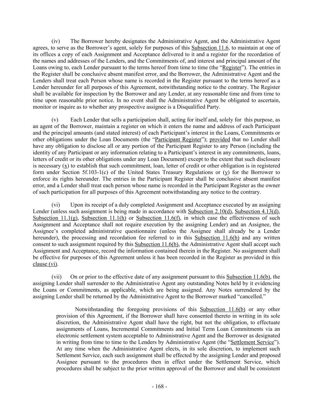 (iv) The Borrower hereby designates the Administrative Agent, and the Administrative Agent agrees, to serve as the Borrower’s agent, solely for purposes of this Subsection 11.6, to maintain at one of its offices a copy of each Assignment and Acceptance delivered to it and a register for the recordation of the names and addresses of the Lenders, and the Commitments of, and interest and principal amount of the Loans owing to, each Lender pursuant to the terms hereof from time to time (the “Register”). The entries in the Register shall be conclusive absent manifest error, and the Borrower, the Administrative Agent and the Lenders shall treat each Person whose name is recorded in the Register pursuant to the terms hereof as a Lender hereunder for all purposes of this Agreement, notwithstanding notice to the contrary. The Register shall be available for inspection by the Borrower and any Lender, at any reasonable time and from time to time upon reasonable prior notice. In no event shall the Administrative Agent be obligated to ascertain, monitor or inquire as to whether any prospective assignee is a Disqualified Party. (v) Each Lender that sells a participation shall, acting for itself and, solely for this purpose, as an agent of the Borrower, maintain a register on which it enters the name and address of each Participant and the principal amounts (and stated interest) of each Participant’s interest in the Loans, Commitments or other obligations under the Loan Documents (the “Participant Register”); provided that no Lender shall have any obligation to disclose all or any portion of the Participant Register to any Person (including the identity of any Participant or any information relating to a Participant’s interest in any commitments, loans, letters of credit or its other obligations under any Loan Document) except to the extent that such disclosure is necessary (x) to establish that such commitment, loan, letter of credit or other obligation is in registered form under Section 5f.103-1(c) of the United States Treasury Regulations or (y) for the Borrower to enforce its rights hereunder. The entries in the Participant Register shall be conclusive absent manifest error, and a Lender shall treat each person whose name is recorded in the Participant Register as the owner of such participation for all purposes of this Agreement notwithstanding any notice to the contrary. (vi) Upon its receipt of a duly completed Assignment and Acceptance executed by an assigning Lender (unless such assignment is being made in accordance with Subsection 2.10(d), Subsection 4.13(d), Subsection 11.1(g), Subsection 11.1(h) or Subsection 11.6(f), in which case the effectiveness of such Assignment and Acceptance shall not require execution by the assigning Lender) and an Assignee, the Assignee’s completed administrative questionnaire (unless the Assignee shall already be a Lender hereunder), the processing and recordation fee referred to in this Subsection 11.6(b) and any written consent to such assignment required by this Subsection 11.6(b), the Administrative Agent shall accept such Assignment and Acceptance, record the information contained therein in the Register. No assignment shall be effective for purposes of this Agreement unless it has been recorded in the Register as provided in this clause (vi). (vii) On or prior to the effective date of any assignment pursuant to this Subsection 11.6(b), the assigning Lender shall surrender to the Administrative Agent any outstanding Notes held by it evidencing the Loans or Commitments, as applicable, which are being assigned. Any Notes surrendered by the assigning Lender shall be returned by the Administrative Agent to the Borrower marked “cancelled.” Notwithstanding the foregoing provisions of this Subsection 11.6(b) or any other provision of this Agreement, if the Borrower shall have consented thereto in writing in its sole discretion, the Administrative Agent shall have the right, but not the obligation, to effectuate assignments of Loans, Incremental Commitments and Initial Term Loan Commitments via an electronic settlement system acceptable to Administrative Agent and the Borrower as designated in writing from time to time to the Lenders by Administrative Agent (the “Settlement Service”). At any time when the Administrative Agent elects, in its sole discretion, to implement such Settlement Service, each such assignment shall be effected by the assigning Lender and proposed Assignee pursuant to the procedures then in effect under the Settlement Service, which procedures shall be subject to the prior written approval of the Borrower and shall be consistent - 168 -