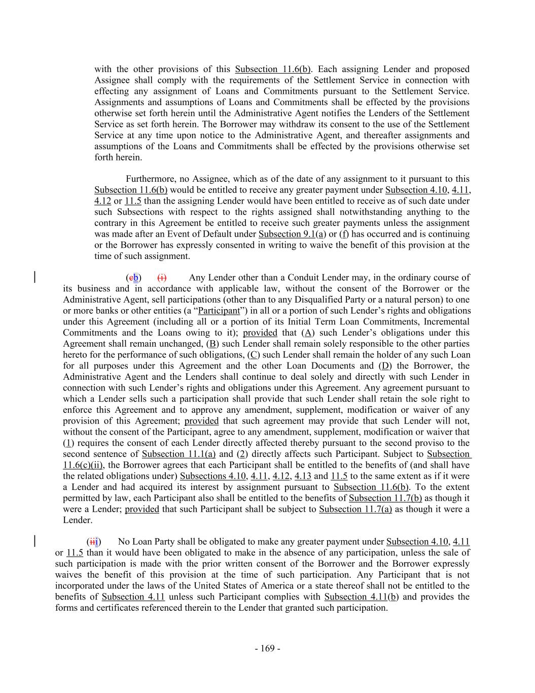 with the other provisions of this Subsection 11.6(b). Each assigning Lender and proposed Assignee shall comply with the requirements of the Settlement Service in connection with effecting any assignment of Loans and Commitments pursuant to the Settlement Service. Assignments and assumptions of Loans and Commitments shall be effected by the provisions otherwise set forth herein until the Administrative Agent notifies the Lenders of the Settlement Service as set forth herein. The Borrower may withdraw its consent to the use of the Settlement Service at any time upon notice to the Administrative Agent, and thereafter assignments and assumptions of the Loans and Commitments shall be effected by the provisions otherwise set forth herein. Furthermore, no Assignee, which as of the date of any assignment to it pursuant to this Subsection 11.6(b) would be entitled to receive any greater payment under Subsection 4.10, 4.11, 4.12 or 11.5 than the assigning Lender would have been entitled to receive as of such date under such Subsections with respect to the rights assigned shall notwithstanding anything to the contrary in this Agreement be entitled to receive such greater payments unless the assignment was made after an Event of Default under Subsection 9.1(a) or (f) has occurred and is continuing or the Borrower has expressly consented in writing to waive the benefit of this provision at the time of such assignment. (cb) (i) Any Lender other than a Conduit Lender may, in the ordinary course of its business and in accordance with applicable law, without the consent of the Borrower or the Administrative Agent, sell participations (other than to any Disqualified Party or a natural person) to one or more banks or other entities (a “Participant”) in all or a portion of such Lender’s rights and obligations under this Agreement (including all or a portion of its Initial Term Loan Commitments, Incremental Commitments and the Loans owing to it); provided that (A) such Lender’s obligations under this Agreement shall remain unchanged, (B) such Lender shall remain solely responsible to the other parties hereto for the performance of such obligations, (C) such Lender shall remain the holder of any such Loan for all purposes under this Agreement and the other Loan Documents and (D) the Borrower, the Administrative Agent and the Lenders shall continue to deal solely and directly with such Lender in connection with such Lender’s rights and obligations under this Agreement. Any agreement pursuant to which a Lender sells such a participation shall provide that such Lender shall retain the sole right to enforce this Agreement and to approve any amendment, supplement, modification or waiver of any provision of this Agreement; provided that such agreement may provide that such Lender will not, without the consent of the Participant, agree to any amendment, supplement, modification or waiver that (1) requires the consent of each Lender directly affected thereby pursuant to the second proviso to the second sentence of Subsection 11.1(a) and (2) directly affects such Participant. Subject to Subsection 11.6(c)(ii), the Borrower agrees that each Participant shall be entitled to the benefits of (and shall have the related obligations under) Subsections 4.10, 4.11, 4.12, 4.13 and 11.5 to the same extent as if it were a Lender and had acquired its interest by assignment pursuant to Subsection 11.6(b). To the extent permitted by law, each Participant also shall be entitled to the benefits of Subsection 11.7(b) as though it were a Lender; provided that such Participant shall be subject to Subsection 11.7(a) as though it were a Lender. (iii) No Loan Party shall be obligated to make any greater payment under Subsection 4.10, 4.11 or 11.5 than it would have been obligated to make in the absence of any participation, unless the sale of such participation is made with the prior written consent of the Borrower and the Borrower expressly waives the benefit of this provision at the time of such participation. Any Participant that is not incorporated under the laws of the United States of America or a state thereof shall not be entitled to the benefits of Subsection 4.11 unless such Participant complies with Subsection 4.11(b) and provides the forms and certificates referenced therein to the Lender that granted such participation. - 169 -