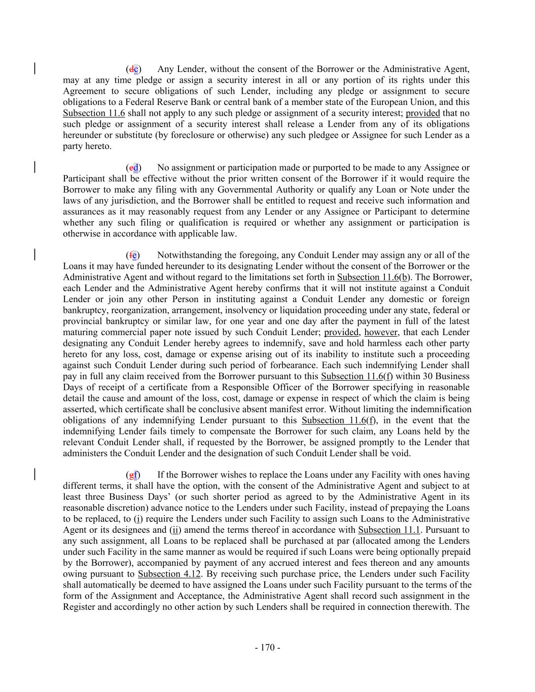 (dc) Any Lender, without the consent of the Borrower or the Administrative Agent, may at any time pledge or assign a security interest in all or any portion of its rights under this Agreement to secure obligations of such Lender, including any pledge or assignment to secure obligations to a Federal Reserve Bank or central bank of a member state of the European Union, and this Subsection 11.6 shall not apply to any such pledge or assignment of a security interest; provided that no such pledge or assignment of a security interest shall release a Lender from any of its obligations hereunder or substitute (by foreclosure or otherwise) any such pledgee or Assignee for such Lender as a party hereto. (ed) No assignment or participation made or purported to be made to any Assignee or Participant shall be effective without the prior written consent of the Borrower if it would require the Borrower to make any filing with any Governmental Authority or qualify any Loan or Note under the laws of any jurisdiction, and the Borrower shall be entitled to request and receive such information and assurances as it may reasonably request from any Lender or any Assignee or Participant to determine whether any such filing or qualification is required or whether any assignment or participation is otherwise in accordance with applicable law. (fe) Notwithstanding the foregoing, any Conduit Lender may assign any or all of the Loans it may have funded hereunder to its designating Lender without the consent of the Borrower or the Administrative Agent and without regard to the limitations set forth in Subsection 11.6(b). The Borrower, each Lender and the Administrative Agent hereby confirms that it will not institute against a Conduit Lender or join any other Person in instituting against a Conduit Lender any domestic or foreign bankruptcy, reorganization, arrangement, insolvency or liquidation proceeding under any state, federal or provincial bankruptcy or similar law, for one year and one day after the payment in full of the latest maturing commercial paper note issued by such Conduit Lender; provided, however, that each Lender designating any Conduit Lender hereby agrees to indemnify, save and hold harmless each other party hereto for any loss, cost, damage or expense arising out of its inability to institute such a proceeding against such Conduit Lender during such period of forbearance. Each such indemnifying Lender shall pay in full any claim received from the Borrower pursuant to this Subsection 11.6(f) within 30 Business Days of receipt of a certificate from a Responsible Officer of the Borrower specifying in reasonable detail the cause and amount of the loss, cost, damage or expense in respect of which the claim is being asserted, which certificate shall be conclusive absent manifest error. Without limiting the indemnification obligations of any indemnifying Lender pursuant to this Subsection 11.6(f), in the event that the indemnifying Lender fails timely to compensate the Borrower for such claim, any Loans held by the relevant Conduit Lender shall, if requested by the Borrower, be assigned promptly to the Lender that administers the Conduit Lender and the designation of such Conduit Lender shall be void. (gf) If the Borrower wishes to replace the Loans under any Facility with ones having different terms, it shall have the option, with the consent of the Administrative Agent and subject to at least three Business Days’ (or such shorter period as agreed to by the Administrative Agent in its reasonable discretion) advance notice to the Lenders under such Facility, instead of prepaying the Loans to be replaced, to (i) require the Lenders under such Facility to assign such Loans to the Administrative Agent or its designees and (ii) amend the terms thereof in accordance with Subsection 11.1. Pursuant to any such assignment, all Loans to be replaced shall be purchased at par (allocated among the Lenders under such Facility in the same manner as would be required if such Loans were being optionally prepaid by the Borrower), accompanied by payment of any accrued interest and fees thereon and any amounts owing pursuant to Subsection 4.12. By receiving such purchase price, the Lenders under such Facility shall automatically be deemed to have assigned the Loans under such Facility pursuant to the terms of the form of the Assignment and Acceptance, the Administrative Agent shall record such assignment in the Register and accordingly no other action by such Lenders shall be required in connection therewith. The - 170 -