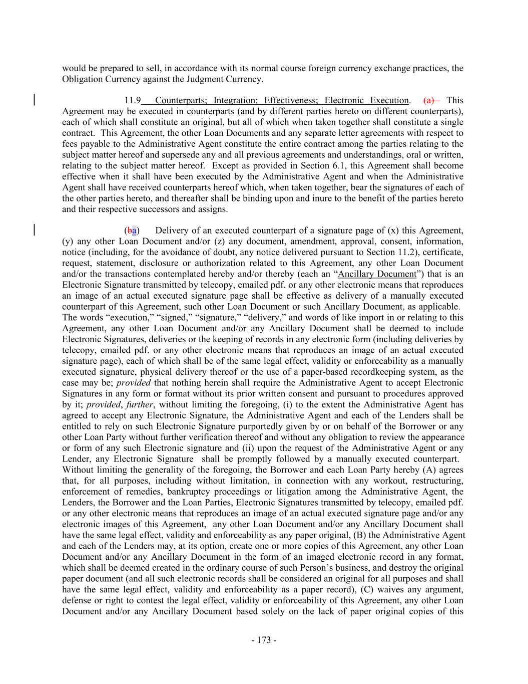 would be prepared to sell, in accordance with its normal course foreign currency exchange practices, the Obligation Currency against the Judgment Currency. 11.9 Counterparts; Integration; Effectiveness; Electronic Execution. (a) This Agreement may be executed in counterparts (and by different parties hereto on different counterparts), each of which shall constitute an original, but all of which when taken together shall constitute a single contract. This Agreement, the other Loan Documents and any separate letter agreements with respect to fees payable to the Administrative Agent constitute the entire contract among the parties relating to the subject matter hereof and supersede any and all previous agreements and understandings, oral or written, relating to the subject matter hereof. Except as provided in Section 6.1, this Agreement shall become effective when it shall have been executed by the Administrative Agent and when the Administrative Agent shall have received counterparts hereof which, when taken together, bear the signatures of each of the other parties hereto, and thereafter shall be binding upon and inure to the benefit of the parties hereto and their respective successors and assigns. (ba) Delivery of an executed counterpart of a signature page of (x) this Agreement, (y) any other Loan Document and/or (z) any document, amendment, approval, consent, information, notice (including, for the avoidance of doubt, any notice delivered pursuant to Section 11.2), certificate, request, statement, disclosure or authorization related to this Agreement, any other Loan Document and/or the transactions contemplated hereby and/or thereby (each an “Ancillary Document”) that is an Electronic Signature transmitted by telecopy, emailed pdf. or any other electronic means that reproduces an image of an actual executed signature page shall be effective as delivery of a manually executed counterpart of this Agreement, such other Loan Document or such Ancillary Document, as applicable. The words “execution,” “signed,” “signature,” “delivery,” and words of like import in or relating to this Agreement, any other Loan Document and/or any Ancillary Document shall be deemed to include Electronic Signatures, deliveries or the keeping of records in any electronic form (including deliveries by telecopy, emailed pdf. or any other electronic means that reproduces an image of an actual executed signature page), each of which shall be of the same legal effect, validity or enforceability as a manually executed signature, physical delivery thereof or the use of a paper-based recordkeeping system, as the case may be; provided that nothing herein shall require the Administrative Agent to accept Electronic Signatures in any form or format without its prior written consent and pursuant to procedures approved by it; provided, further, without limiting the foregoing, (i) to the extent the Administrative Agent has agreed to accept any Electronic Signature, the Administrative Agent and each of the Lenders shall be entitled to rely on such Electronic Signature purportedly given by or on behalf of the Borrower or any other Loan Party without further verification thereof and without any obligation to review the appearance or form of any such Electronic signature and (ii) upon the request of the Administrative Agent or any Lender, any Electronic Signature shall be promptly followed by a manually executed counterpart. Without limiting the generality of the foregoing, the Borrower and each Loan Party hereby (A) agrees that, for all purposes, including without limitation, in connection with any workout, restructuring, enforcement of remedies, bankruptcy proceedings or litigation among the Administrative Agent, the Lenders, the Borrower and the Loan Parties, Electronic Signatures transmitted by telecopy, emailed pdf. or any other electronic means that reproduces an image of an actual executed signature page and/or any electronic images of this Agreement, any other Loan Document and/or any Ancillary Document shall have the same legal effect, validity and enforceability as any paper original, (B) the Administrative Agent and each of the Lenders may, at its option, create one or more copies of this Agreement, any other Loan Document and/or any Ancillary Document in the form of an imaged electronic record in any format, which shall be deemed created in the ordinary course of such Person’s business, and destroy the original paper document (and all such electronic records shall be considered an original for all purposes and shall have the same legal effect, validity and enforceability as a paper record), (C) waives any argument, defense or right to contest the legal effect, validity or enforceability of this Agreement, any other Loan Document and/or any Ancillary Document based solely on the lack of paper original copies of this - 173 -