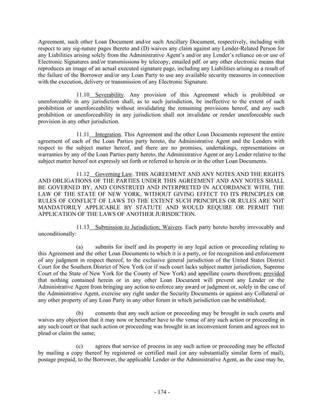Agreement, such other Loan Document and/or such Ancillary Document, respectively, including with respect to any sig-nature pages thereto and (D) waives any claim against any Lender-Related Person for any Liabilities arising solely from the Administrative Agent’s and/or any Lender’s reliance on or use of Electronic Signatures and/or transmissions by telecopy, emailed pdf. or any other electronic means that reproduces an image of an actual executed signature page, including any Liabilities arising as a result of the failure of the Borrower and/or any Loan Party to use any available security measures in connection with the execution, delivery or transmission of any Electronic Signature. 11.10 Severability. Any provision of this Agreement which is prohibited or unenforceable in any jurisdiction shall, as to such jurisdiction, be ineffective to the extent of such prohibition or unenforceability without invalidating the remaining provisions hereof, and any such prohibition or unenforceability in any jurisdiction shall not invalidate or render unenforceable such provision in any other jurisdiction. 11.11 Integration. This Agreement and the other Loan Documents represent the entire agreement of each of the Loan Parties party hereto, the Administrative Agent and the Lenders with respect to the subject matter hereof, and there are no promises, undertakings, representations or warranties by any of the Loan Parties party hereto, the Administrative Agent or any Lender relative to the subject matter hereof not expressly set forth or referred to herein or in the other Loan Documents. 11.12 Governing Law. THIS AGREEMENT AND ANY NOTES AND THE RIGHTS AND OBLIGATIONS OF THE PARTIES UNDER THIS AGREEMENT AND ANY NOTES SHALL BE GOVERNED BY, AND CONSTRUED AND INTERPRETED IN ACCORDANCE WITH, THE LAW OF THE STATE OF NEW YORK, WITHOUT GIVING EFFECT TO ITS PRINCIPLES OR RULES OF CONFLICT OF LAWS TO THE EXTENT SUCH PRINCIPLES OR RULES ARE NOT MANDATORILY APPLICABLE BY STATUTE AND WOULD REQUIRE OR PERMIT THE APPLICATION OF THE LAWS OF ANOTHER JURISDICTION. 11.13 Submission to Jurisdiction; Waivers. Each party hereto hereby irrevocably and unconditionally: (a) submits for itself and its property in any legal action or proceeding relating to this Agreement and the other Loan Documents to which it is a party, or for recognition and enforcement of any judgment in respect thereof, to the exclusive general jurisdiction of the United States District Court for the Southern District of New York (or if such court lacks subject matter jurisdiction, Supreme Court of the State of New York for the County of New York) and appellate courts therefrom; provided that nothing contained herein or in any other Loan Document will prevent any Lender or the Administrative Agent from bringing any action to enforce any award or judgment or, solely in the case of the Administrative Agent, exercise any right under the Security Documents or against any Collateral or any other property of any Loan Party in any other forum in which jurisdiction can be established; (b) consents that any such action or proceeding may be brought in such courts and waives any objection that it may now or hereafter have to the venue of any such action or proceeding in any such court or that such action or proceeding was brought in an inconvenient forum and agrees not to plead or claim the same; (c) agrees that service of process in any such action or proceeding may be effected by mailing a copy thereof by registered or certified mail (or any substantially similar form of mail), postage prepaid, to the Borrower, the applicable Lender or the Administrative Agent, as the case may be, - 174 -