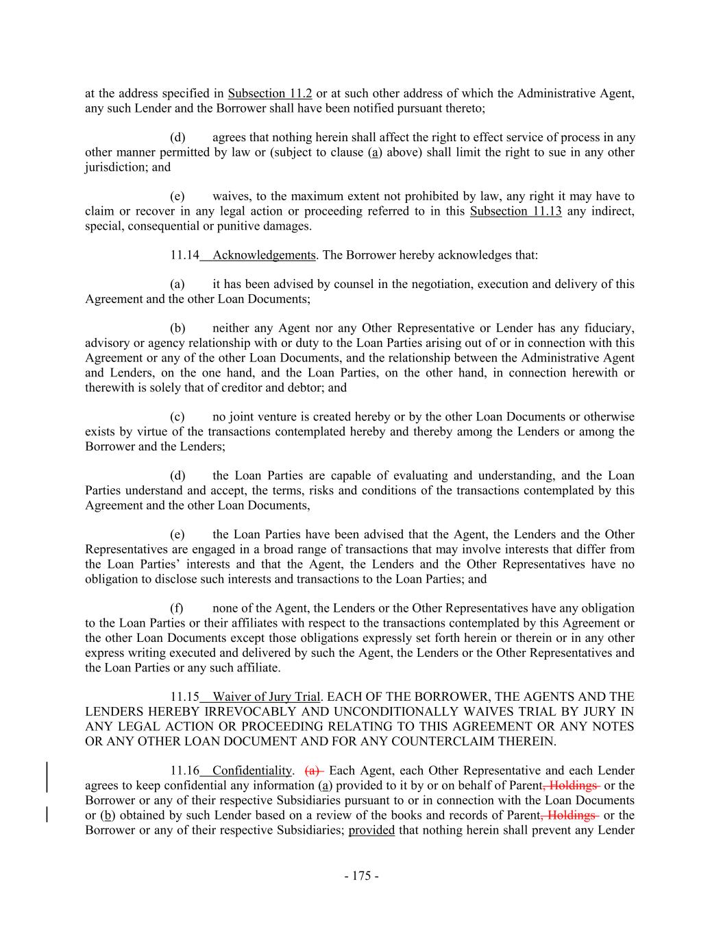 at the address specified in Subsection 11.2 or at such other address of which the Administrative Agent, any such Lender and the Borrower shall have been notified pursuant thereto; (d) agrees that nothing herein shall affect the right to effect service of process in any other manner permitted by law or (subject to clause (a) above) shall limit the right to sue in any other jurisdiction; and (e) waives, to the maximum extent not prohibited by law, any right it may have to claim or recover in any legal action or proceeding referred to in this Subsection 11.13 any indirect, special, consequential or punitive damages. 11.14 Acknowledgements. The Borrower hereby acknowledges that: (a) it has been advised by counsel in the negotiation, execution and delivery of this Agreement and the other Loan Documents; (b) neither any Agent nor any Other Representative or Lender has any fiduciary, advisory or agency relationship with or duty to the Loan Parties arising out of or in connection with this Agreement or any of the other Loan Documents, and the relationship between the Administrative Agent and Lenders, on the one hand, and the Loan Parties, on the other hand, in connection herewith or therewith is solely that of creditor and debtor; and (c) no joint venture is created hereby or by the other Loan Documents or otherwise exists by virtue of the transactions contemplated hereby and thereby among the Lenders or among the Borrower and the Lenders; (d) the Loan Parties are capable of evaluating and understanding, and the Loan Parties understand and accept, the terms, risks and conditions of the transactions contemplated by this Agreement and the other Loan Documents, (e) the Loan Parties have been advised that the Agent, the Lenders and the Other Representatives are engaged in a broad range of transactions that may involve interests that differ from the Loan Parties’ interests and that the Agent, the Lenders and the Other Representatives have no obligation to disclose such interests and transactions to the Loan Parties; and (f) none of the Agent, the Lenders or the Other Representatives have any obligation to the Loan Parties or their affiliates with respect to the transactions contemplated by this Agreement or the other Loan Documents except those obligations expressly set forth herein or therein or in any other express writing executed and delivered by such the Agent, the Lenders or the Other Representatives and the Loan Parties or any such affiliate. 11.15 Waiver of Jury Trial. EACH OF THE BORROWER, THE AGENTS AND THE LENDERS HEREBY IRREVOCABLY AND UNCONDITIONALLY WAIVES TRIAL BY JURY IN ANY LEGAL ACTION OR PROCEEDING RELATING TO THIS AGREEMENT OR ANY NOTES OR ANY OTHER LOAN DOCUMENT AND FOR ANY COUNTERCLAIM THEREIN. 11.16 Confidentiality. (a) Each Agent, each Other Representative and each Lender agrees to keep confidential any information (a) provided to it by or on behalf of Parent, Holdings or the Borrower or any of their respective Subsidiaries pursuant to or in connection with the Loan Documents or (b) obtained by such Lender based on a review of the books and records of Parent, Holdings or the Borrower or any of their respective Subsidiaries; provided that nothing herein shall prevent any Lender - 175 -