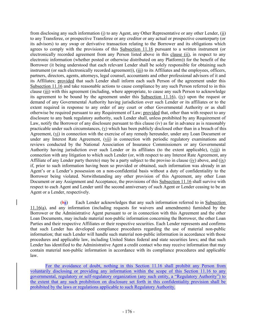 from disclosing any such information (i) to any Agent, any Other Representative or any other Lender, (ii) to any Transferee, or prospective Transferee or any creditor or any actual or prospective counterparty (or its advisors) to any swap or derivative transaction relating to the Borrower and its obligations which agrees to comply with the provisions of this Subsection 11.16 pursuant to a written instrument (or electronically recorded agreement from any Person listed above in this clause (ii), in respect to any electronic information (whether posted or otherwise distributed on any Platform)) for the benefit of the Borrower (it being understood that each relevant Lender shall be solely responsible for obtaining such instrument (or such electronically recorded agreement)), (iii) to its Affiliates and the employees, officers, partners, directors, agents, attorneys, legal counsel, accountants and other professional advisors of it and its Affiliates; provided that such Lender shall inform each such Person of the agreement under this Subsection 11.16 and take reasonable actions to cause compliance by any such Person referred to in this clause (iii) with this agreement (including, where appropriate, to cause any such Person to acknowledge its agreement to be bound by the agreement under this Subsection 11.16), (iv) upon the request or demand of any Governmental Authority having jurisdiction over such Lender or its affiliates or to the extent required in response to any order of any court or other Governmental Authority or as shall otherwise be required pursuant to any Requirement of Law; provided that, other than with respect to any disclosure to any bank regulatory authority, such Lender shall, unless prohibited by any Requirement of Law, notify the Borrower of any disclosure pursuant to this clause (iv) as far in advance as is reasonably practicable under such circumstances, (v) which has been publicly disclosed other than in a breach of this Agreement, (vi) in connection with the exercise of any remedy hereunder, under any Loan Document or under any Interest Rate Agreement, (vii) in connection with periodic regulatory examinations and reviews conducted by the National Association of Insurance Commissioners or any Governmental Authority having jurisdiction over such Lender or its affiliates (to the extent applicable), (viii) in connection with any litigation to which such Lender (or, with respect to any Interest Rate Agreement, any Affiliate of any Lender party thereto) may be a party subject to the proviso in clause (iv) above, and (ix) if, prior to such information having been so provided or obtained, such information was already in an Agent’s or a Lender’s possession on a non-confidential basis without a duty of confidentiality to the Borrower being violated. Notwithstanding any other provision of this Agreement, any other Loan Document or any Assignment and Acceptance, the provisions of this Subsection 11.16 shall survive with respect to each Agent and Lender until the second anniversary of such Agent or Lender ceasing to be an Agent or a Lender, respectively. (ba) Each Lender acknowledges that any such information referred to in Subsection 11.16(a), and any information (including requests for waivers and amendments) furnished by the Borrower or the Administrative Agent pursuant to or in connection with this Agreement and the other Loan Documents, may include material non-public information concerning the Borrower, the other Loan Parties and their respective Affiliates or their respective securities. Each Lender represents and confirms that such Lender has developed compliance procedures regarding the use of material non-public information; that such Lender will handle such material non-public information in accordance with those procedures and applicable law, including United States federal and state securities laws; and that such Lender has identified to the Administrative Agent a credit contact who may receive information that may contain material non-public information in accordance with its compliance procedures and applicable law. For the avoidance of doubt, nothing in this Section 11.16 shall prohibit any Person from voluntarily disclosing or providing any information within the scope of this Section 11.16 to any governmental, regulatory or self-regulatory organization (any such entity, a “Regulatory Authority”) to the extent that any such prohibition on disclosure set forth in this confidentiality provision shall be prohibited by the laws or regulations applicable to such Regulatory Authority. - 176 -