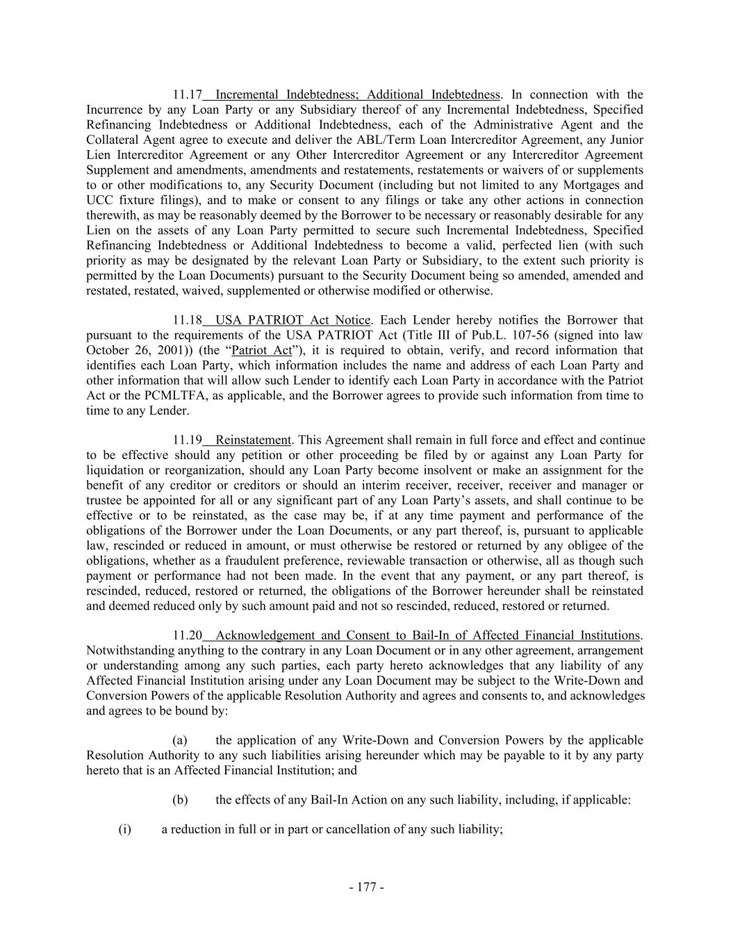 11.17 Incremental Indebtedness; Additional Indebtedness. In connection with the Incurrence by any Loan Party or any Subsidiary thereof of any Incremental Indebtedness, Specified Refinancing Indebtedness or Additional Indebtedness, each of the Administrative Agent and the Collateral Agent agree to execute and deliver the ABL/Term Loan Intercreditor Agreement, any Junior Lien Intercreditor Agreement or any Other Intercreditor Agreement or any Intercreditor Agreement Supplement and amendments, amendments and restatements, restatements or waivers of or supplements to or other modifications to, any Security Document (including but not limited to any Mortgages and UCC fixture filings), and to make or consent to any filings or take any other actions in connection therewith, as may be reasonably deemed by the Borrower to be necessary or reasonably desirable for any Lien on the assets of any Loan Party permitted to secure such Incremental Indebtedness, Specified Refinancing Indebtedness or Additional Indebtedness to become a valid, perfected lien (with such priority as may be designated by the relevant Loan Party or Subsidiary, to the extent such priority is permitted by the Loan Documents) pursuant to the Security Document being so amended, amended and restated, restated, waived, supplemented or otherwise modified or otherwise. 11.18 USA PATRIOT Act Notice. Each Lender hereby notifies the Borrower that pursuant to the requirements of the USA PATRIOT Act (Title III of Pub.L. 107-56 (signed into law October 26, 2001)) (the “Patriot Act”), it is required to obtain, verify, and record information that identifies each Loan Party, which information includes the name and address of each Loan Party and other information that will allow such Lender to identify each Loan Party in accordance with the Patriot Act or the PCMLTFA, as applicable, and the Borrower agrees to provide such information from time to time to any Lender. 11.19 Reinstatement. This Agreement shall remain in full force and effect and continue to be effective should any petition or other proceeding be filed by or against any Loan Party for liquidation or reorganization, should any Loan Party become insolvent or make an assignment for the benefit of any creditor or creditors or should an interim receiver, receiver, receiver and manager or trustee be appointed for all or any significant part of any Loan Party’s assets, and shall continue to be effective or to be reinstated, as the case may be, if at any time payment and performance of the obligations of the Borrower under the Loan Documents, or any part thereof, is, pursuant to applicable law, rescinded or reduced in amount, or must otherwise be restored or returned by any obligee of the obligations, whether as a fraudulent preference, reviewable transaction or otherwise, all as though such payment or performance had not been made. In the event that any payment, or any part thereof, is rescinded, reduced, restored or returned, the obligations of the Borrower hereunder shall be reinstated and deemed reduced only by such amount paid and not so rescinded, reduced, restored or returned. 11.20 Acknowledgement and Consent to Bail-In of Affected Financial Institutions. Notwithstanding anything to the contrary in any Loan Document or in any other agreement, arrangement or understanding among any such parties, each party hereto acknowledges that any liability of any Affected Financial Institution arising under any Loan Document may be subject to the Write-Down and Conversion Powers of the applicable Resolution Authority and agrees and consents to, and acknowledges and agrees to be bound by: (a) the application of any Write-Down and Conversion Powers by the applicable Resolution Authority to any such liabilities arising hereunder which may be payable to it by any party hereto that is an Affected Financial Institution; and (b) the effects of any Bail-In Action on any such liability, including, if applicable: (i) a reduction in full or in part or cancellation of any such liability; - 177 -
