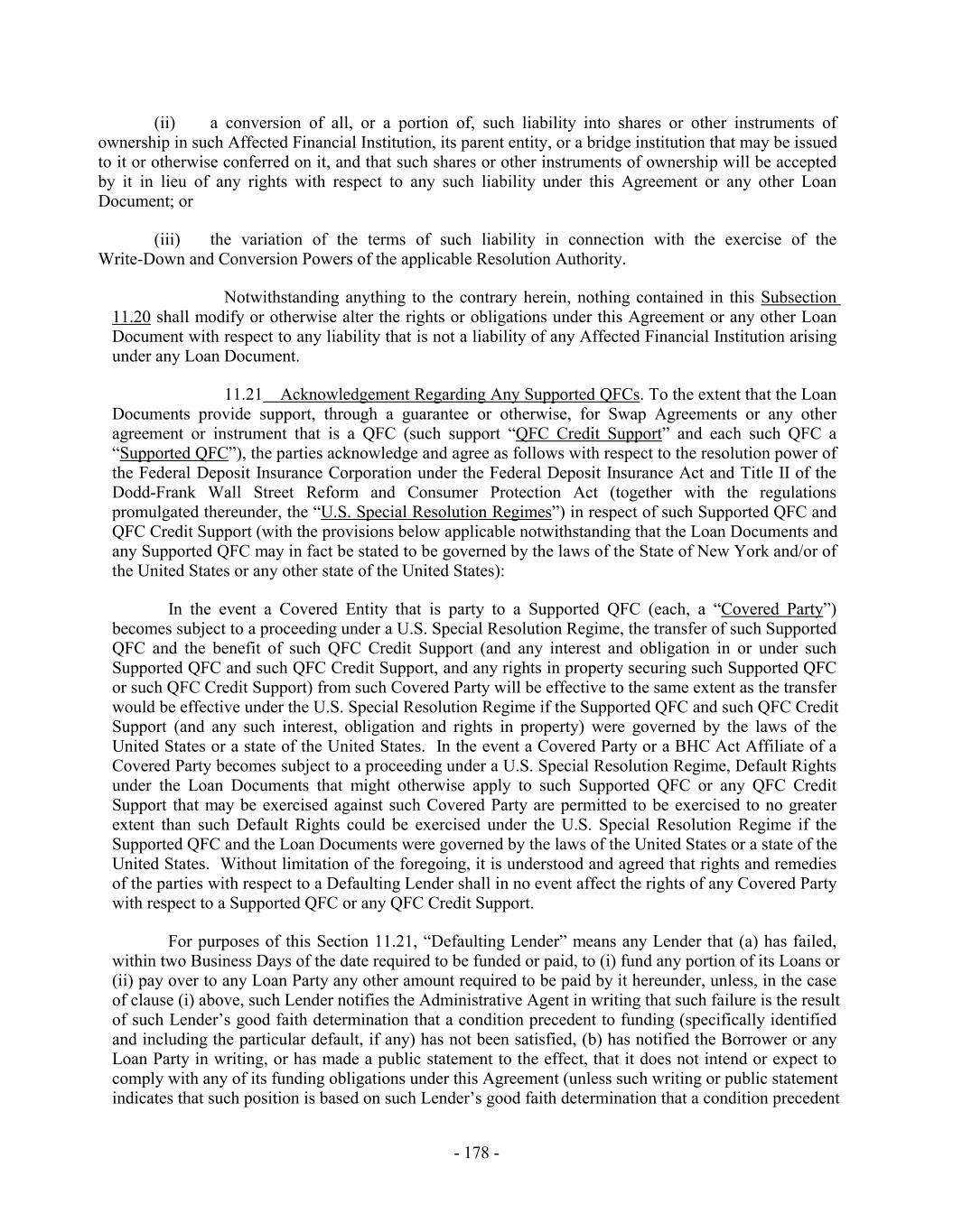 (ii) a conversion of all, or a portion of, such liability into shares or other instruments of ownership in such Affected Financial Institution, its parent entity, or a bridge institution that may be issued to it or otherwise conferred on it, and that such shares or other instruments of ownership will be accepted by it in lieu of any rights with respect to any such liability under this Agreement or any other Loan Document; or (iii) the variation of the terms of such liability in connection with the exercise of the Write-Down and Conversion Powers of the applicable Resolution Authority. Notwithstanding anything to the contrary herein, nothing contained in this Subsection 11.20 shall modify or otherwise alter the rights or obligations under this Agreement or any other Loan Document with respect to any liability that is not a liability of any Affected Financial Institution arising under any Loan Document. 11.21 Acknowledgement Regarding Any Supported QFCs. To the extent that the Loan Documents provide support, through a guarantee or otherwise, for Swap Agreements or any other agreement or instrument that is a QFC (such support “QFC Credit Support” and each such QFC a “Supported QFC”), the parties acknowledge and agree as follows with respect to the resolution power of the Federal Deposit Insurance Corporation under the Federal Deposit Insurance Act and Title II of the Dodd-Frank Wall Street Reform and Consumer Protection Act (together with the regulations promulgated thereunder, the “U.S. Special Resolution Regimes”) in respect of such Supported QFC and QFC Credit Support (with the provisions below applicable notwithstanding that the Loan Documents and any Supported QFC may in fact be stated to be governed by the laws of the State of New York and/or of the United States or any other state of the United States): In the event a Covered Entity that is party to a Supported QFC (each, a “Covered Party”) becomes subject to a proceeding under a U.S. Special Resolution Regime, the transfer of such Supported QFC and the benefit of such QFC Credit Support (and any interest and obligation in or under such Supported QFC and such QFC Credit Support, and any rights in property securing such Supported QFC or such QFC Credit Support) from such Covered Party will be effective to the same extent as the transfer would be effective under the U.S. Special Resolution Regime if the Supported QFC and such QFC Credit Support (and any such interest, obligation and rights in property) were governed by the laws of the United States or a state of the United States. In the event a Covered Party or a BHC Act Affiliate of a Covered Party becomes subject to a proceeding under a U.S. Special Resolution Regime, Default Rights under the Loan Documents that might otherwise apply to such Supported QFC or any QFC Credit Support that may be exercised against such Covered Party are permitted to be exercised to no greater extent than such Default Rights could be exercised under the U.S. Special Resolution Regime if the Supported QFC and the Loan Documents were governed by the laws of the United States or a state of the United States. Without limitation of the foregoing, it is understood and agreed that rights and remedies of the parties with respect to a Defaulting Lender shall in no event affect the rights of any Covered Party with respect to a Supported QFC or any QFC Credit Support. For purposes of this Section 11.21, “Defaulting Lender” means any Lender that (a) has failed, within two Business Days of the date required to be funded or paid, to (i) fund any portion of its Loans or (ii) pay over to any Loan Party any other amount required to be paid by it hereunder, unless, in the case of clause (i) above, such Lender notifies the Administrative Agent in writing that such failure is the result of such Lender’s good faith determination that a condition precedent to funding (specifically identified and including the particular default, if any) has not been satisfied, (b) has notified the Borrower or any Loan Party in writing, or has made a public statement to the effect, that it does not intend or expect to comply with any of its funding obligations under this Agreement (unless such writing or public statement indicates that such position is based on such Lender’s good faith determination that a condition precedent - 178 -
