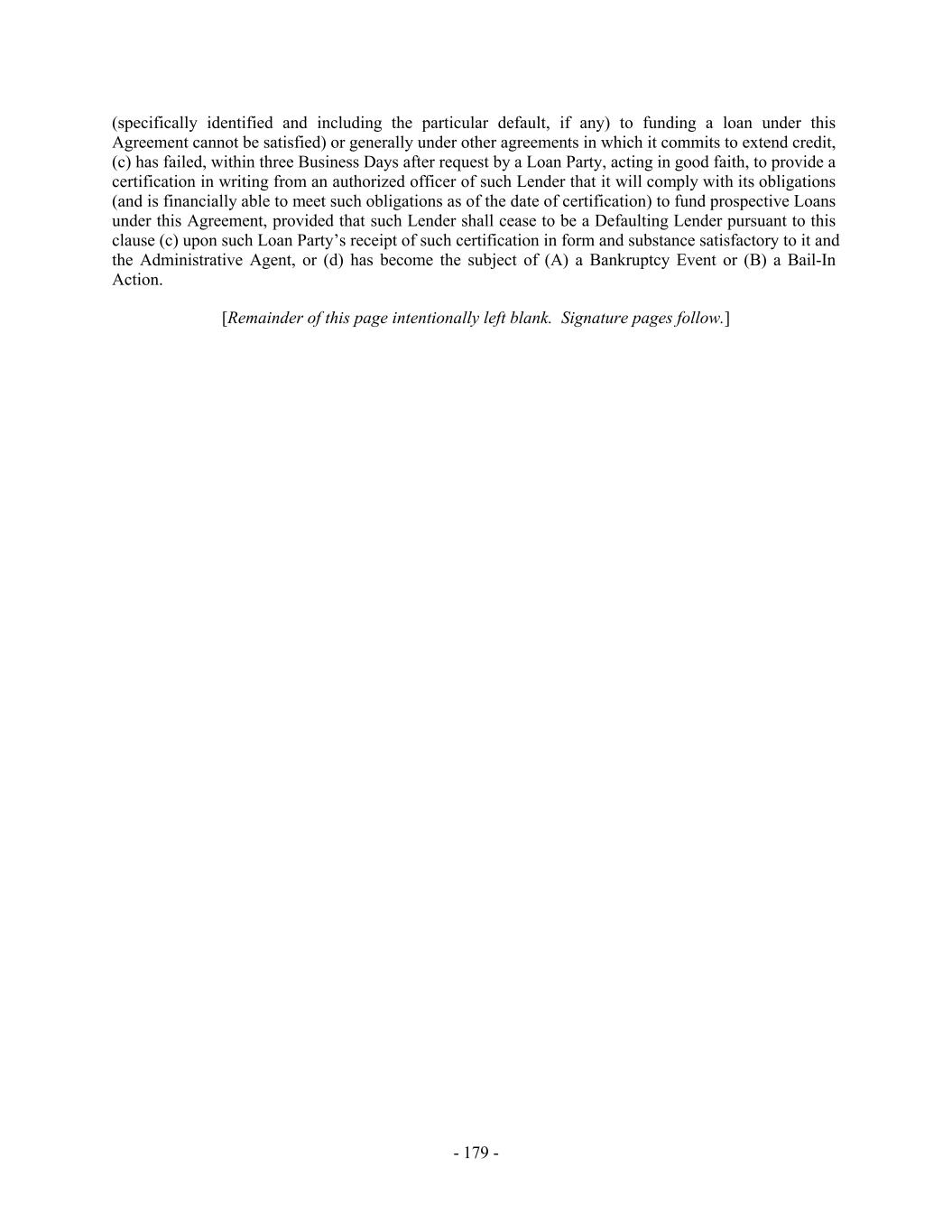 (specifically identified and including the particular default, if any) to funding a loan under this Agreement cannot be satisfied) or generally under other agreements in which it commits to extend credit, (c) has failed, within three Business Days after request by a Loan Party, acting in good faith, to provide a certification in writing from an authorized officer of such Lender that it will comply with its obligations (and is financially able to meet such obligations as of the date of certification) to fund prospective Loans under this Agreement, provided that such Lender shall cease to be a Defaulting Lender pursuant to this clause (c) upon such Loan Party’s receipt of such certification in form and substance satisfactory to it and the Administrative Agent, or (d) has become the subject of (A) a Bankruptcy Event or (B) a Bail-In Action. [Remainder of this page intentionally left blank. Signature pages follow.] - 179 -