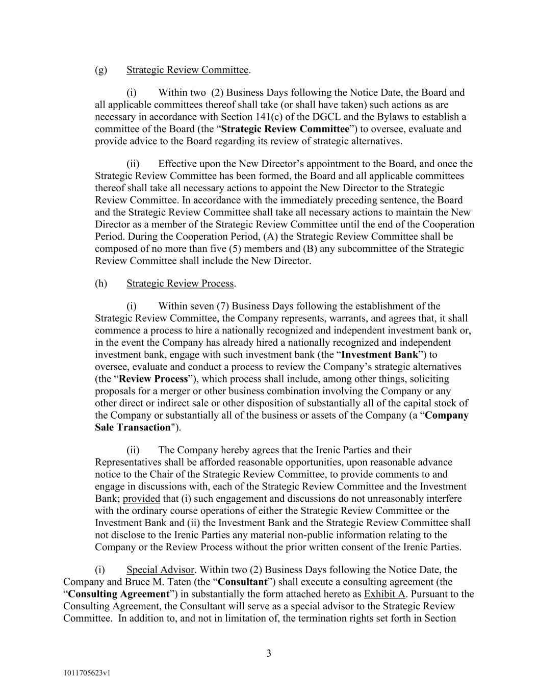3 1011705623v1 (g) Strategic Review Committee. (i) Within two (2) Business Days following the Notice Date, the Board and all applicable committees thereof shall take (or shall have taken) such actions as are necessary in accordance with Section 141(c) of the DGCL and the Bylaws to establish a committee of the Board (the “Strategic Review Committee”) to oversee, evaluate and provide advice to the Board regarding its review of strategic alternatives. (ii) Effective upon the New Director’s appointment to the Board, and once the Strategic Review Committee has been formed, the Board and all applicable committees thereof shall take all necessary actions to appoint the New Director to the Strategic Review Committee. In accordance with the immediately preceding sentence, the Board and the Strategic Review Committee shall take all necessary actions to maintain the New Director as a member of the Strategic Review Committee until the end of the Cooperation Period. During the Cooperation Period, (A) the Strategic Review Committee shall be composed of no more than five (5) members and (B) any subcommittee of the Strategic Review Committee shall include the New Director. (h) Strategic Review Process. (i) Within seven (7) Business Days following the establishment of the Strategic Review Committee, the Company represents, warrants, and agrees that, it shall commence a process to hire a nationally recognized and independent investment bank or, in the event the Company has already hired a nationally recognized and independent investment bank, engage with such investment bank (the “Investment Bank”) to oversee, evaluate and conduct a process to review the Company’s strategic alternatives (the “Review Process”), which process shall include, among other things, soliciting proposals for a merger or other business combination involving the Company or any other direct or indirect sale or other disposition of substantially all of the capital stock of the Company or substantially all of the business or assets of the Company (a “Company Sale Transaction"). (ii) The Company hereby agrees that the Irenic Parties and their Representatives shall be afforded reasonable opportunities, upon reasonable advance notice to the Chair of the Strategic Review Committee, to provide comments to and engage in discussions with, each of the Strategic Review Committee and the Investment Bank; provided that (i) such engagement and discussions do not unreasonably interfere with the ordinary course operations of either the Strategic Review Committee or the Investment Bank and (ii) the Investment Bank and the Strategic Review Committee shall not disclose to the Irenic Parties any material non-public information relating to the Company or the Review Process without the prior written consent of the Irenic Parties. (i) Special Advisor. Within two (2) Business Days following the Notice Date, the Company and Bruce M. Taten (the “Consultant”) shall execute a consulting agreement (the “Consulting Agreement”) in substantially the form attached hereto as Exhibit A. Pursuant to the Consulting Agreement, the Consultant will serve as a special advisor to the Strategic Review Committee. In addition to, and not in limitation of, the termination rights set forth in Section