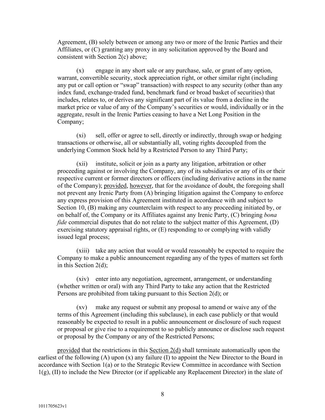 8 1011705623v1 Agreement, (B) solely between or among any two or more of the Irenic Parties and their Affiliates, or (C) granting any proxy in any solicitation approved by the Board and consistent with Section 2(c) above; (x) engage in any short sale or any purchase, sale, or grant of any option, warrant, convertible security, stock appreciation right, or other similar right (including any put or call option or “swap” transaction) with respect to any security (other than any index fund, exchange-traded fund, benchmark fund or broad basket of securities) that includes, relates to, or derives any significant part of its value from a decline in the market price or value of any of the Company’s securities or would, individually or in the aggregate, result in the Irenic Parties ceasing to have a Net Long Position in the Company; (xi) sell, offer or agree to sell, directly or indirectly, through swap or hedging transactions or otherwise, all or substantially all, voting rights decoupled from the underlying Common Stock held by a Restricted Person to any Third Party; (xii) institute, solicit or join as a party any litigation, arbitration or other proceeding against or involving the Company, any of its subsidiaries or any of its or their respective current or former directors or officers (including derivative actions in the name of the Company); provided, however, that for the avoidance of doubt, the foregoing shall not prevent any Irenic Party from (A) bringing litigation against the Company to enforce any express provision of this Agreement instituted in accordance with and subject to Section 10, (B) making any counterclaim with respect to any proceeding initiated by, or on behalf of, the Company or its Affiliates against any Irenic Party, (C) bringing bona fide commercial disputes that do not relate to the subject matter of this Agreement, (D) exercising statutory appraisal rights, or (E) responding to or complying with validly issued legal process; (xiii) take any action that would or would reasonably be expected to require the Company to make a public announcement regarding any of the types of matters set forth in this Section 2(d); (xiv) enter into any negotiation, agreement, arrangement, or understanding (whether written or oral) with any Third Party to take any action that the Restricted Persons are prohibited from taking pursuant to this Section 2(d); or (xv) make any request or submit any proposal to amend or waive any of the terms of this Agreement (including this subclause), in each case publicly or that would reasonably be expected to result in a public announcement or disclosure of such request or proposal or give rise to a requirement to so publicly announce or disclose such request or proposal by the Company or any of the Restricted Persons; provided that the restrictions in this Section 2(d) shall terminate automatically upon the earliest of the following (A) upon (x) any failure (I) to appoint the New Director to the Board in accordance with Section 1(a) or to the Strategic Review Committee in accordance with Section 1(g), (II) to include the New Director (or if applicable any Replacement Director) in the slate of
