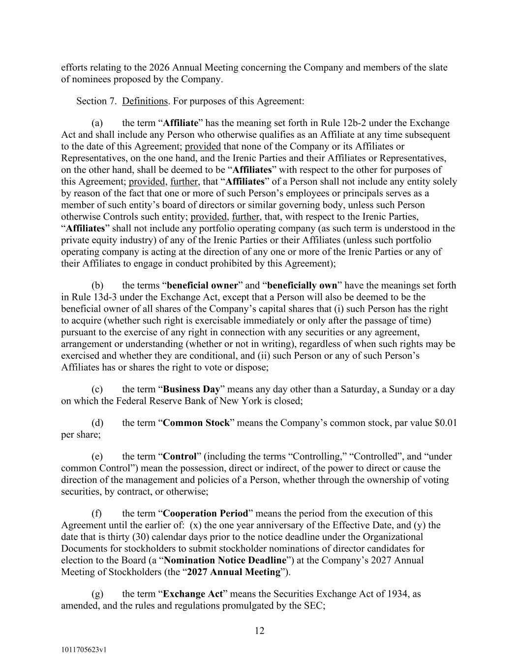12 1011705623v1 efforts relating to the 2026 Annual Meeting concerning the Company and members of the slate of nominees proposed by the Company. Section 7. Definitions. For purposes of this Agreement: (a) the term “Affiliate” has the meaning set forth in Rule 12b-2 under the Exchange Act and shall include any Person who otherwise qualifies as an Affiliate at any time subsequent to the date of this Agreement; provided that none of the Company or its Affiliates or Representatives, on the one hand, and the Irenic Parties and their Affiliates or Representatives, on the other hand, shall be deemed to be “Affiliates” with respect to the other for purposes of this Agreement; provided, further, that “Affiliates” of a Person shall not include any entity solely by reason of the fact that one or more of such Person’s employees or principals serves as a member of such entity’s board of directors or similar governing body, unless such Person otherwise Controls such entity; provided, further, that, with respect to the Irenic Parties, “Affiliates” shall not include any portfolio operating company (as such term is understood in the private equity industry) of any of the Irenic Parties or their Affiliates (unless such portfolio operating company is acting at the direction of any one or more of the Irenic Parties or any of their Affiliates to engage in conduct prohibited by this Agreement); (b) the terms “beneficial owner” and “beneficially own” have the meanings set forth in Rule 13d-3 under the Exchange Act, except that a Person will also be deemed to be the beneficial owner of all shares of the Company’s capital shares that (i) such Person has the right to acquire (whether such right is exercisable immediately or only after the passage of time) pursuant to the exercise of any right in connection with any securities or any agreement, arrangement or understanding (whether or not in writing), regardless of when such rights may be exercised and whether they are conditional, and (ii) such Person or any of such Person’s Affiliates has or shares the right to vote or dispose; (c) the term “Business Day” means any day other than a Saturday, a Sunday or a day on which the Federal Reserve Bank of New York is closed; (d) the term “Common Stock” means the Company’s common stock, par value $0.01 per share; (e) the term “Control” (including the terms “Controlling,” “Controlled”, and “under common Control”) mean the possession, direct or indirect, of the power to direct or cause the direction of the management and policies of a Person, whether through the ownership of voting securities, by contract, or otherwise; (f) the term “Cooperation Period” means the period from the execution of this Agreement until the earlier of: (x) the one year anniversary of the Effective Date, and (y) the date that is thirty (30) calendar days prior to the notice deadline under the Organizational Documents for stockholders to submit stockholder nominations of director candidates for election to the Board (a “Nomination Notice Deadline”) at the Company’s 2027 Annual Meeting of Stockholders (the “2027 Annual Meeting”). (g) the term “Exchange Act” means the Securities Exchange Act of 1934, as amended, and the rules and regulations promulgated by the SEC;