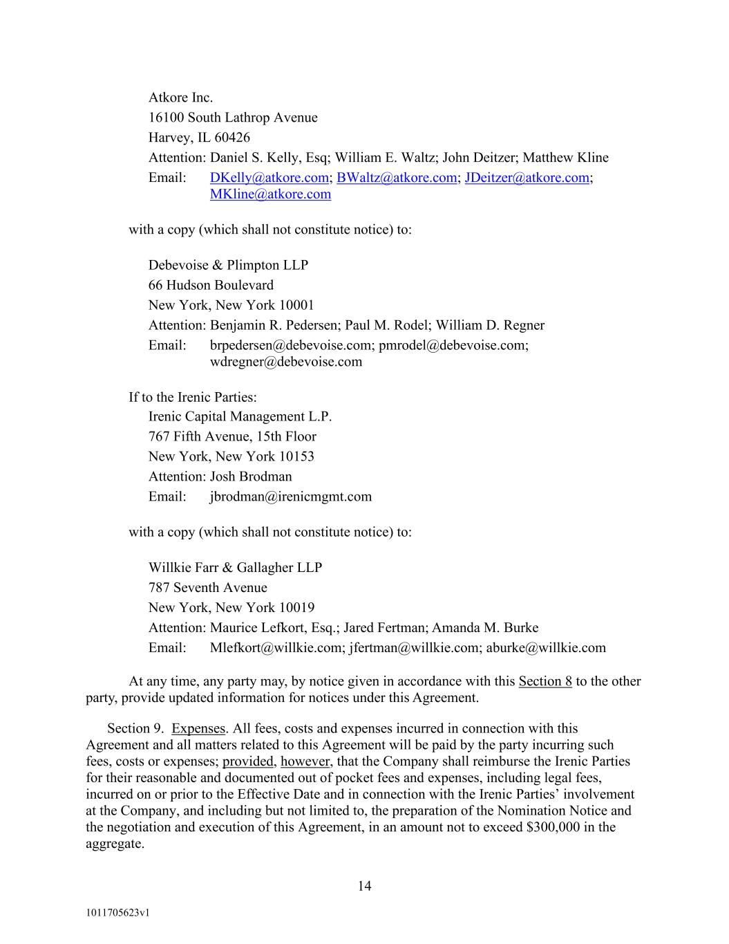 14 1011705623v1 Atkore Inc. 16100 South Lathrop Avenue Harvey, IL 60426 Attention: Daniel S. Kelly, Esq; William E. Waltz; John Deitzer; Matthew Kline Email: DKelly@atkore.com; BWaltz@atkore.com; JDeitzer@atkore.com; MKline@atkore.com with a copy (which shall not constitute notice) to: Debevoise & Plimpton LLP 66 Hudson Boulevard New York, New York 10001 Attention: Benjamin R. Pedersen; Paul M. Rodel; William D. Regner Email: brpedersen@debevoise.com; pmrodel@debevoise.com; wdregner@debevoise.com If to the Irenic Parties: Irenic Capital Management L.P. 767 Fifth Avenue, 15th Floor New York, New York 10153 Attention: Josh Brodman Email: jbrodman@irenicmgmt.com with a copy (which shall not constitute notice) to: Willkie Farr & Gallagher LLP 787 Seventh Avenue New York, New York 10019 Attention: Maurice Lefkort, Esq.; Jared Fertman; Amanda M. Burke Email: Mlefkort@willkie.com; jfertman@willkie.com; aburke@willkie.com At any time, any party may, by notice given in accordance with this Section 8 to the other party, provide updated information for notices under this Agreement. Section 9. Expenses. All fees, costs and expenses incurred in connection with this Agreement and all matters related to this Agreement will be paid by the party incurring such fees, costs or expenses; provided, however, that the Company shall reimburse the Irenic Parties for their reasonable and documented out of pocket fees and expenses, including legal fees, incurred on or prior to the Effective Date and in connection with the Irenic Parties’ involvement at the Company, and including but not limited to, the preparation of the Nomination Notice and the negotiation and execution of this Agreement, in an amount not to exceed $300,000 in the aggregate.