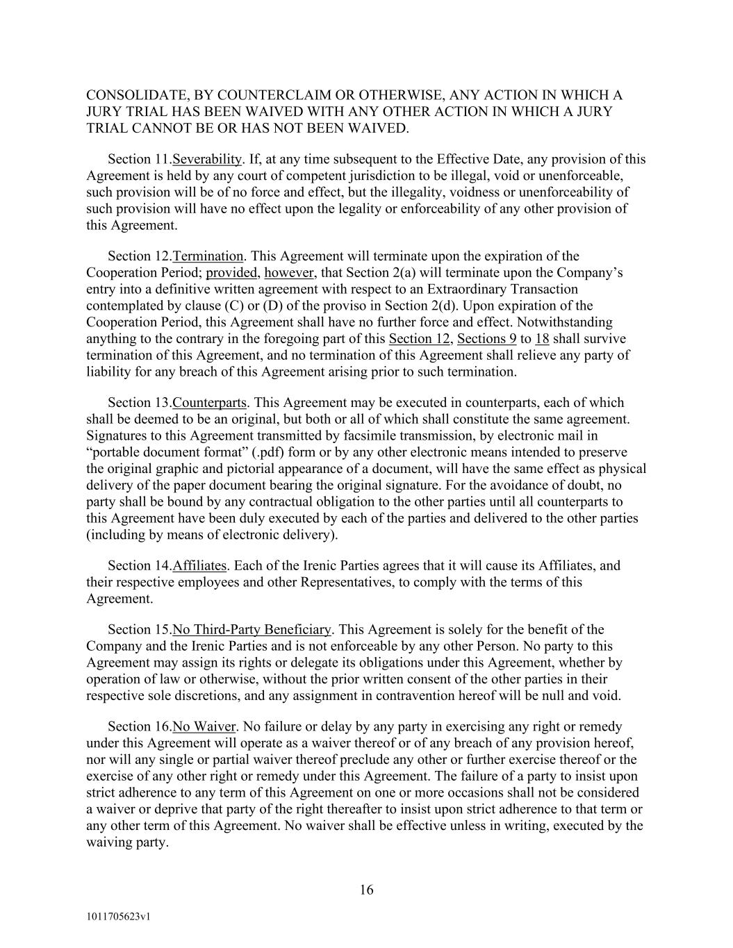 16 1011705623v1 CONSOLIDATE, BY COUNTERCLAIM OR OTHERWISE, ANY ACTION IN WHICH A JURY TRIAL HAS BEEN WAIVED WITH ANY OTHER ACTION IN WHICH A JURY TRIAL CANNOT BE OR HAS NOT BEEN WAIVED. Section 11.Severability. If, at any time subsequent to the Effective Date, any provision of this Agreement is held by any court of competent jurisdiction to be illegal, void or unenforceable, such provision will be of no force and effect, but the illegality, voidness or unenforceability of such provision will have no effect upon the legality or enforceability of any other provision of this Agreement. Section 12.Termination. This Agreement will terminate upon the expiration of the Cooperation Period; provided, however, that Section 2(a) will terminate upon the Company’s entry into a definitive written agreement with respect to an Extraordinary Transaction contemplated by clause (C) or (D) of the proviso in Section 2(d). Upon expiration of the Cooperation Period, this Agreement shall have no further force and effect. Notwithstanding anything to the contrary in the foregoing part of this Section 12, Sections 9 to 18 shall survive termination of this Agreement, and no termination of this Agreement shall relieve any party of liability for any breach of this Agreement arising prior to such termination. Section 13.Counterparts. This Agreement may be executed in counterparts, each of which shall be deemed to be an original, but both or all of which shall constitute the same agreement. Signatures to this Agreement transmitted by facsimile transmission, by electronic mail in “portable document format” (.pdf) form or by any other electronic means intended to preserve the original graphic and pictorial appearance of a document, will have the same effect as physical delivery of the paper document bearing the original signature. For the avoidance of doubt, no party shall be bound by any contractual obligation to the other parties until all counterparts to this Agreement have been duly executed by each of the parties and delivered to the other parties (including by means of electronic delivery). Section 14.Affiliates. Each of the Irenic Parties agrees that it will cause its Affiliates, and their respective employees and other Representatives, to comply with the terms of this Agreement. Section 15.No Third-Party Beneficiary. This Agreement is solely for the benefit of the Company and the Irenic Parties and is not enforceable by any other Person. No party to this Agreement may assign its rights or delegate its obligations under this Agreement, whether by operation of law or otherwise, without the prior written consent of the other parties in their respective sole discretions, and any assignment in contravention hereof will be null and void. Section 16.No Waiver. No failure or delay by any party in exercising any right or remedy under this Agreement will operate as a waiver thereof or of any breach of any provision hereof, nor will any single or partial waiver thereof preclude any other or further exercise thereof or the exercise of any other right or remedy under this Agreement. The failure of a party to insist upon strict adherence to any term of this Agreement on one or more occasions shall not be considered a waiver or deprive that party of the right thereafter to insist upon strict adherence to that term or any other term of this Agreement. No waiver shall be effective unless in writing, executed by the waiving party.