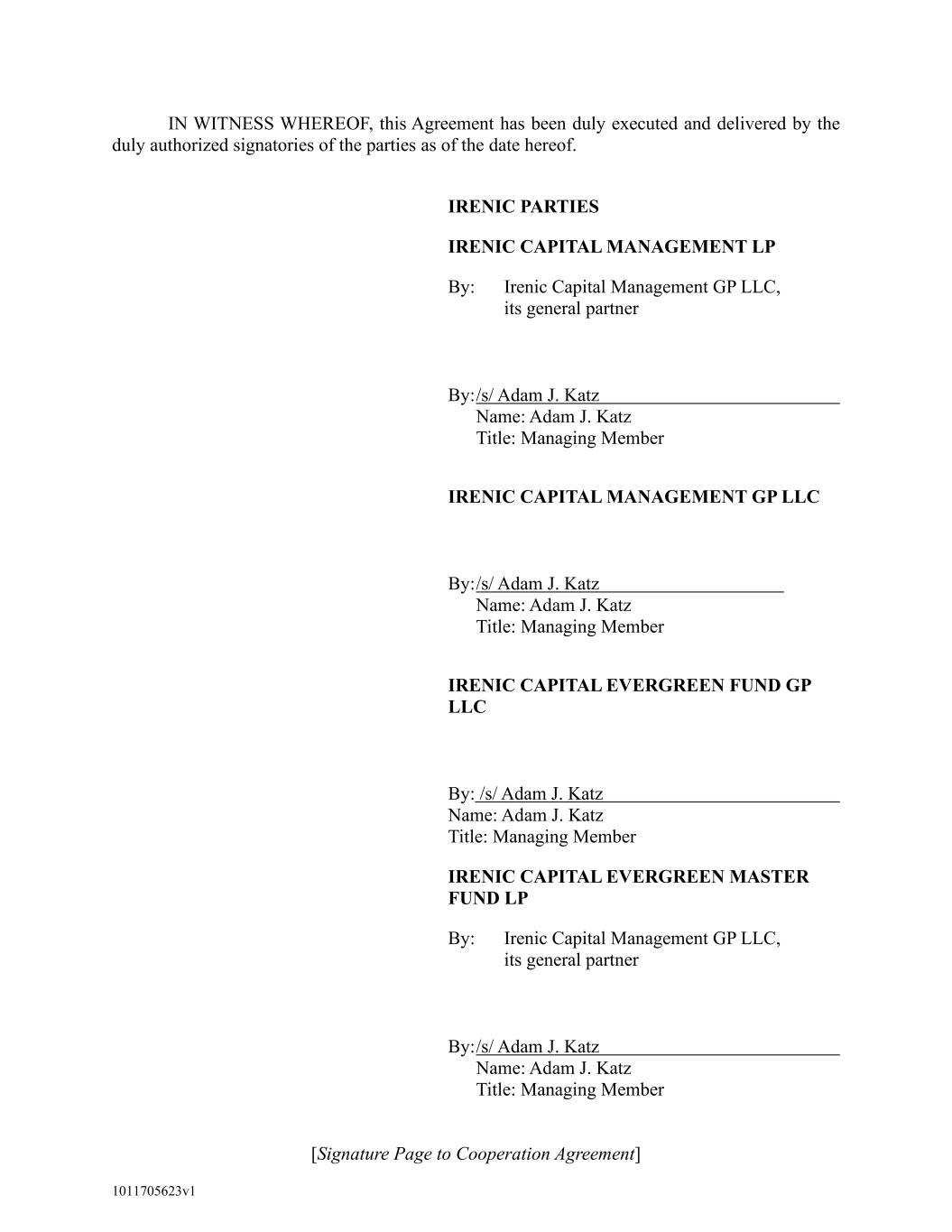 [Signature Page to Cooperation Agreement] 1011705623v1 IN WITNESS WHEREOF, this Agreement has been duly executed and delivered by the duly authorized signatories of the parties as of the date hereof. IRENIC PARTIES IRENIC CAPITAL MANAGEMENT LP By: Irenic Capital Management GP LLC, its general partner By: /s/ Adam J. Katz Name: Adam J. Katz Title: Managing Member IRENIC CAPITAL MANAGEMENT GP LLC By: /s/ Adam J. Katz Name: Adam J. Katz Title: Managing Member IRENIC CAPITAL EVERGREEN FUND GP LLC By: /s/ Adam J. Katz Name: Adam J. Katz Title: Managing Member IRENIC CAPITAL EVERGREEN MASTER FUND LP By: Irenic Capital Management GP LLC, its general partner By: /s/ Adam J. Katz Name: Adam J. Katz Title: Managing Member