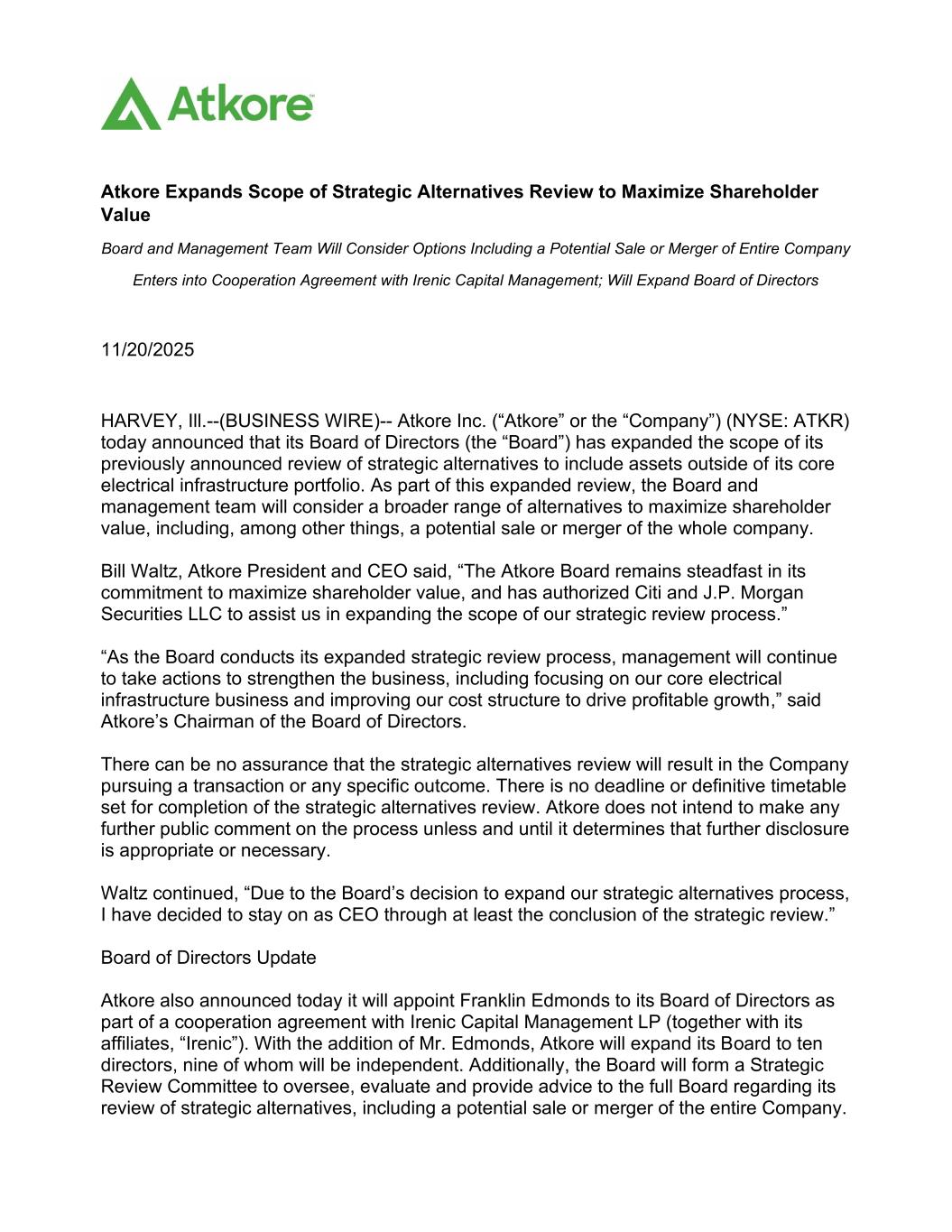 Atkore Expands Scope of Strategic Alternatives Review to Maximize Shareholder Value Board and Management Team Will Consider Options Including a Potential Sale or Merger of Entire Company Enters into Cooperation Agreement with Irenic Capital Management; Will Expand Board of Directors 11/20/2025 HARVEY, Ill.--(BUSINESS WIRE)-- Atkore Inc. (“Atkore” or the “Company”) (NYSE: ATKR) today announced that its Board of Directors (the “Board”) has expanded the scope of its previously announced review of strategic alternatives to include assets outside of its core electrical infrastructure portfolio. As part of this expanded review, the Board and management team will consider a broader range of alternatives to maximize shareholder value, including, among other things, a potential sale or merger of the whole company. Bill Waltz, Atkore President and CEO said, “The Atkore Board remains steadfast in its commitment to maximize shareholder value, and has authorized Citi and J.P. Morgan Securities LLC to assist us in expanding the scope of our strategic review process.” “As the Board conducts its expanded strategic review process, management will continue to take actions to strengthen the business, including focusing on our core electrical infrastructure business and improving our cost structure to drive profitable growth,” said Atkore’s Chairman of the Board of Directors. There can be no assurance that the strategic alternatives review will result in the Company pursuing a transaction or any specific outcome. There is no deadline or definitive timetable set for completion of the strategic alternatives review. Atkore does not intend to make any further public comment on the process unless and until it determines that further disclosure is appropriate or necessary. Waltz continued, “Due to the Board’s decision to expand our strategic alternatives process, I have decided to stay on as CEO through at least the conclusion of the strategic review.” Board of Directors Update Atkore also announced today it will appoint Franklin Edmonds to its Board of Directors as part of a cooperation agreement with Irenic Capital Management LP (together with its affiliates, “Irenic”). With the addition of Mr. Edmonds, Atkore will expand its Board to ten directors, nine of whom will be independent. Additionally, the Board will form a Strategic Review Committee to oversee, evaluate and provide advice to the full Board regarding its review of strategic alternatives, including a potential sale or merger of the entire Company.