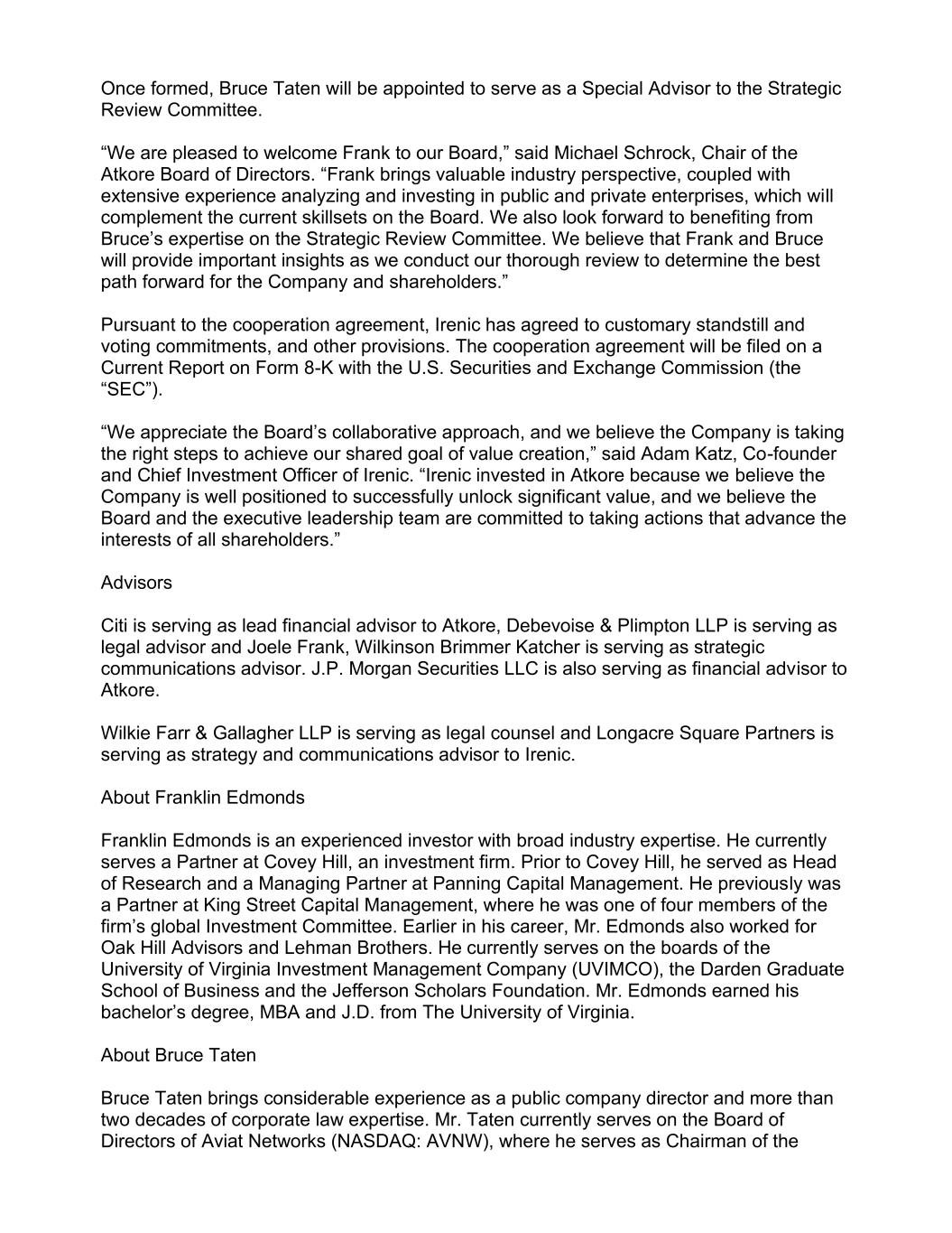 Once formed, Bruce Taten will be appointed to serve as a Special Advisor to the Strategic Review Committee. “We are pleased to welcome Frank to our Board,” said Michael Schrock, Chair of the Atkore Board of Directors. “Frank brings valuable industry perspective, coupled with extensive experience analyzing and investing in public and private enterprises, which will complement the current skillsets on the Board. We also look forward to benefiting from Bruce’s expertise on the Strategic Review Committee. We believe that Frank and Bruce will provide important insights as we conduct our thorough review to determine the best path forward for the Company and shareholders.” Pursuant to the cooperation agreement, Irenic has agreed to customary standstill and voting commitments, and other provisions. The cooperation agreement will be filed on a Current Report on Form 8-K with the U.S. Securities and Exchange Commission (the “SEC”). “We appreciate the Board’s collaborative approach, and we believe the Company is taking the right steps to achieve our shared goal of value creation,” said Adam Katz, Co-founder and Chief Investment Officer of Irenic. “Irenic invested in Atkore because we believe the Company is well positioned to successfully unlock significant value, and we believe the Board and the executive leadership team are committed to taking actions that advance the interests of all shareholders.” Advisors Citi is serving as lead financial advisor to Atkore, Debevoise & Plimpton LLP is serving as legal advisor and Joele Frank, Wilkinson Brimmer Katcher is serving as strategic communications advisor. J.P. Morgan Securities LLC is also serving as financial advisor to Atkore. Wilkie Farr & Gallagher LLP is serving as legal counsel and Longacre Square Partners is serving as strategy and communications advisor to Irenic. About Franklin Edmonds Franklin Edmonds is an experienced investor with broad industry expertise. He currently serves a Partner at Covey Hill, an investment firm. Prior to Covey Hill, he served as Head of Research and a Managing Partner at Panning Capital Management. He previously was a Partner at King Street Capital Management, where he was one of four members of the firm’s global Investment Committee. Earlier in his career, Mr. Edmonds also worked for Oak Hill Advisors and Lehman Brothers. He currently serves on the boards of the University of Virginia Investment Management Company (UVIMCO), the Darden Graduate School of Business and the Jefferson Scholars Foundation. Mr. Edmonds earned his bachelor’s degree, MBA and J.D. from The University of Virginia. About Bruce Taten Bruce Taten brings considerable experience as a public company director and more than two decades of corporate law expertise. Mr. Taten currently serves on the Board of Directors of Aviat Networks (NASDAQ: AVNW), where he serves as Chairman of the
