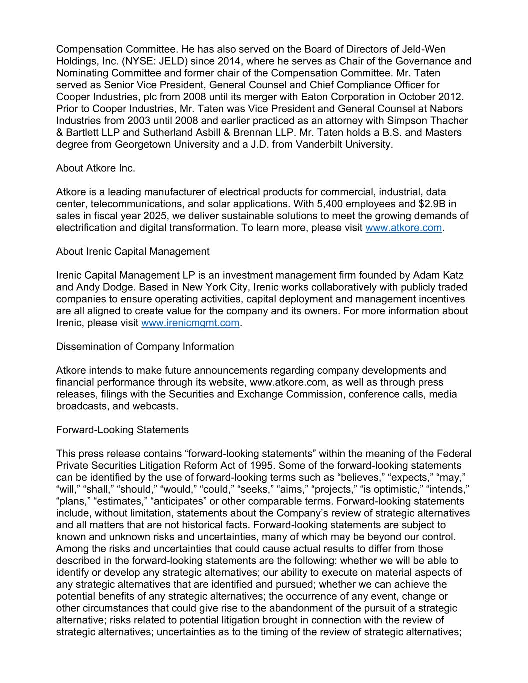 Compensation Committee. He has also served on the Board of Directors of Jeld-Wen Holdings, Inc. (NYSE: JELD) since 2014, where he serves as Chair of the Governance and Nominating Committee and former chair of the Compensation Committee. Mr. Taten served as Senior Vice President, General Counsel and Chief Compliance Officer for Cooper Industries, plc from 2008 until its merger with Eaton Corporation in October 2012. Prior to Cooper Industries, Mr. Taten was Vice President and General Counsel at Nabors Industries from 2003 until 2008 and earlier practiced as an attorney with Simpson Thacher & Bartlett LLP and Sutherland Asbill & Brennan LLP. Mr. Taten holds a B.S. and Masters degree from Georgetown University and a J.D. from Vanderbilt University. About Atkore Inc. Atkore is a leading manufacturer of electrical products for commercial, industrial, data center, telecommunications, and solar applications. With 5,400 employees and $2.9B in sales in fiscal year 2025, we deliver sustainable solutions to meet the growing demands of electrification and digital transformation. To learn more, please visit www.atkore.com. About Irenic Capital Management Irenic Capital Management LP is an investment management firm founded by Adam Katz and Andy Dodge. Based in New York City, Irenic works collaboratively with publicly traded companies to ensure operating activities, capital deployment and management incentives are all aligned to create value for the company and its owners. For more information about Irenic, please visit www.irenicmgmt.com. Dissemination of Company Information Atkore intends to make future announcements regarding company developments and financial performance through its website, www.atkore.com, as well as through press releases, filings with the Securities and Exchange Commission, conference calls, media broadcasts, and webcasts. Forward-Looking Statements This press release contains “forward-looking statements” within the meaning of the Federal Private Securities Litigation Reform Act of 1995. Some of the forward-looking statements can be identified by the use of forward-looking terms such as “believes,” “expects,” “may,” “will,” “shall,” “should,” “would,” “could,” “seeks,” “aims,” “projects,” “is optimistic,” “intends,” “plans,” “estimates,” “anticipates” or other comparable terms. Forward-looking statements include, without limitation, statements about the Company’s review of strategic alternatives and all matters that are not historical facts. Forward-looking statements are subject to known and unknown risks and uncertainties, many of which may be beyond our control. Among the risks and uncertainties that could cause actual results to differ from those described in the forward-looking statements are the following: whether we will be able to identify or develop any strategic alternatives; our ability to execute on material aspects of any strategic alternatives that are identified and pursued; whether we can achieve the potential benefits of any strategic alternatives; the occurrence of any event, change or other circumstances that could give rise to the abandonment of the pursuit of a strategic alternative; risks related to potential litigation brought in connection with the review of strategic alternatives; uncertainties as to the timing of the review of strategic alternatives;